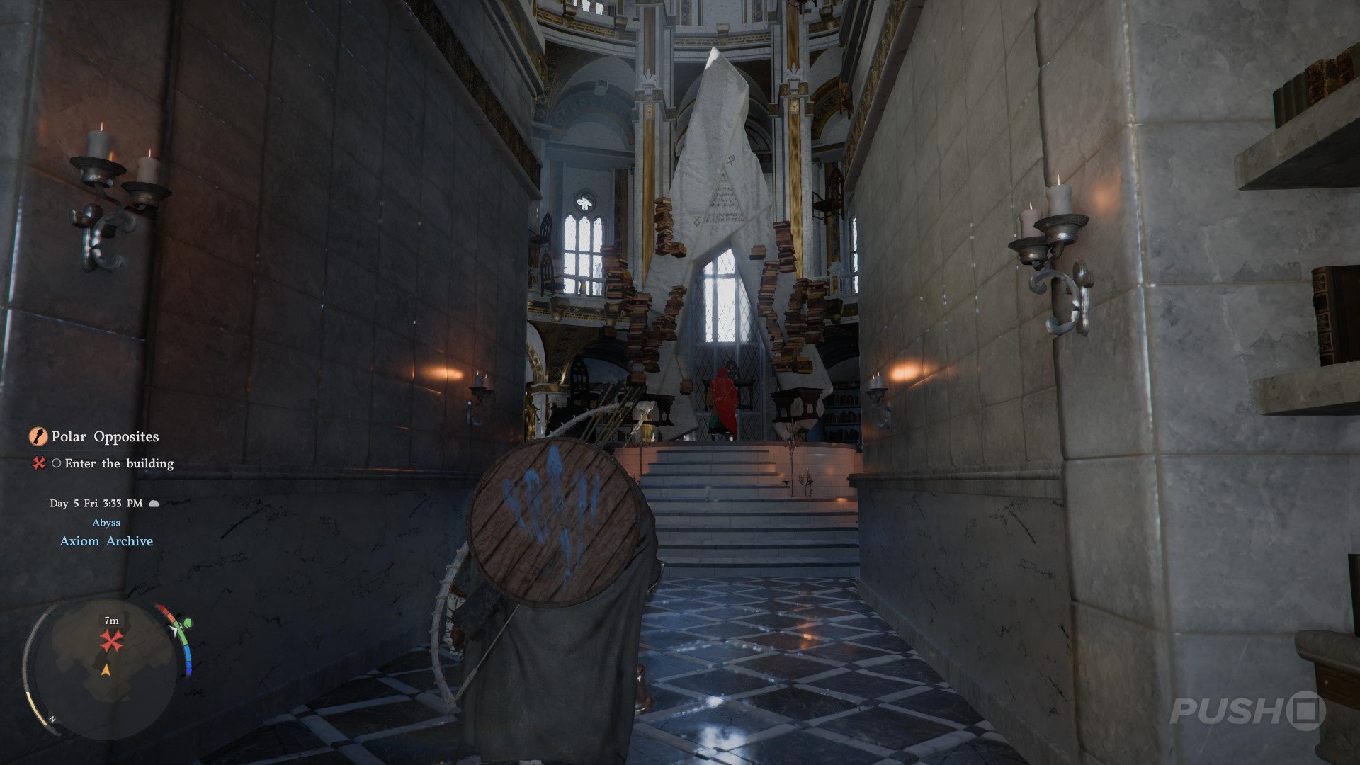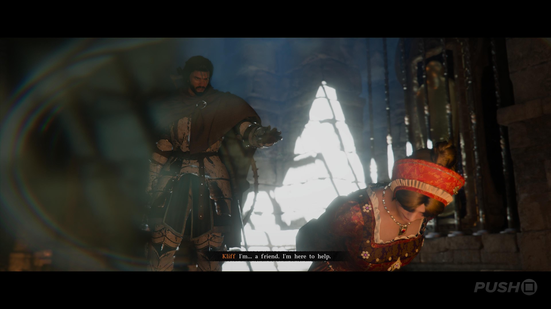 Without any context or narrative reasoning, you're then told to "enter a tavern to gather information". The only thing you can do is take part in an arm wrestling contest, and you never gather anything close to resembling information. Next, the objective tells you to give a coin to a beggar, then head into the sewer via the grate he was lying on, and then untie a woman you find down there. She disappears into thin air, having given you a letter.