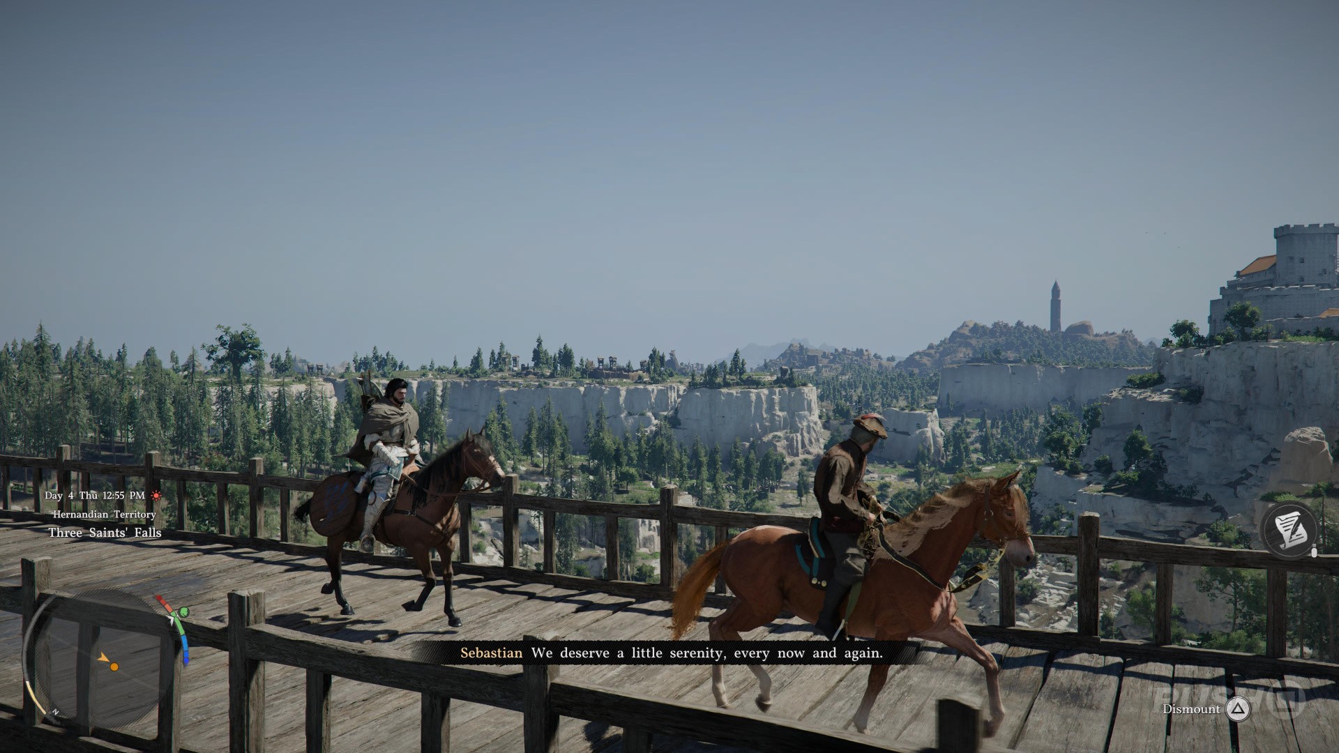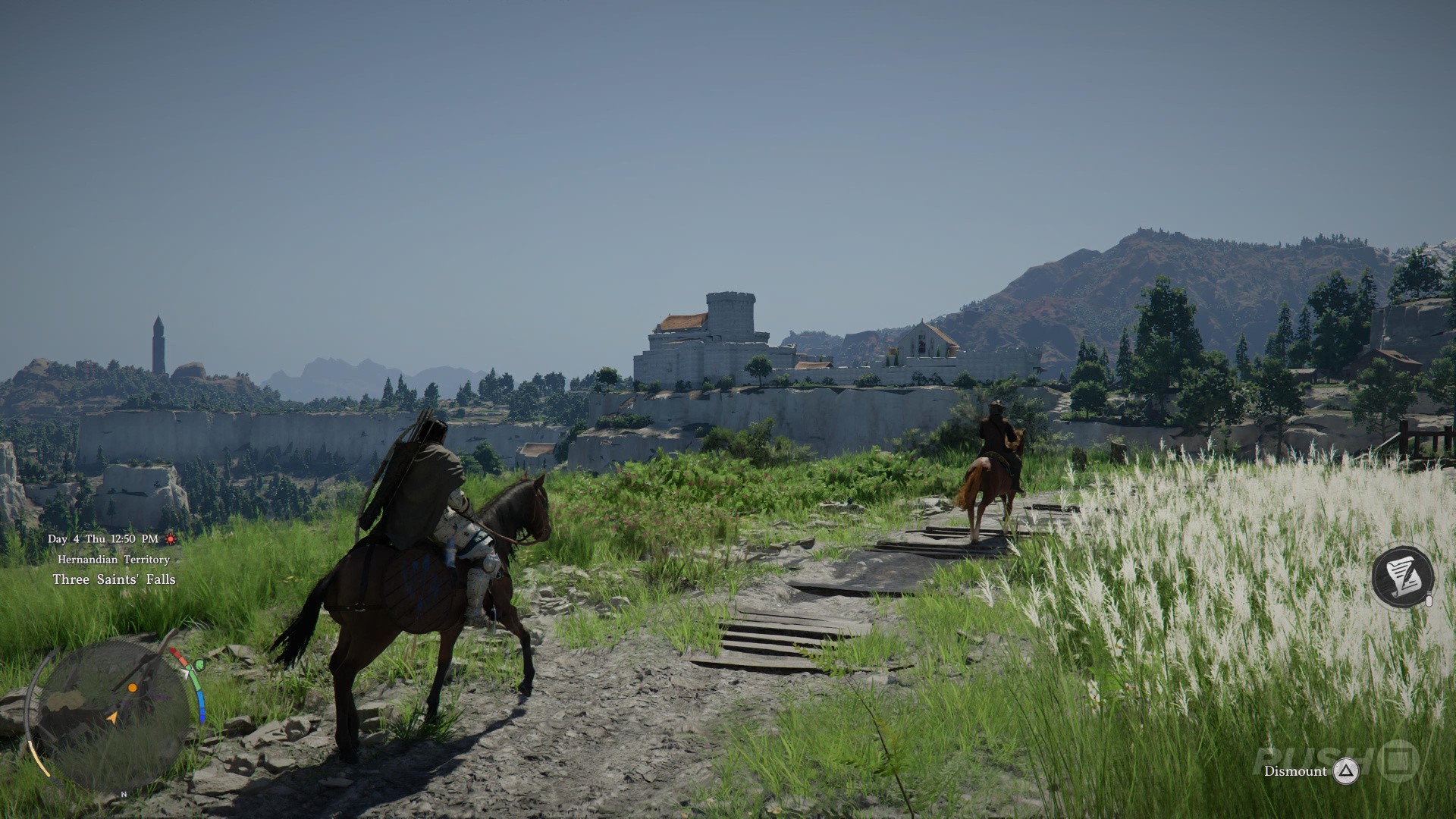 A man helps you get back on your feet with a horse, and the two of you ride into the town of Hernand.