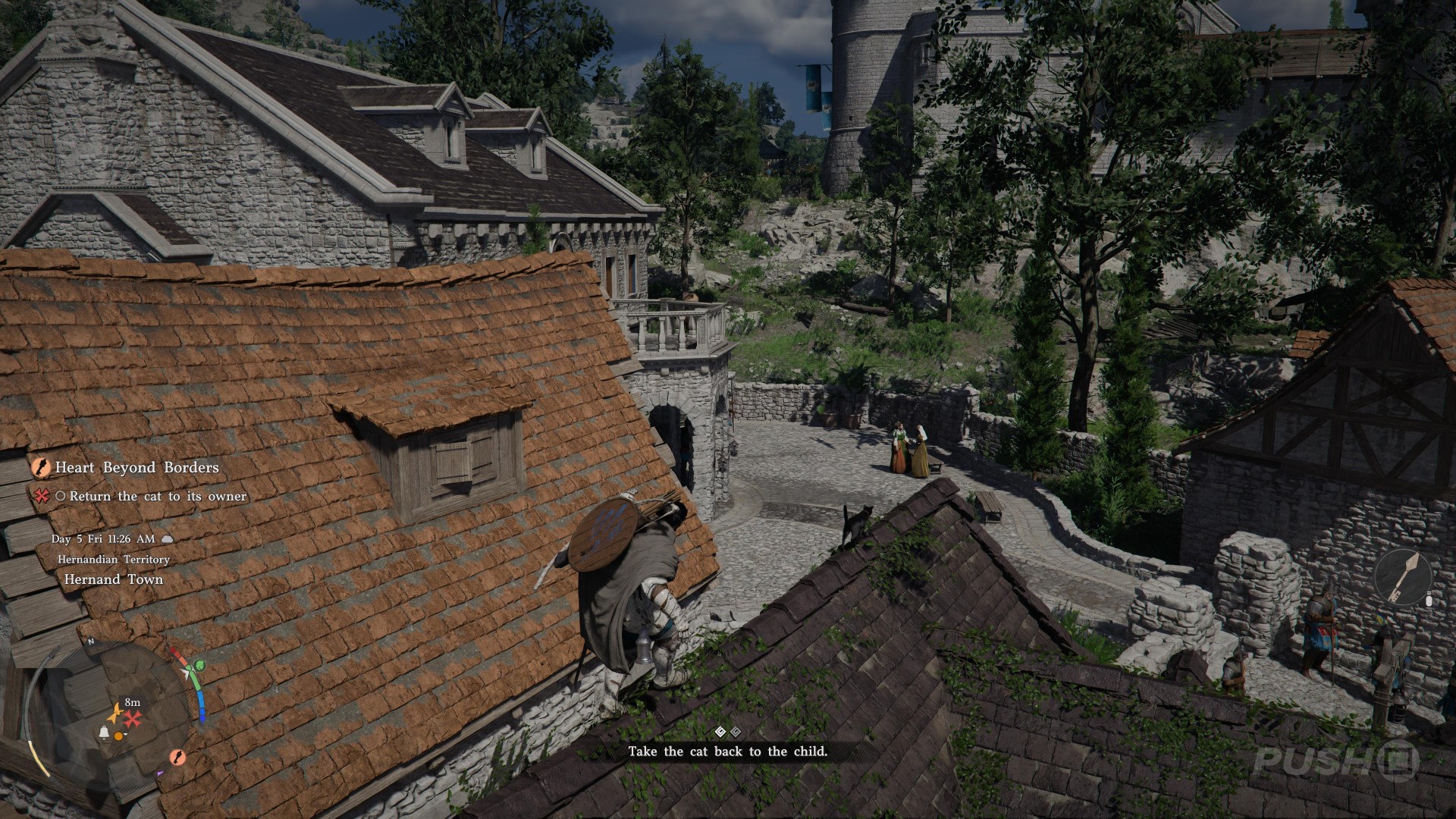 While you are still underground in the sewer, the objective updates to tell you to rescue a cat on top of a house. There's absolutely no connective tissue between these tasks; you're not told to go and complete them by an NPC after each one. They just randomly appear, like open world events or side quests, bizarrely stitched together to form the basis of a basic mission.