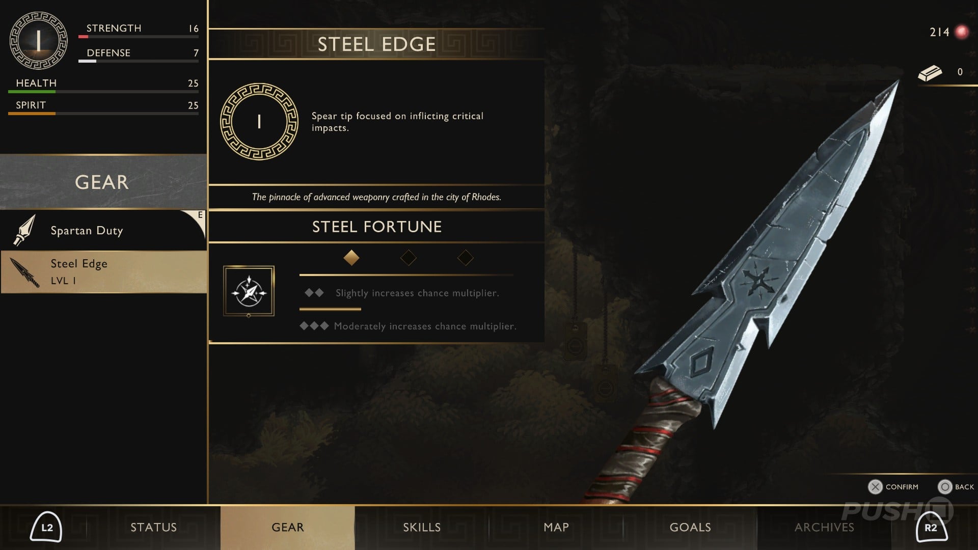 Equipped with a spear and shield, you begin with a basic three-hit combo, a block/parry, and a dodge. Enemies have both health and stun meters, and after a short while, you unlock Brutal Kills, which finish them off when fully stunned.