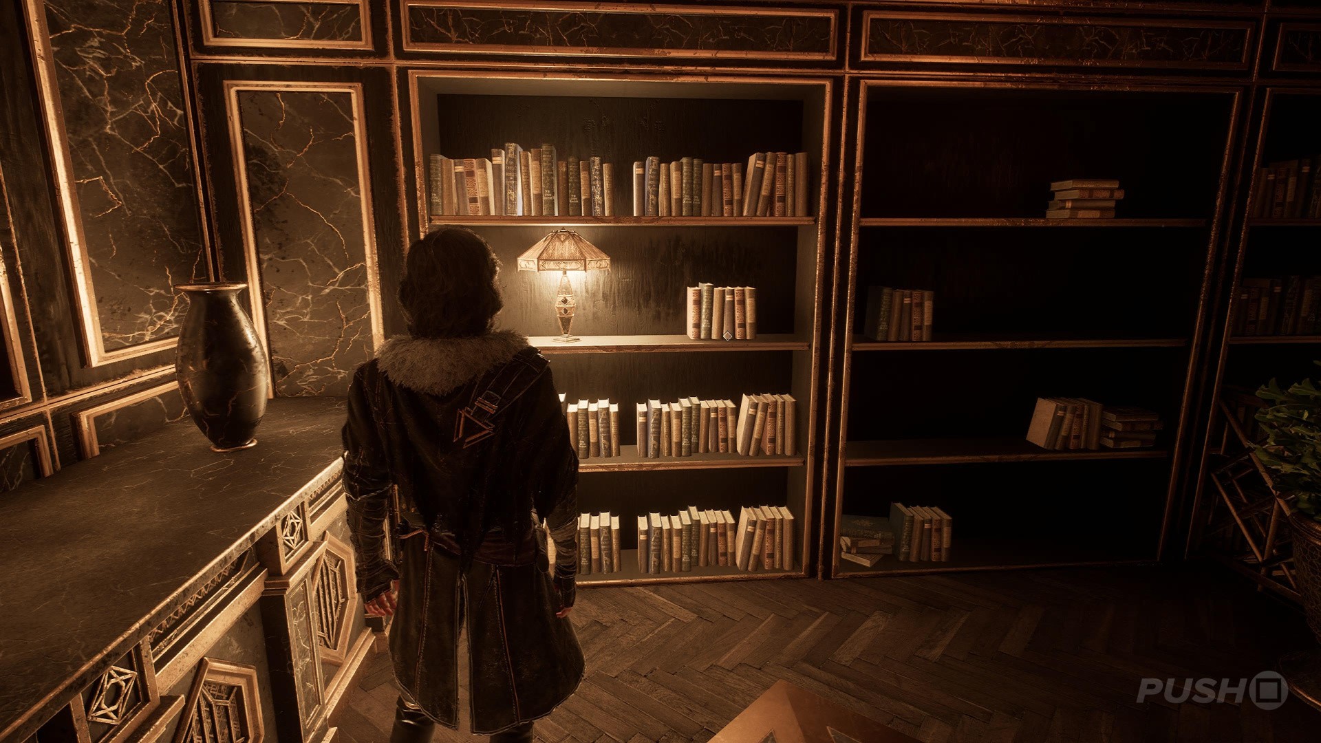 - Go inside, up the winding staircase, and interact with the books on the back wall