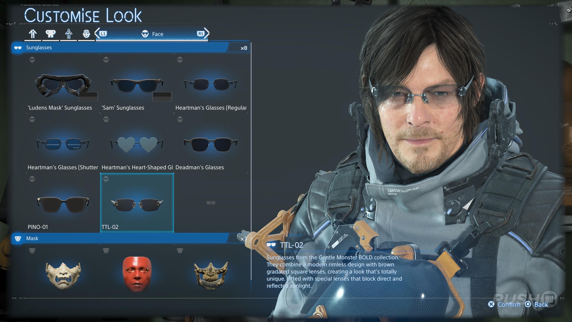 You can equip Glasses and Masks from any Private Room by panning the camera over to your Backpack and selecting Customise Look. From there, you can equip a new pair of Glasses or put on a Mask. From here, you could also change your Suit and put on a new Hat or Hood. Below you'll find all Glasses, Masks and how to get them in Death Stranding 2.
