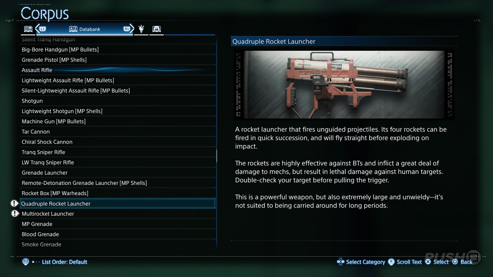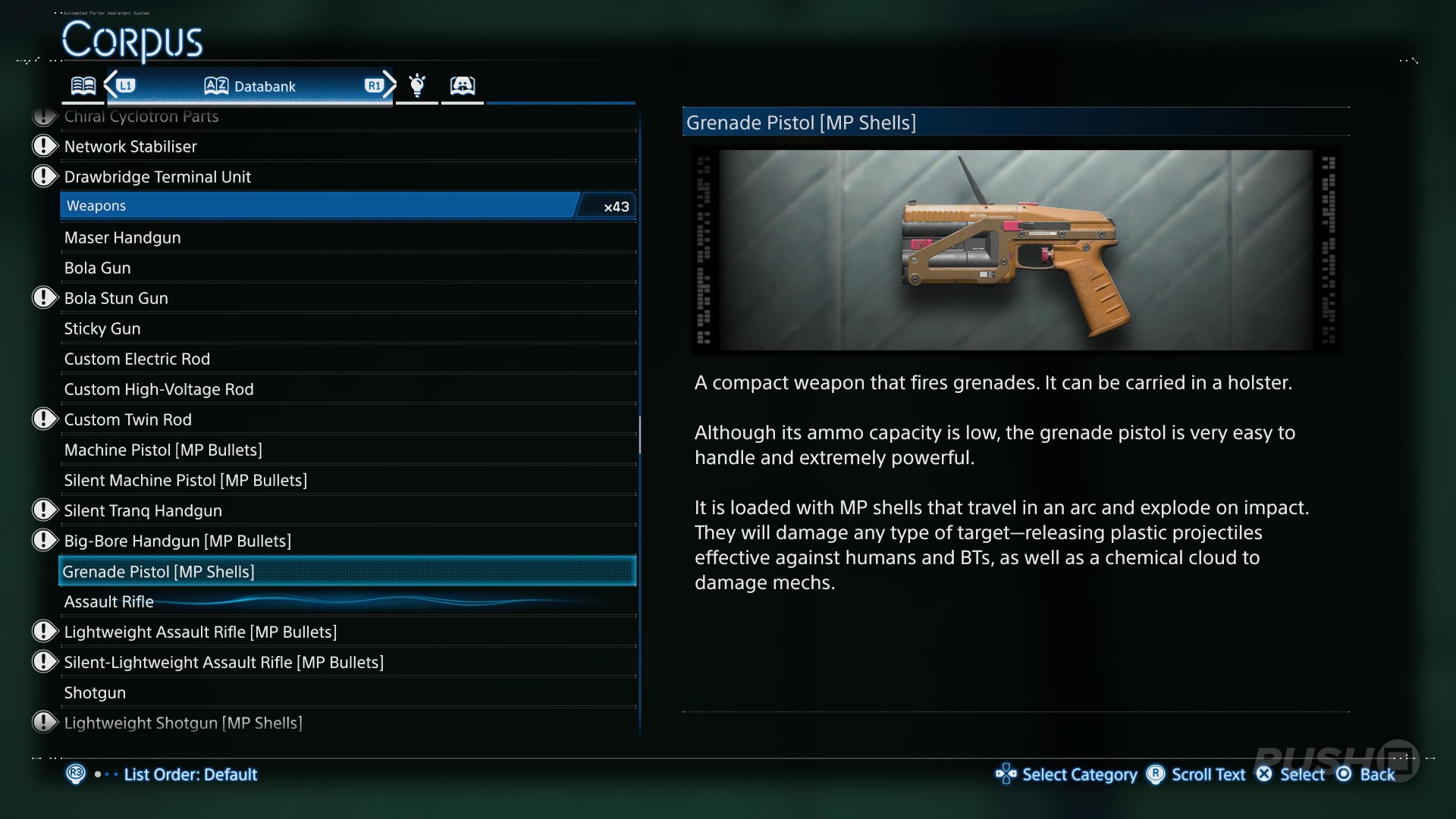 A grenade launcher loaded with adhesive MP shells effective against any target. The grenades stick to their target on impact, and can be detonated remotely, damaging all enemies caught in the blast.