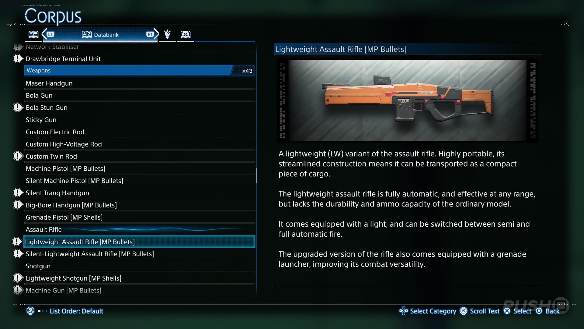 A lightweight (LW) variant of the MP bullet assault rifle, capable of being sorted as an S-sized piece of cargo. Armed with MP bullets effective against any target, the rifle also comes equipped with a light, a dot sight, and has three modes of fire: semi-auto, full-auto, and burst.