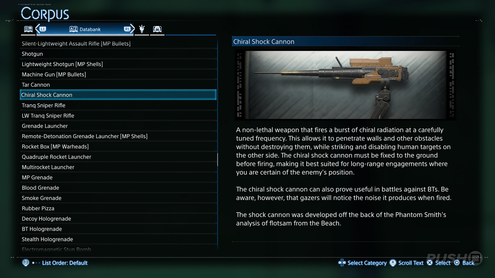 A weapon that fires chiral particles at a special wavelength. Firing the cannon consumes chiral crystals. Although extremely noisy, the chiral particles can penetrate walls to knock human targets unconscious and inflict significant damage on BTs and mechs. The cannon's powerful recoil means it must be fixed in place before firing.