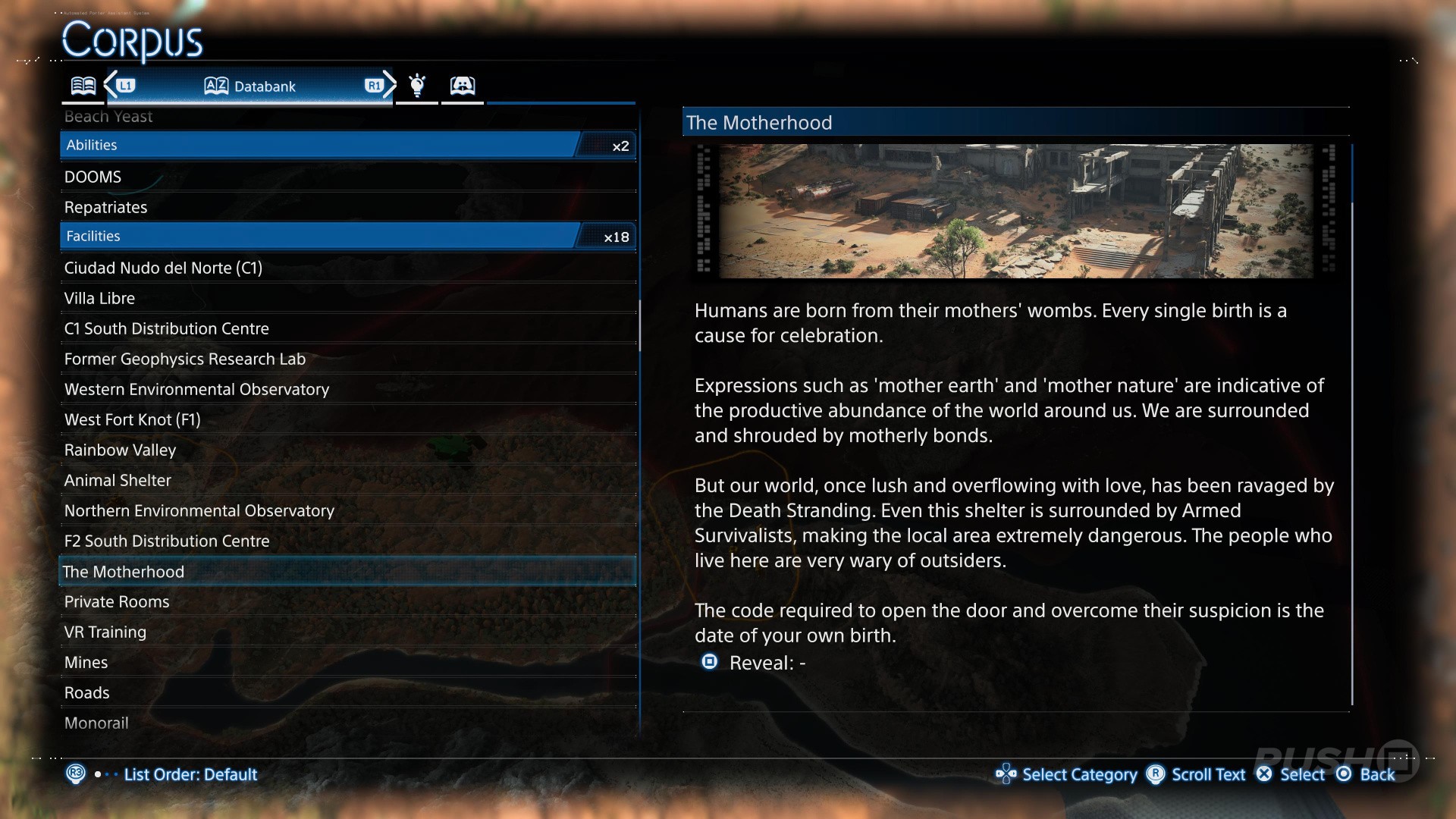 When you reach The Motherhood base, you must enter a passcode to go inside. Searching around outside will not yield any results, so how do you work out the password? Dollman will eventually drop hints for you, but to work it out quickly, you need to look through the Corpus. Select the Databank list and scroll down to The Motherhood entry, under Facilities.