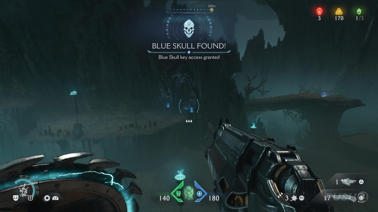- In the same area you pick it up, drop down off the ledge and approach the gate up to the left that requires the Blue Skull