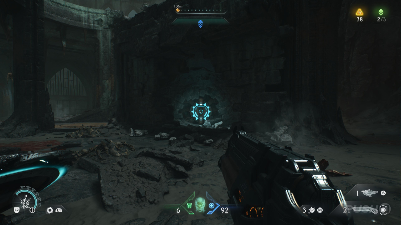 - At the bottom, you can Shield Charge through a wall to reveal a blue gear icon you can throw your shield at
