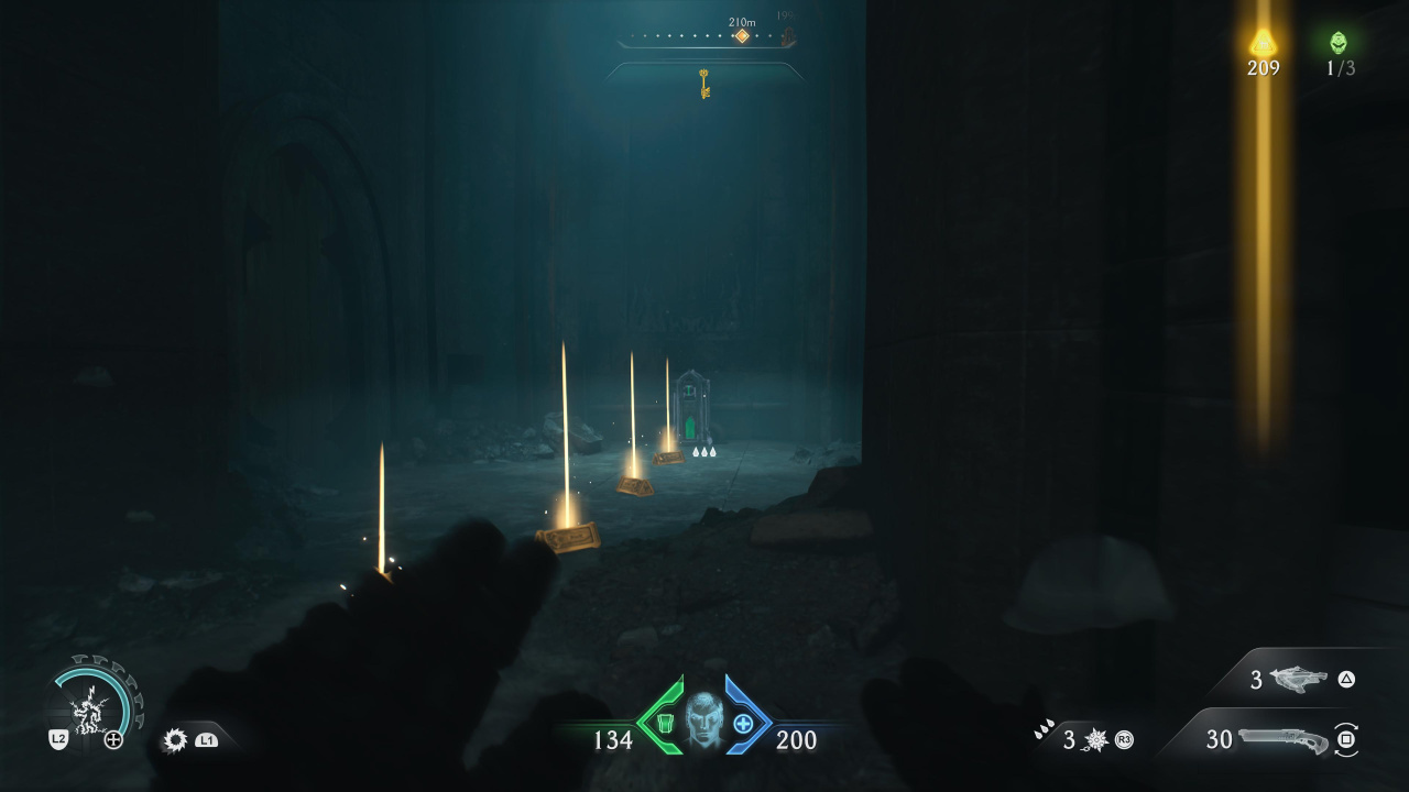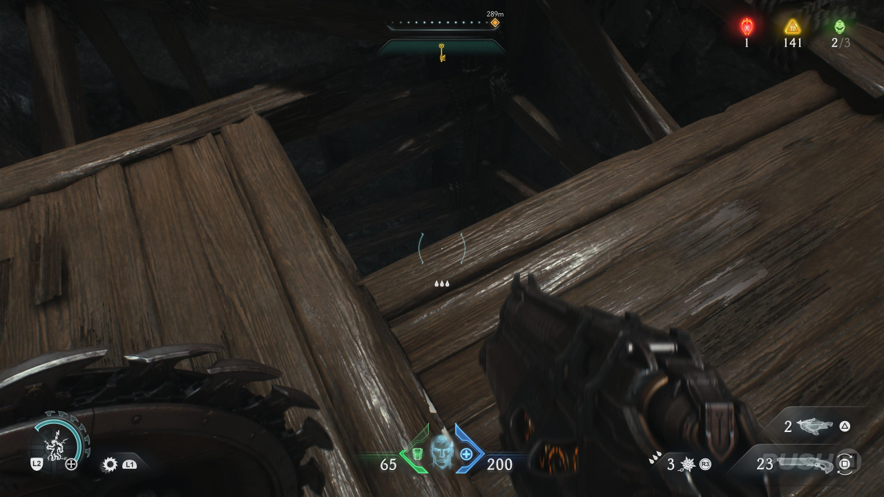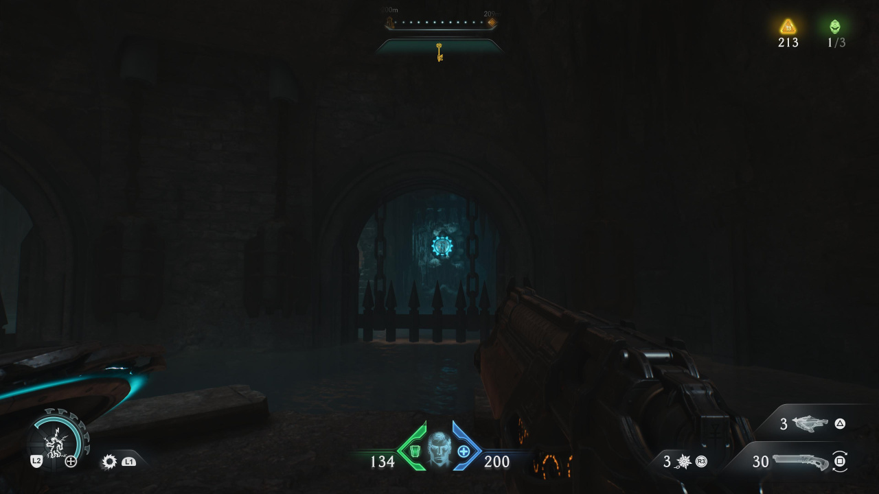 - Return to the surface and throw your shield at the blue gear icon to move the gates in front of you