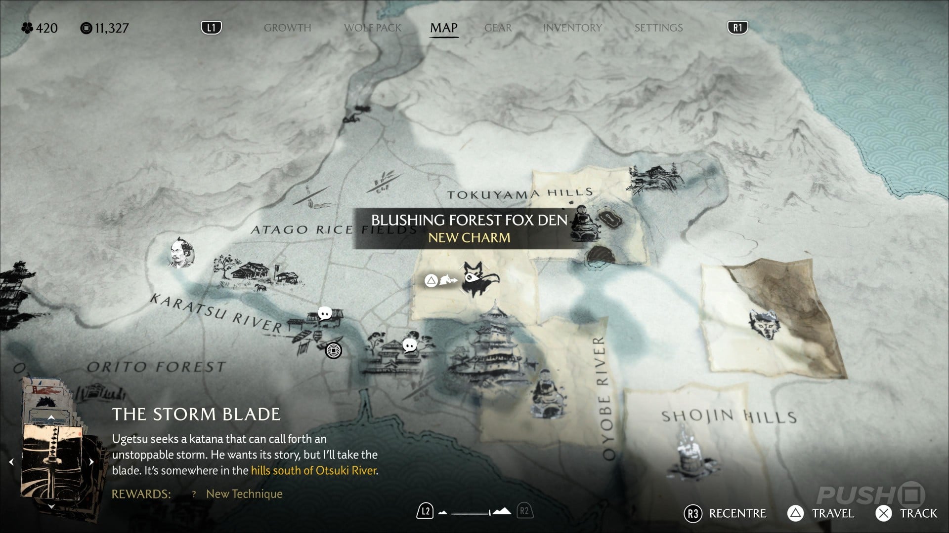 There are 11 Fox Dens and Inari Shrines to find in the game. You begin by finding a Fox Den, which is always a raised mound of earth with a red tree on top. You then follow the fox to the Inari Shrine and pray at it to receive the Charm. On the map, a Fox Den icon will take the shape of a fox's face, and you can only find them through open world exploration or by purchasing Traveller's Maps.