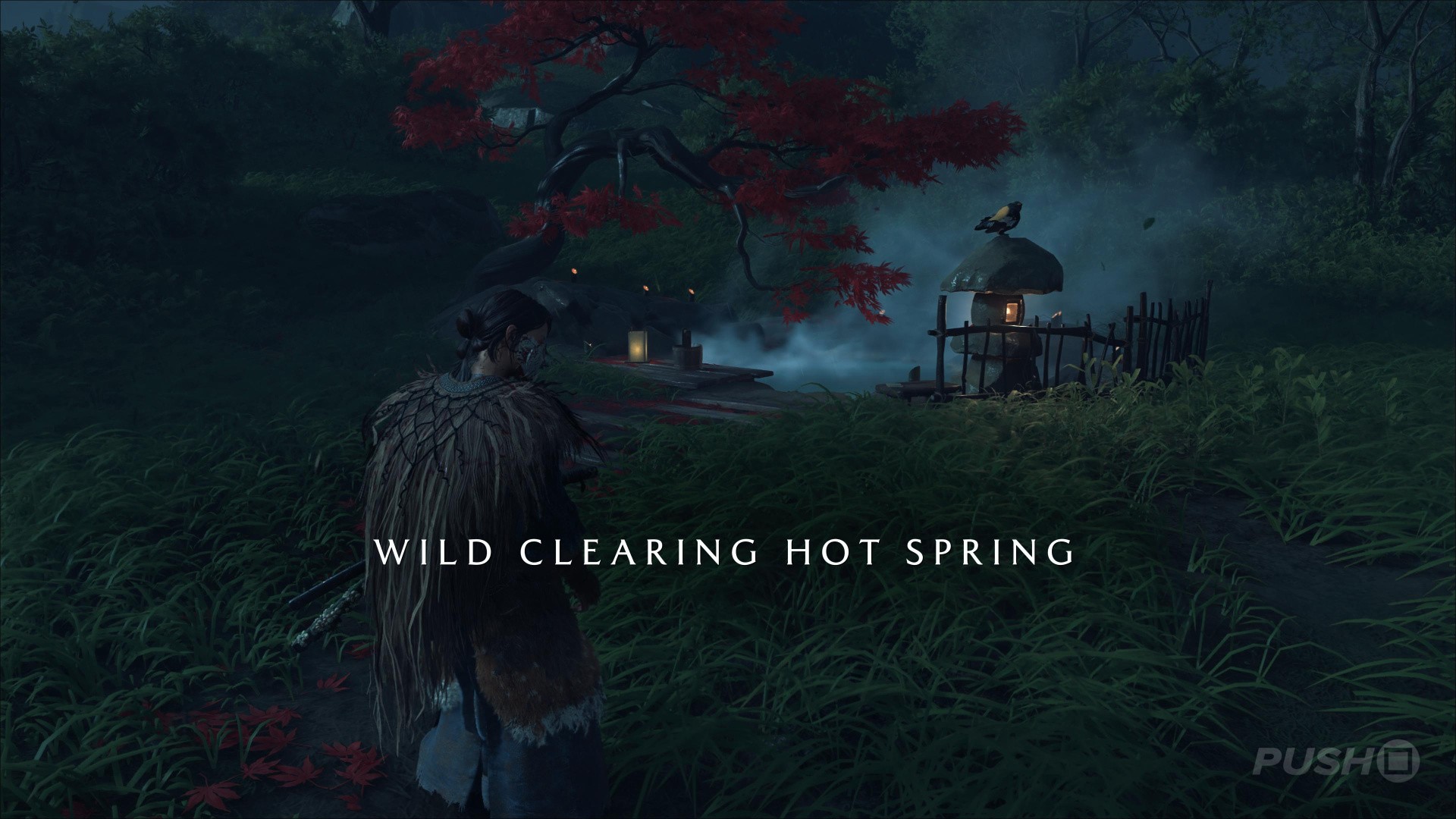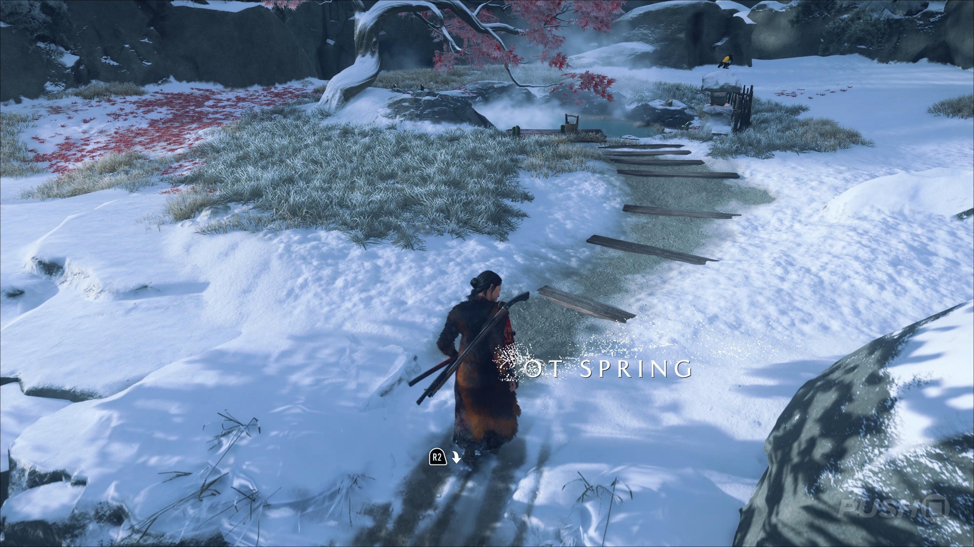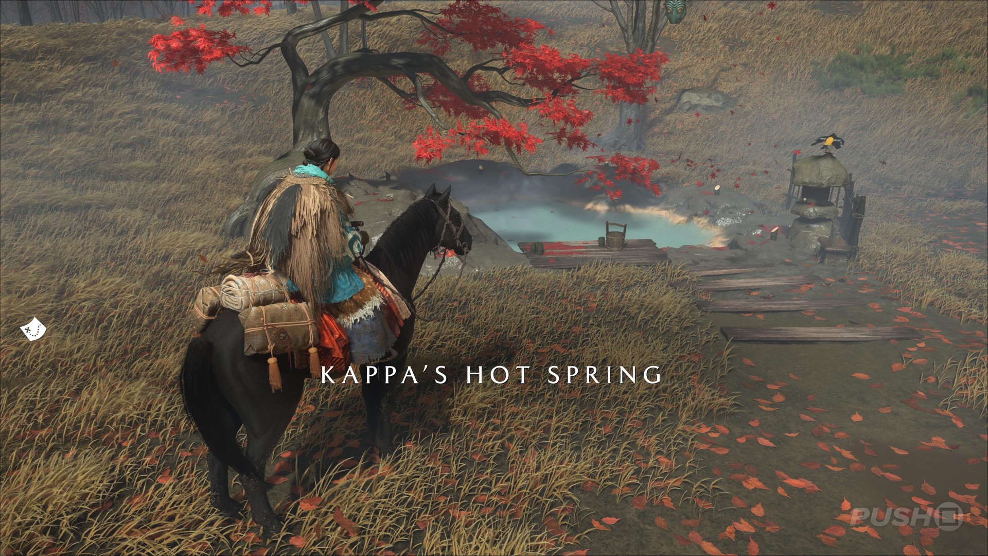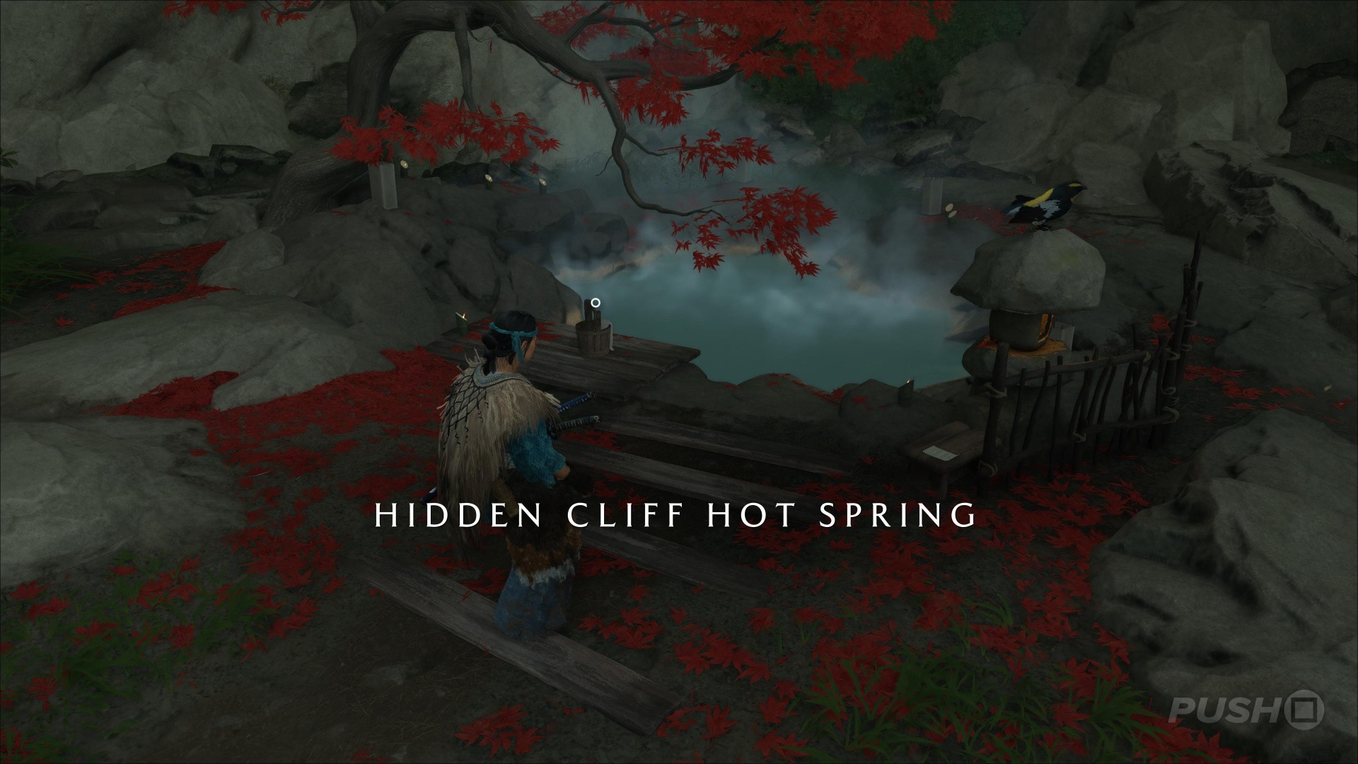 - Northeast of Yotei's Shadow Inn, you can climb up a cliff and find this Hot Spring at the top