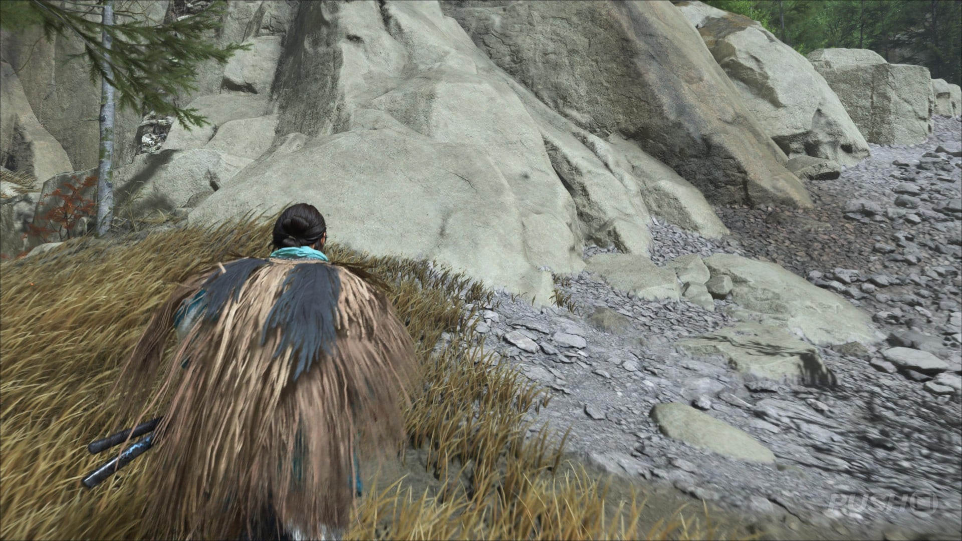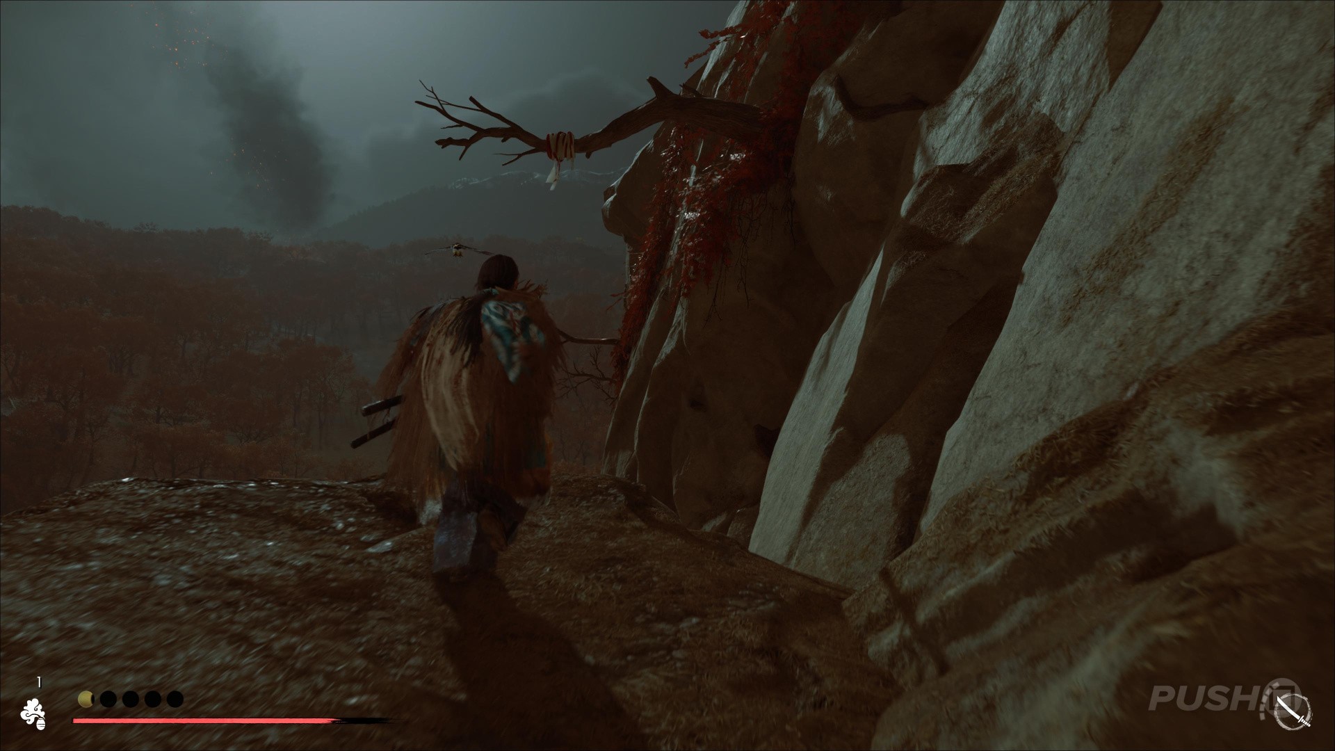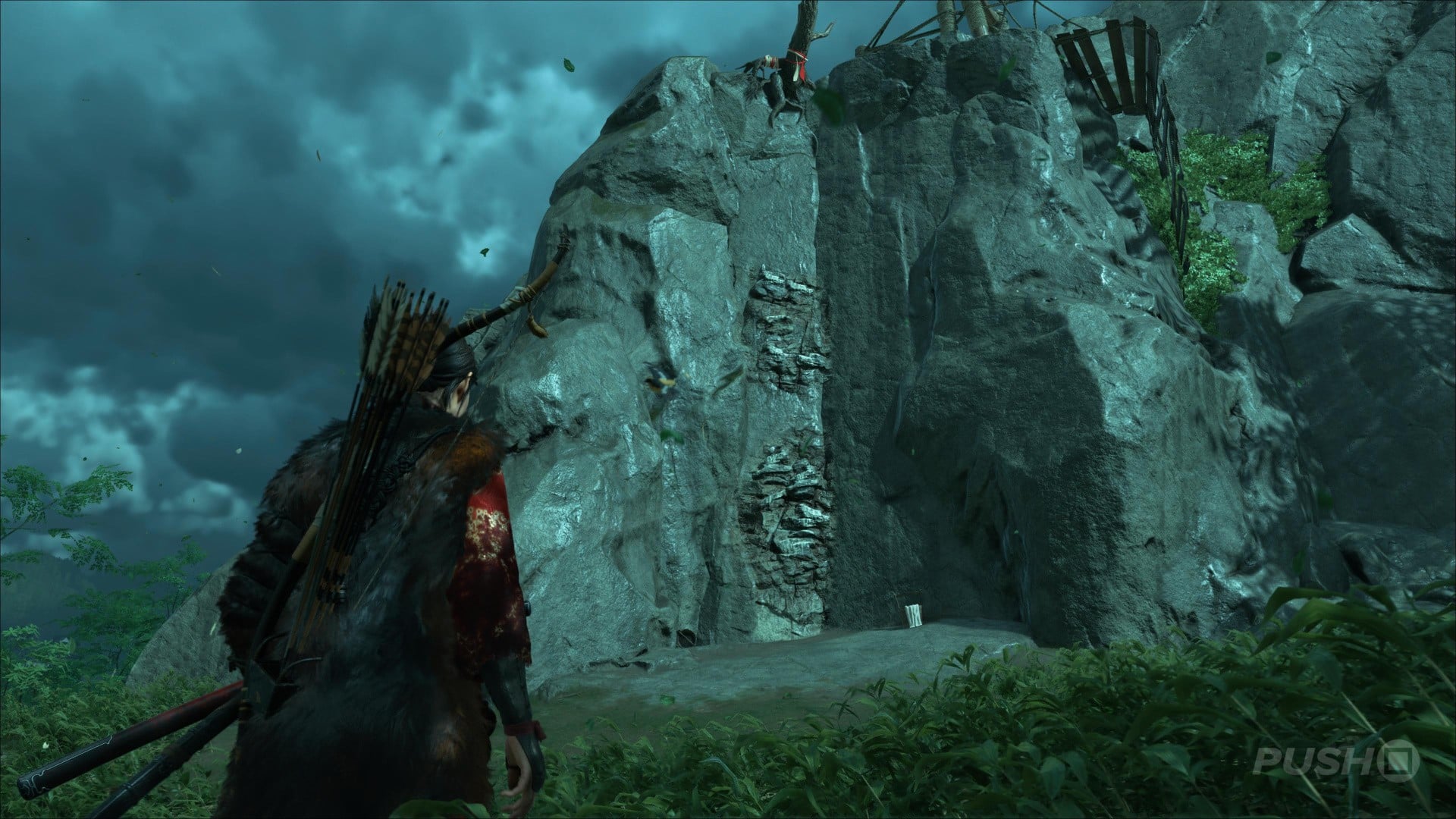 - In the southwestern corner of the region, search the Crimson Forest for a large rock you can climb up
