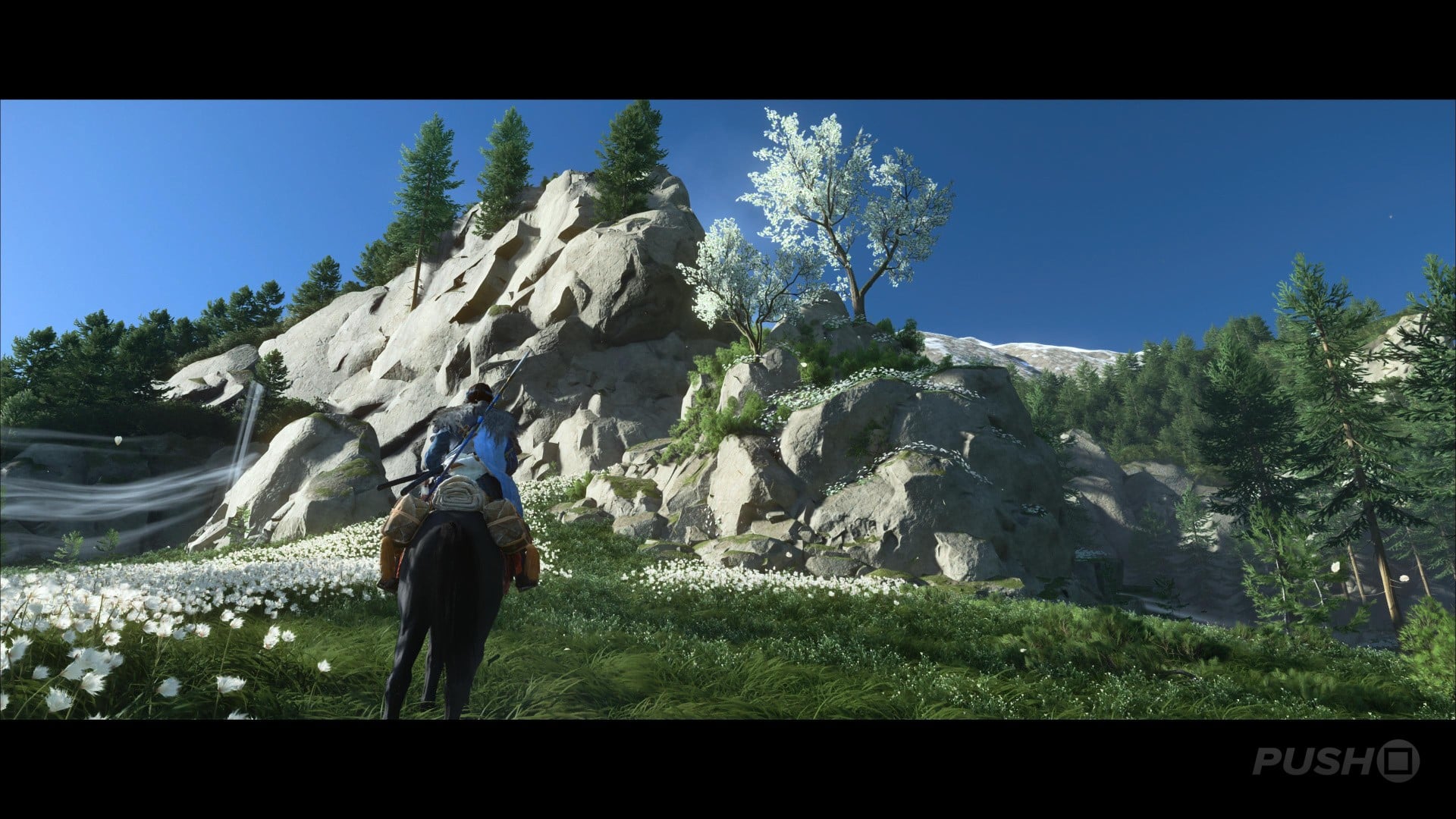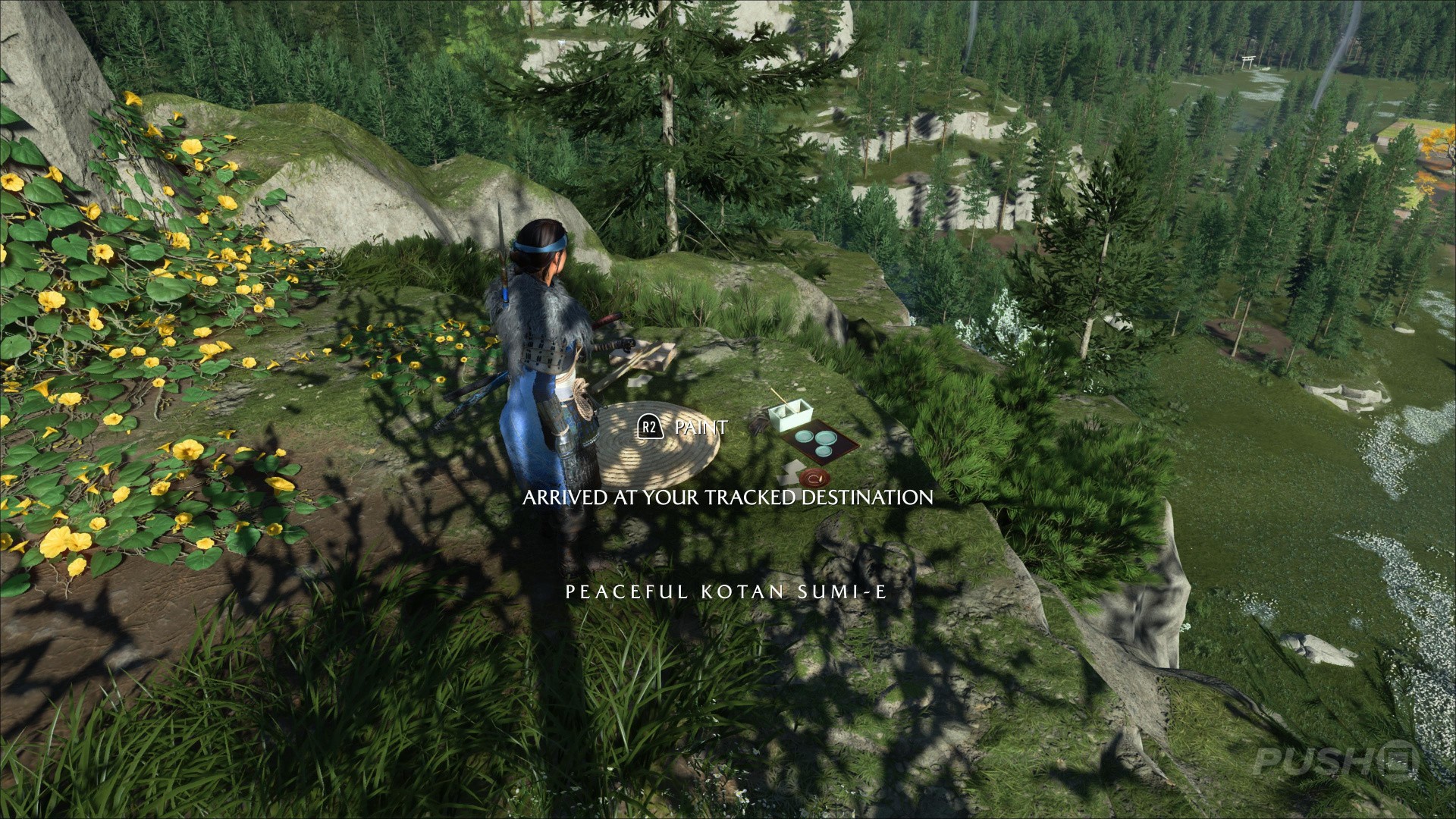 - Before the entrance to Blooming Ridge Shrine, turn back on yourself and continue up the rocky hill to find the Sumi-E location at the edge