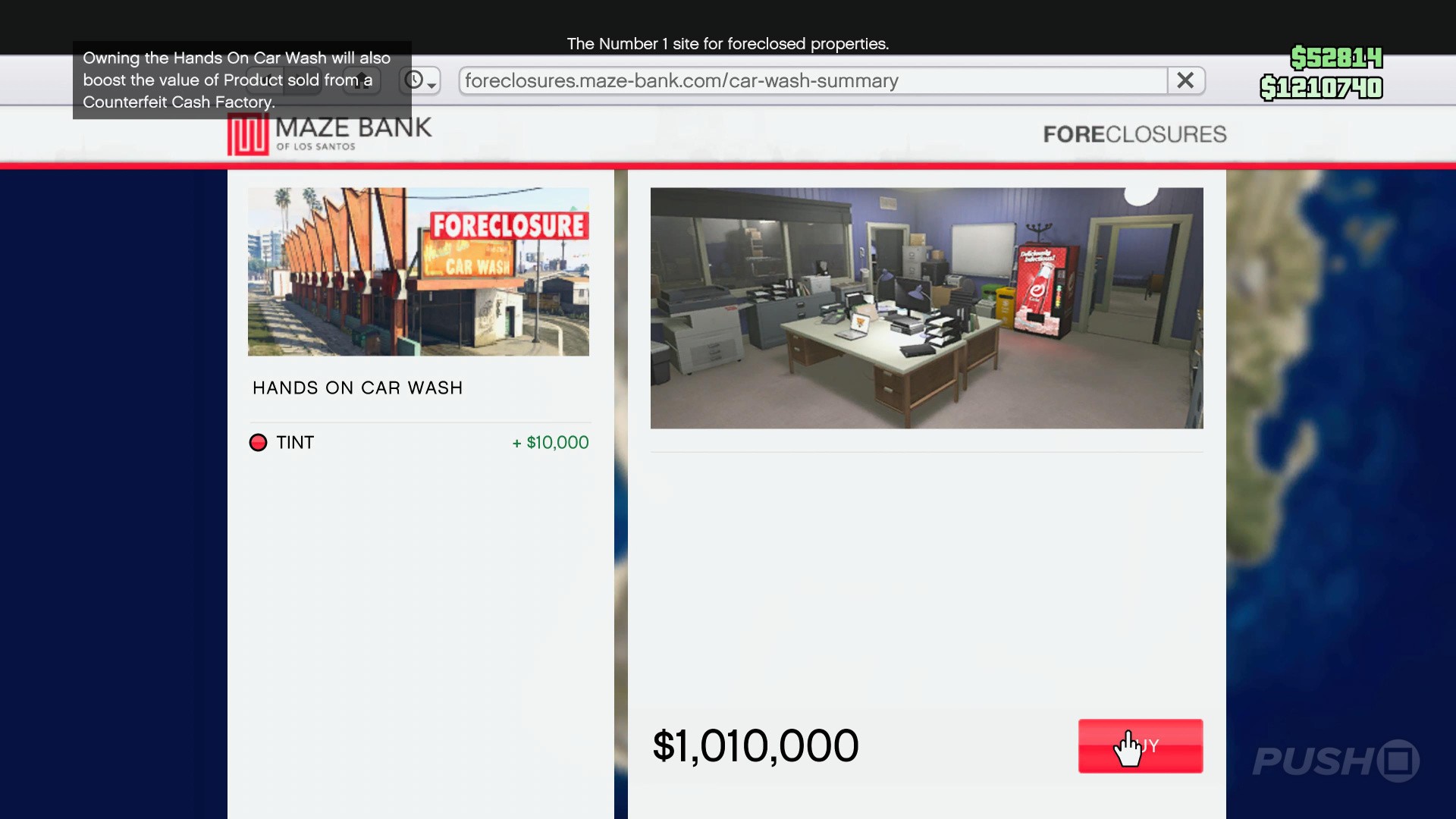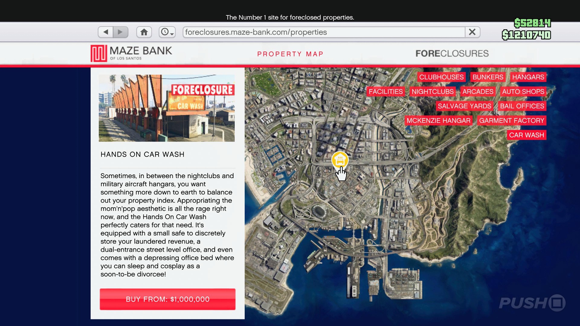 Unlike other businesses in GTA Online, you don't have a choice when it comes to which car wash to buy, so go ahead and purchase the one in Strawberry from the Foreclosures website on your smartphone.
