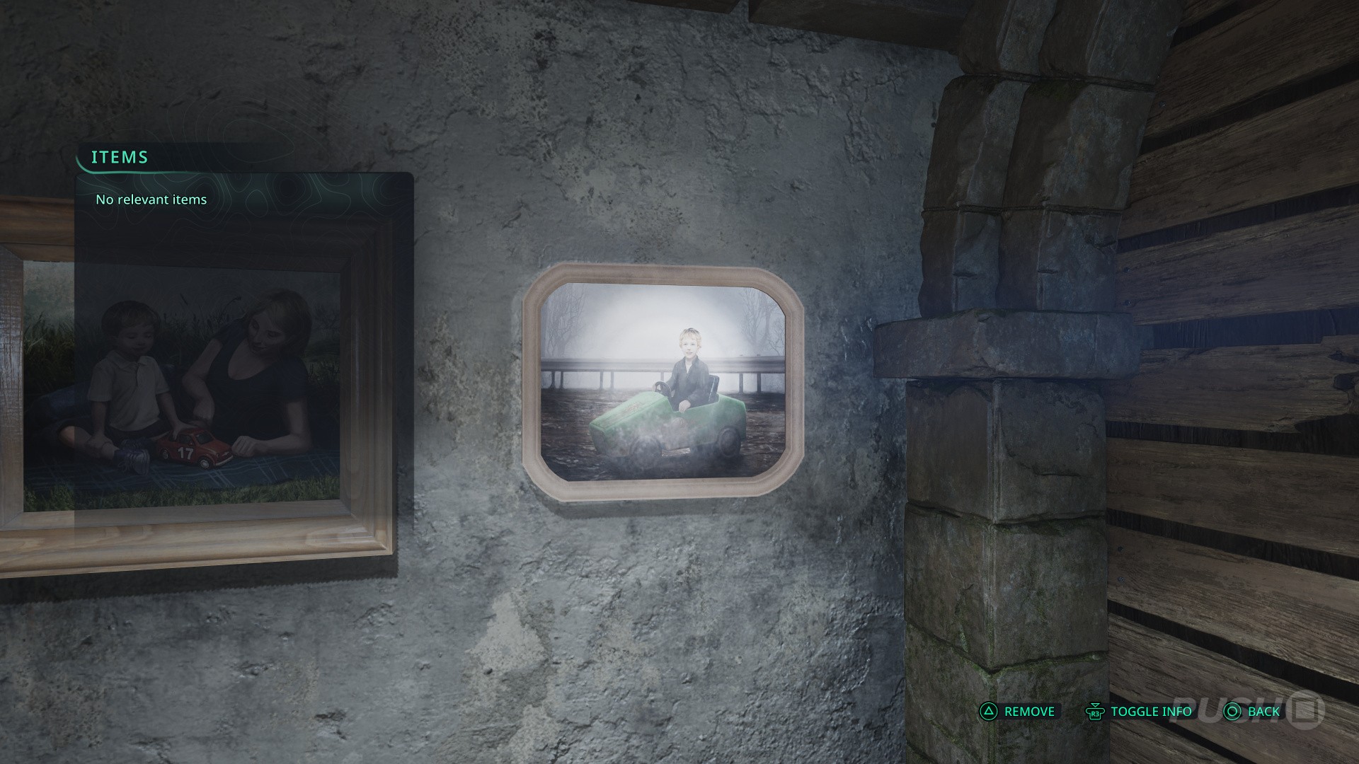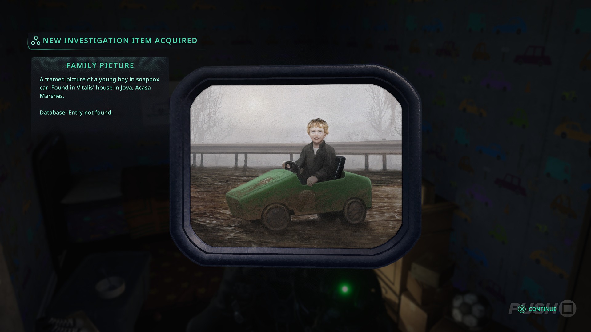 - As you enter the house, open the first door on the left to get your first clue — a picture of a young boy riding a toy car.