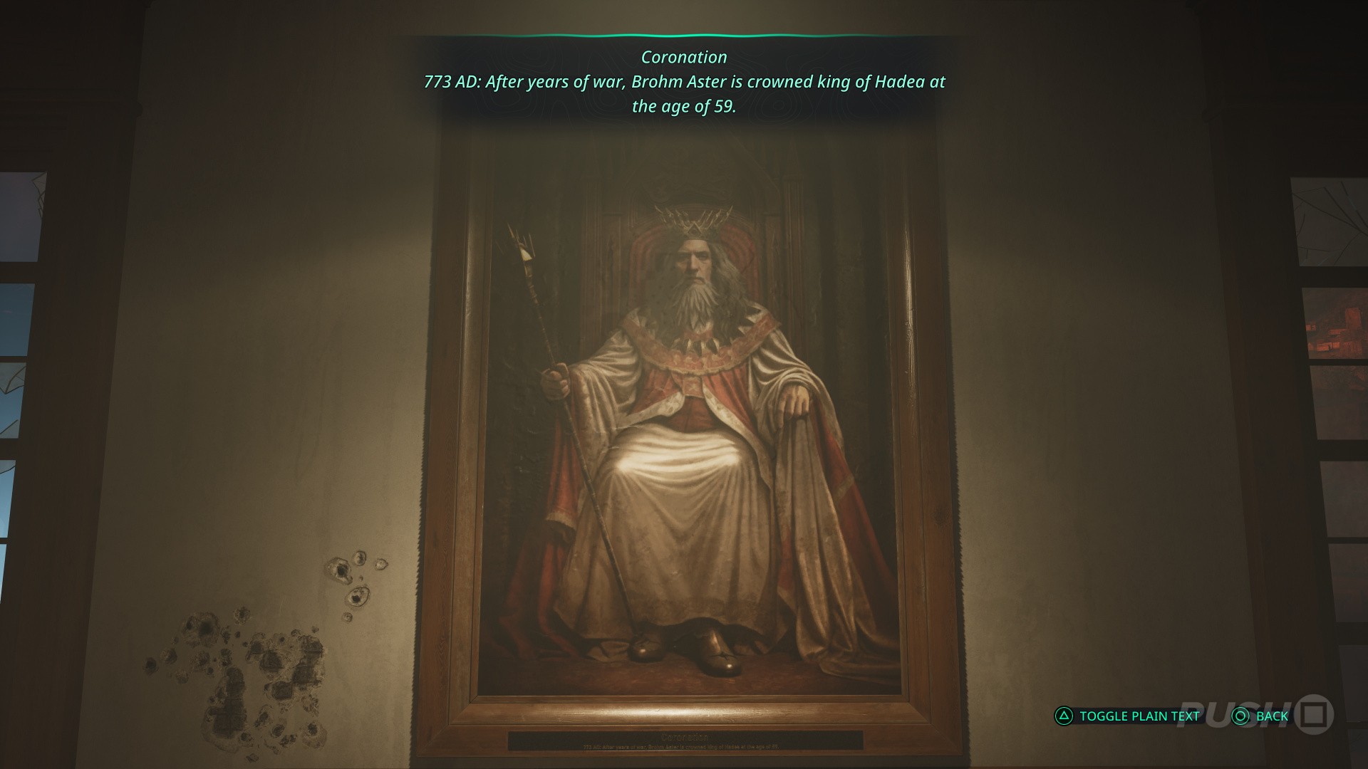 - From the office, go back through the wing to the south and you'll find a large portrait. Scanning it will tell you that Brohm Aster was made king in the year 773.