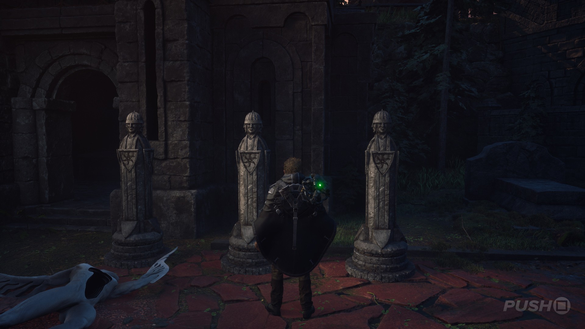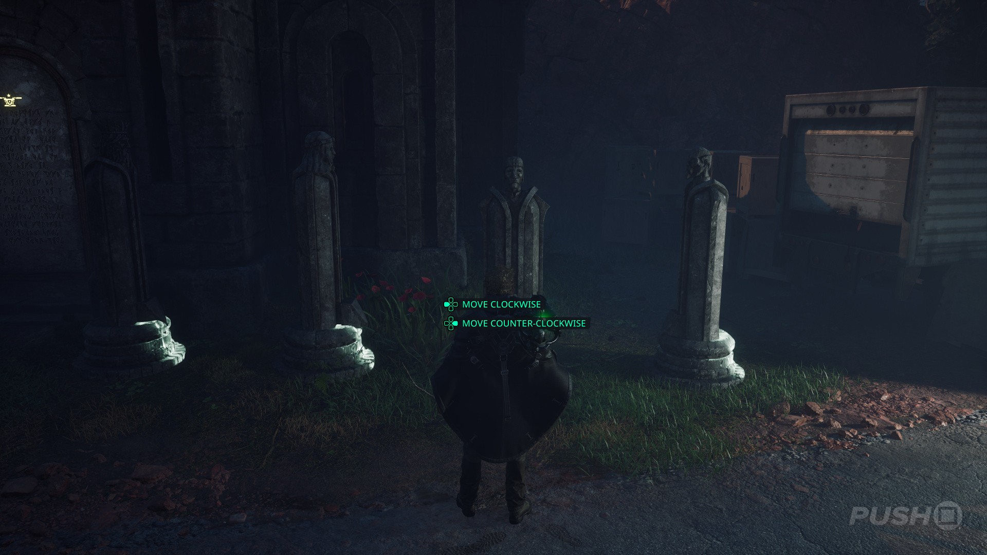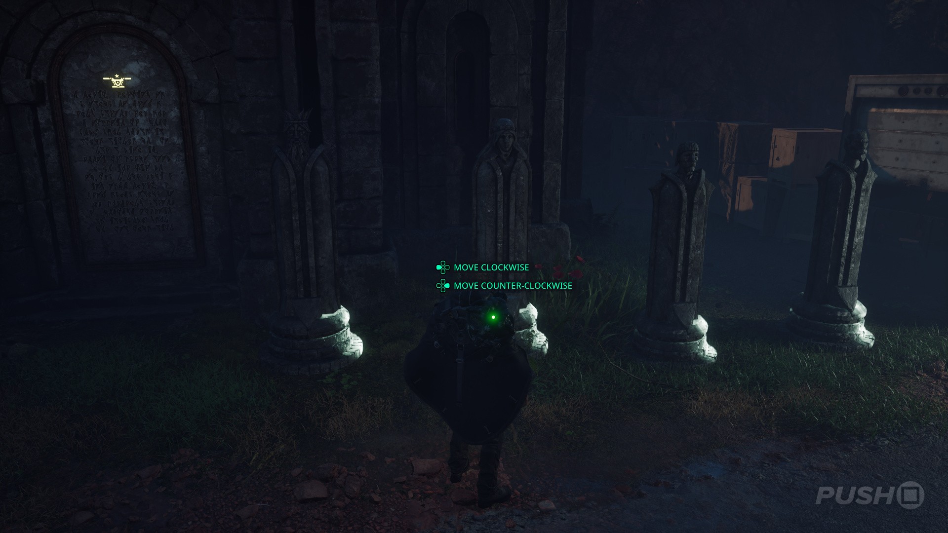 - You'll now be in an area with four statues and a dove symbol above a crypt.