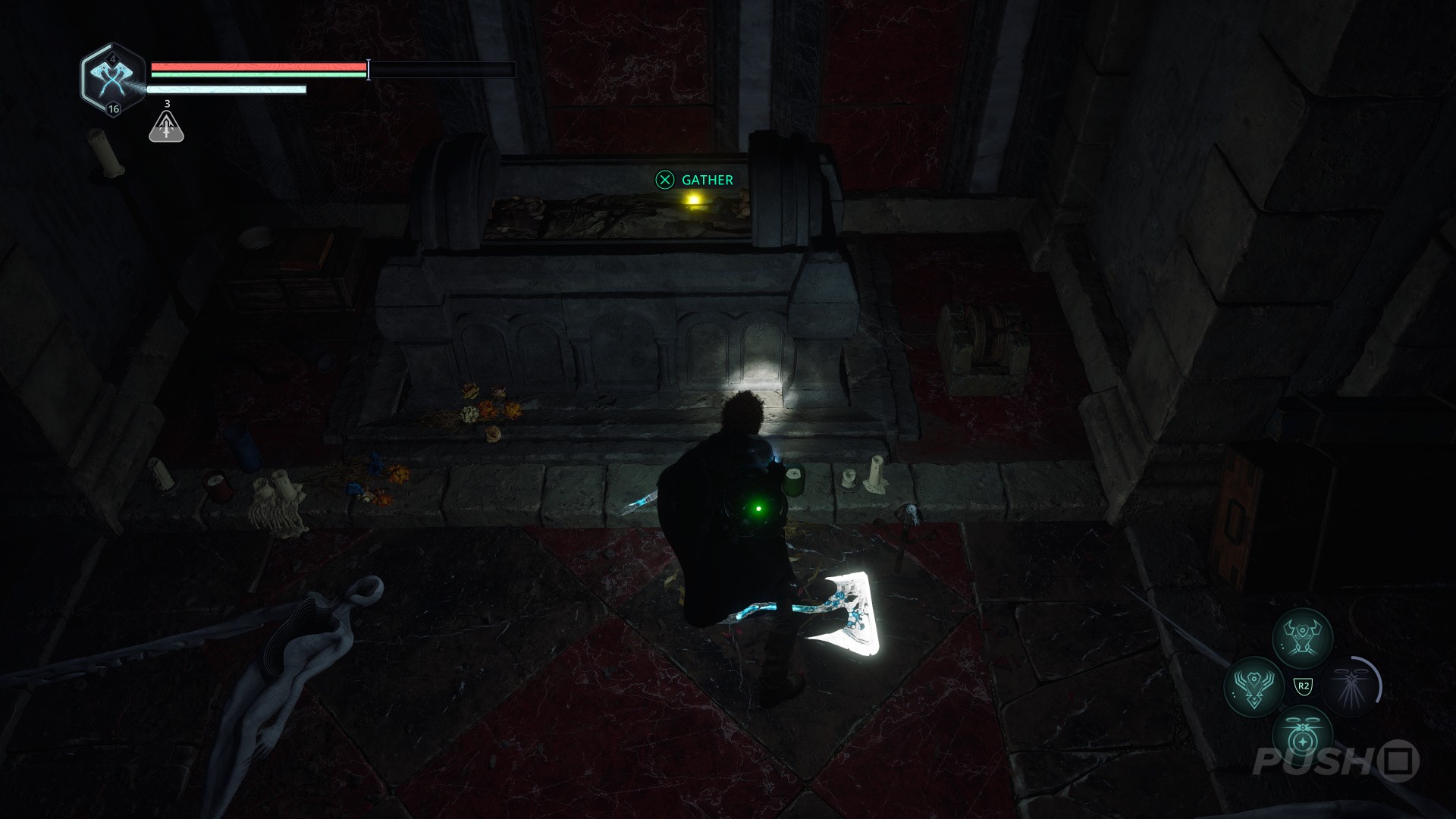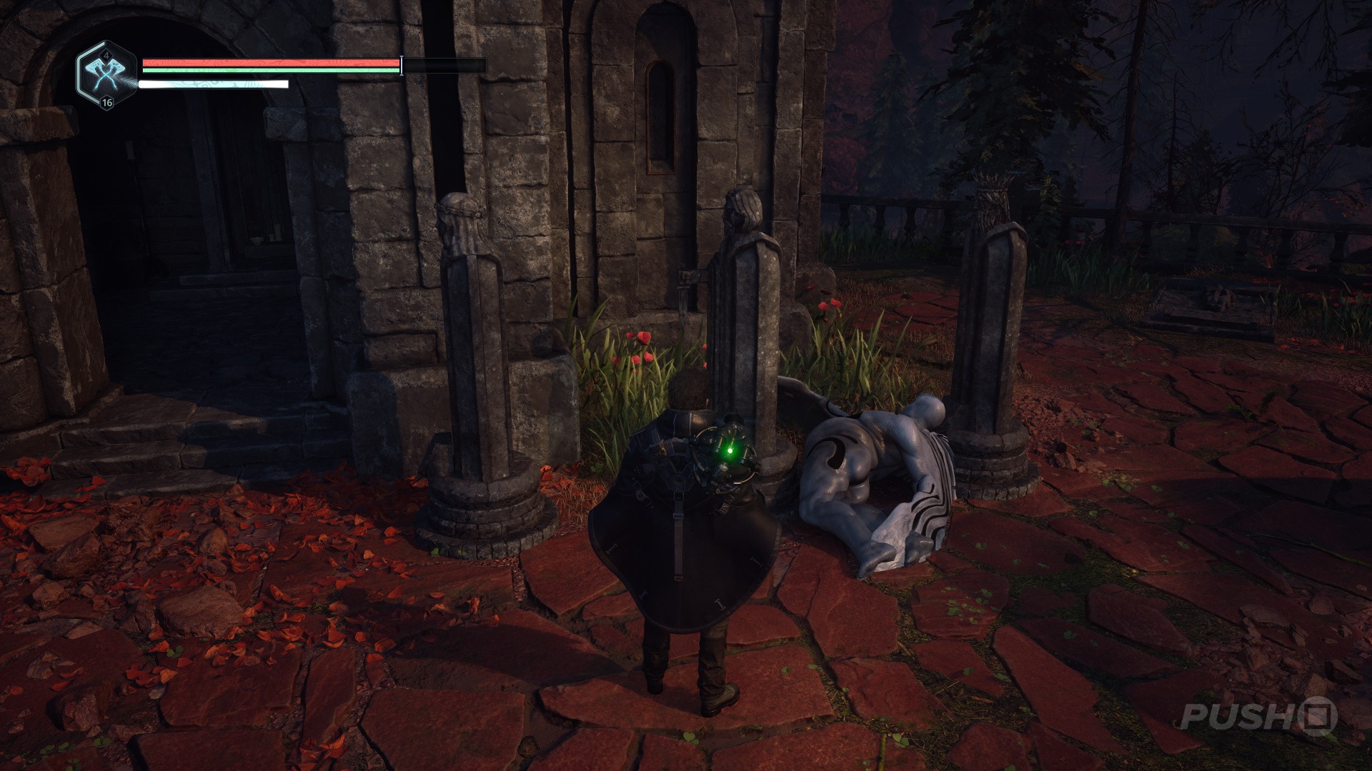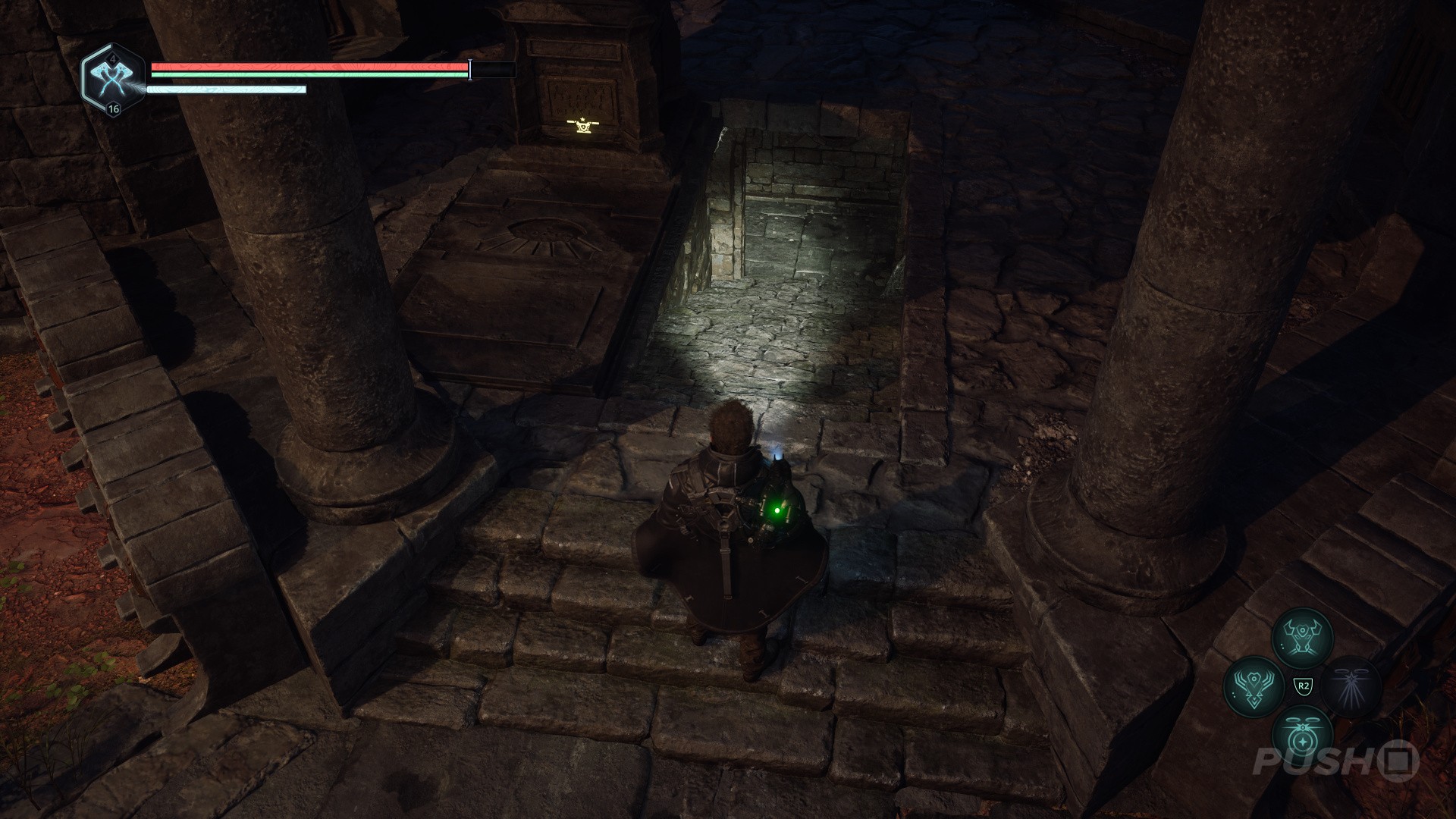 - You'll now be in an area with four statues and a dove symbol above a crypt.