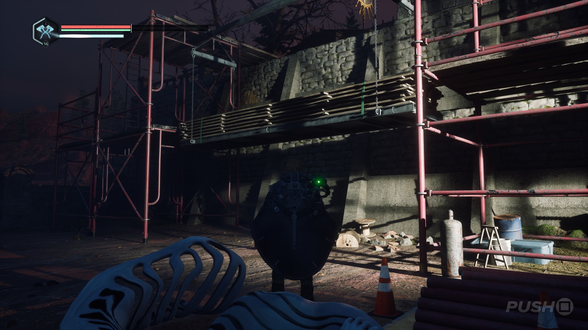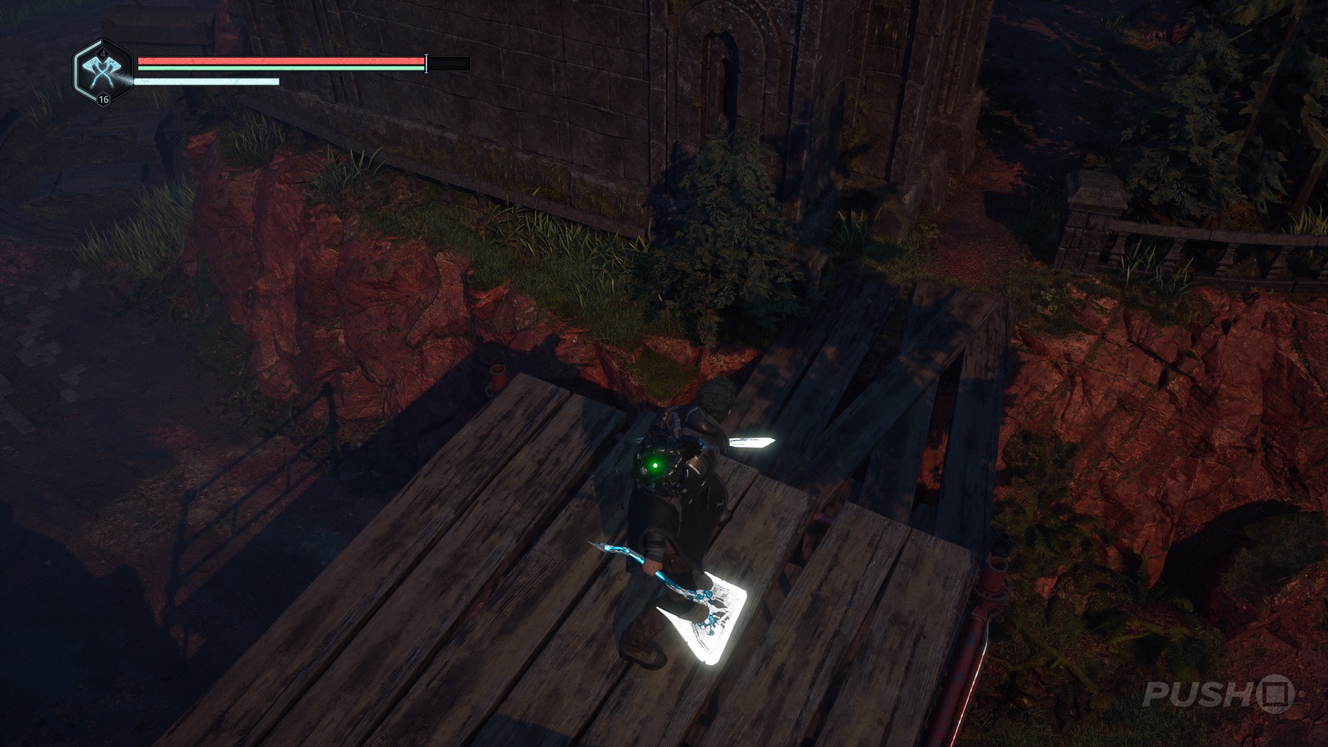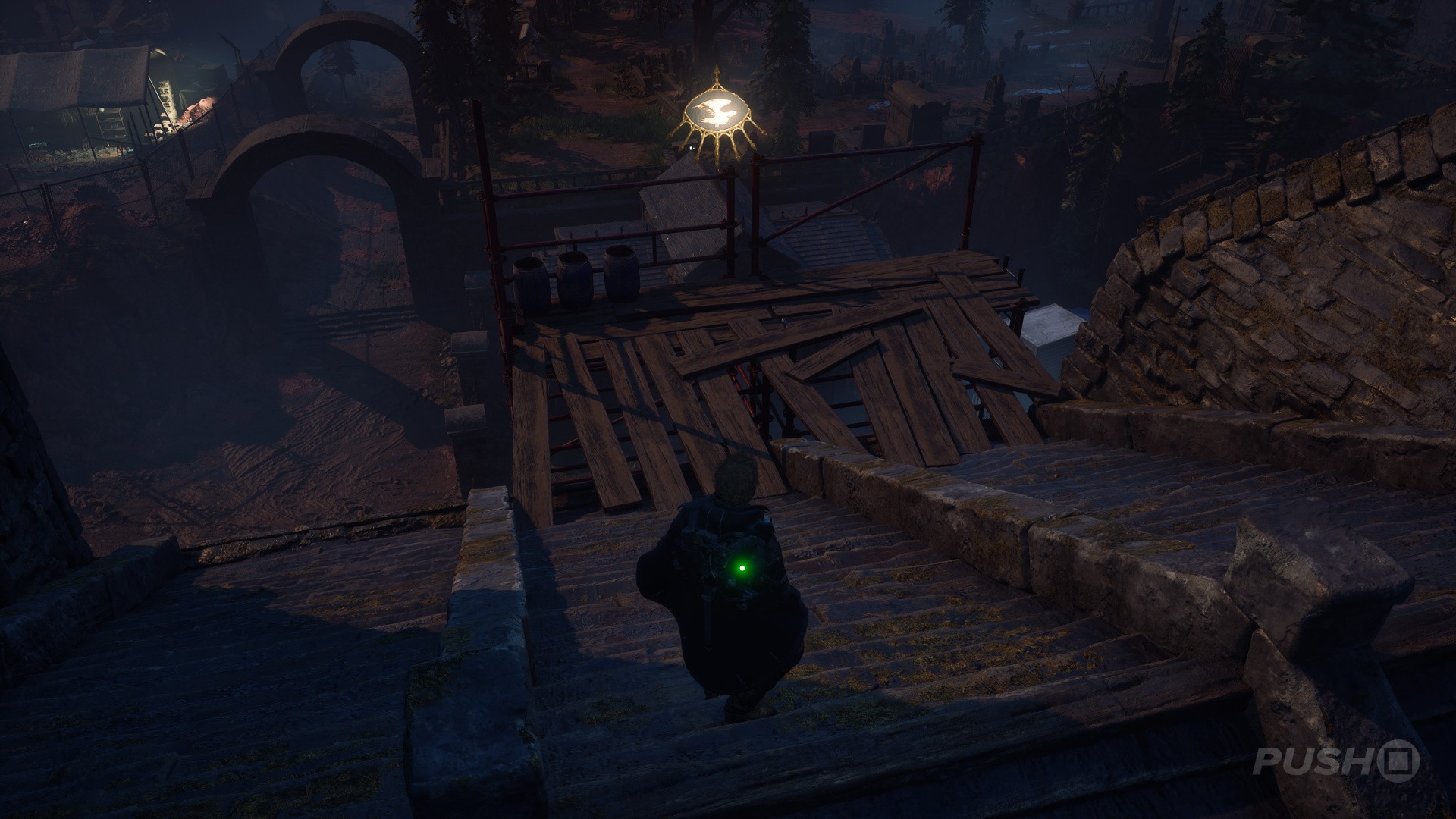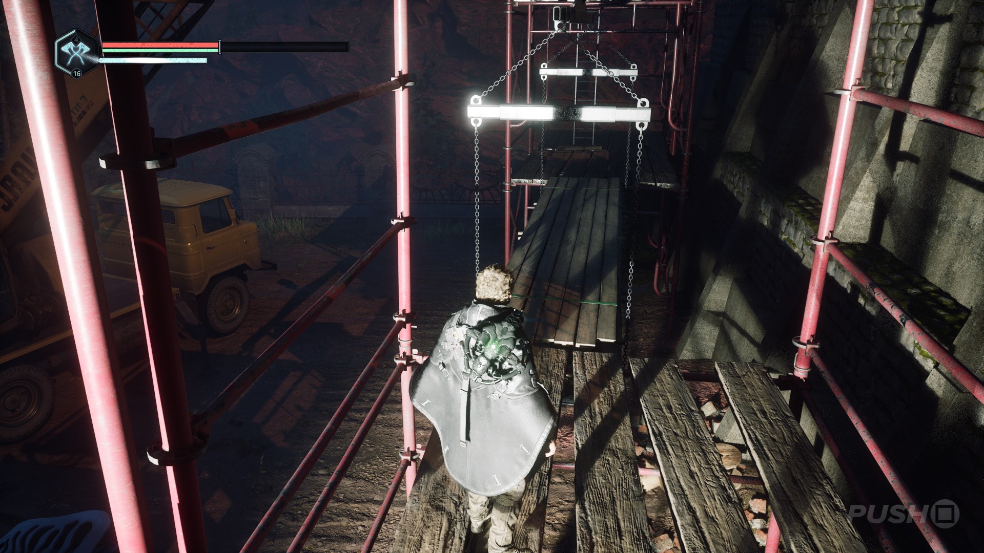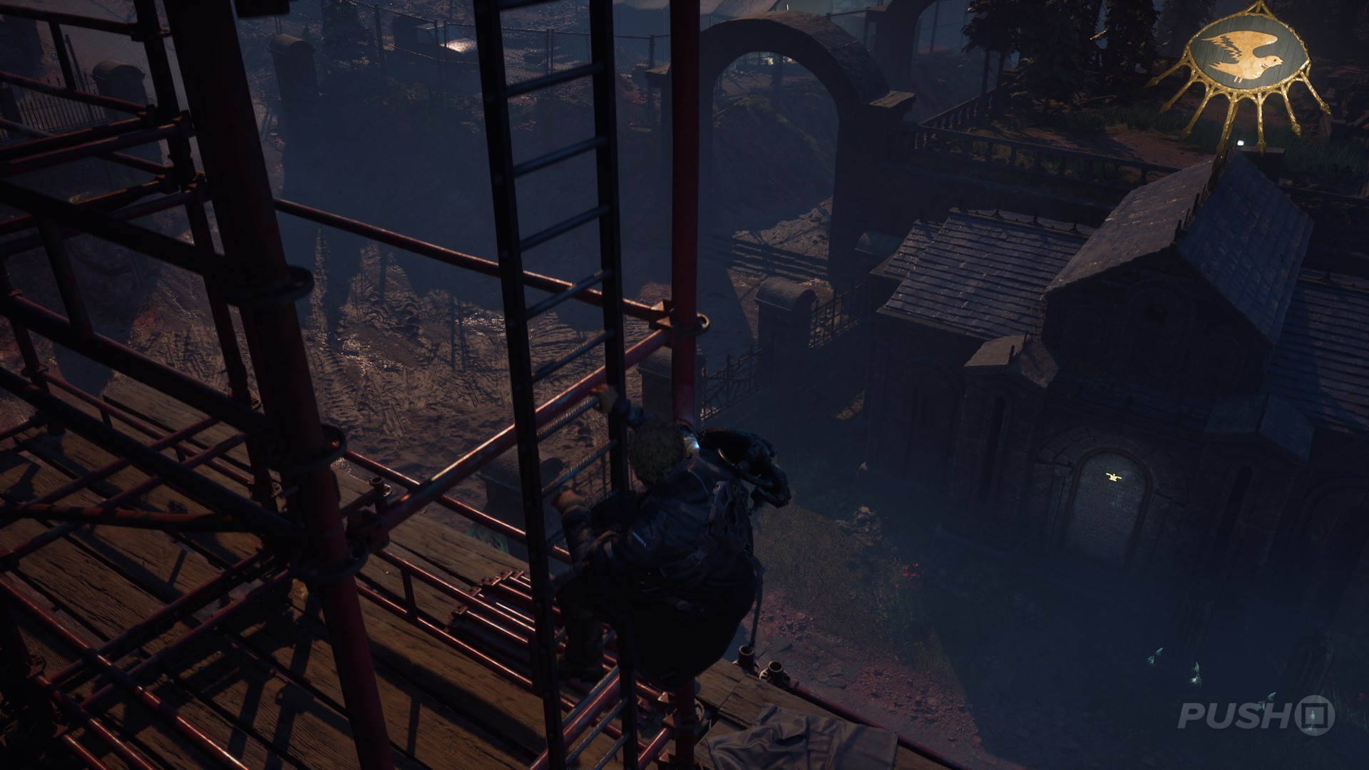 - As you come out of the church, go right and climb the ladder onto the scaffolding.
