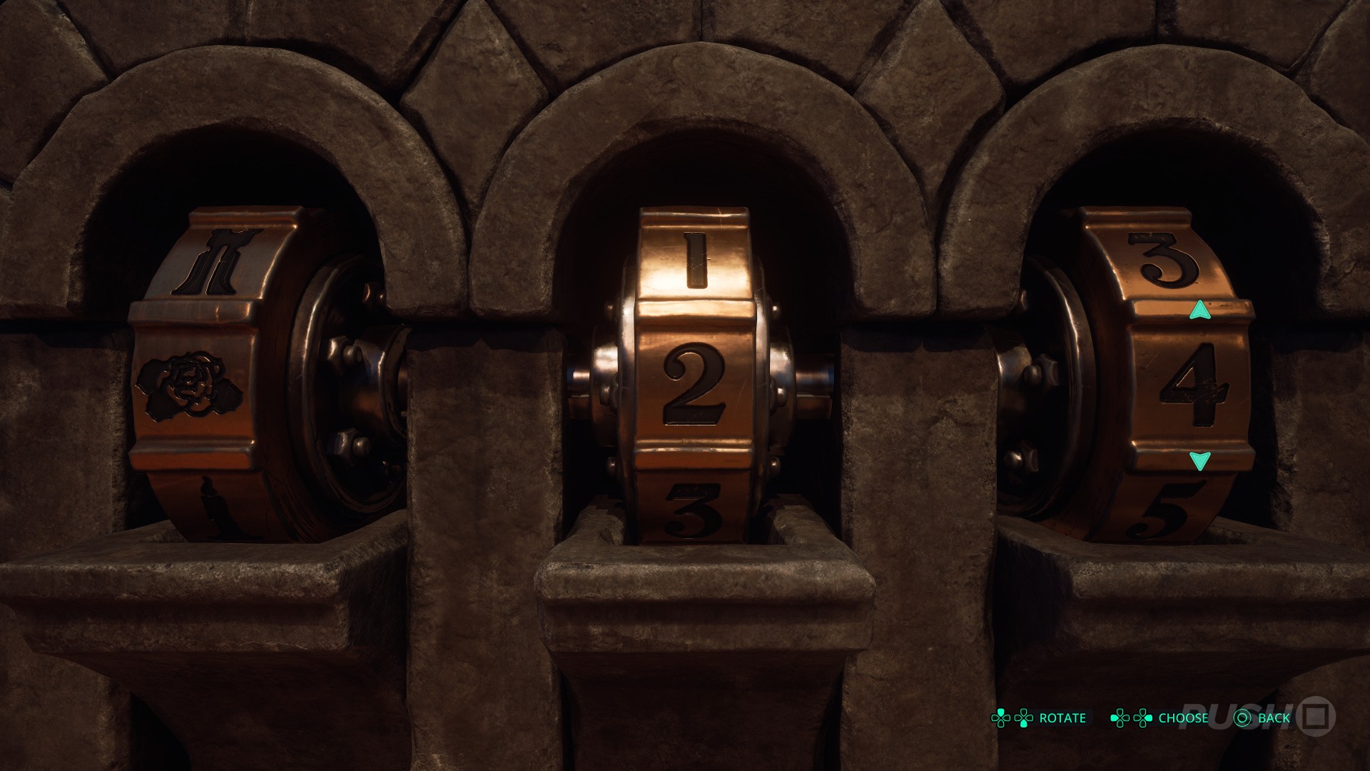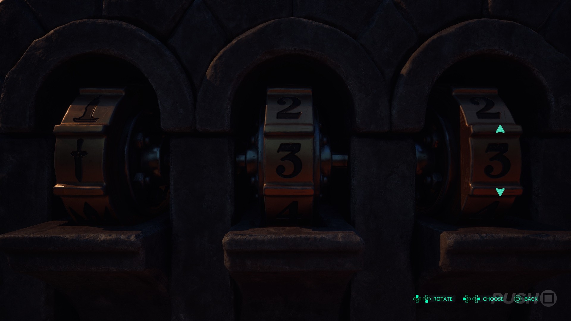 - Turn the left statue to the left, then the other two statues to the right.