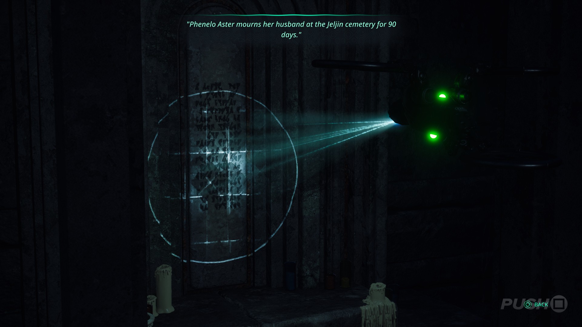 - Scan the tablet inside the crypt for your last clue: "Phenelo Aster mourns her husband at the Jeljin cemetery for 90 days."