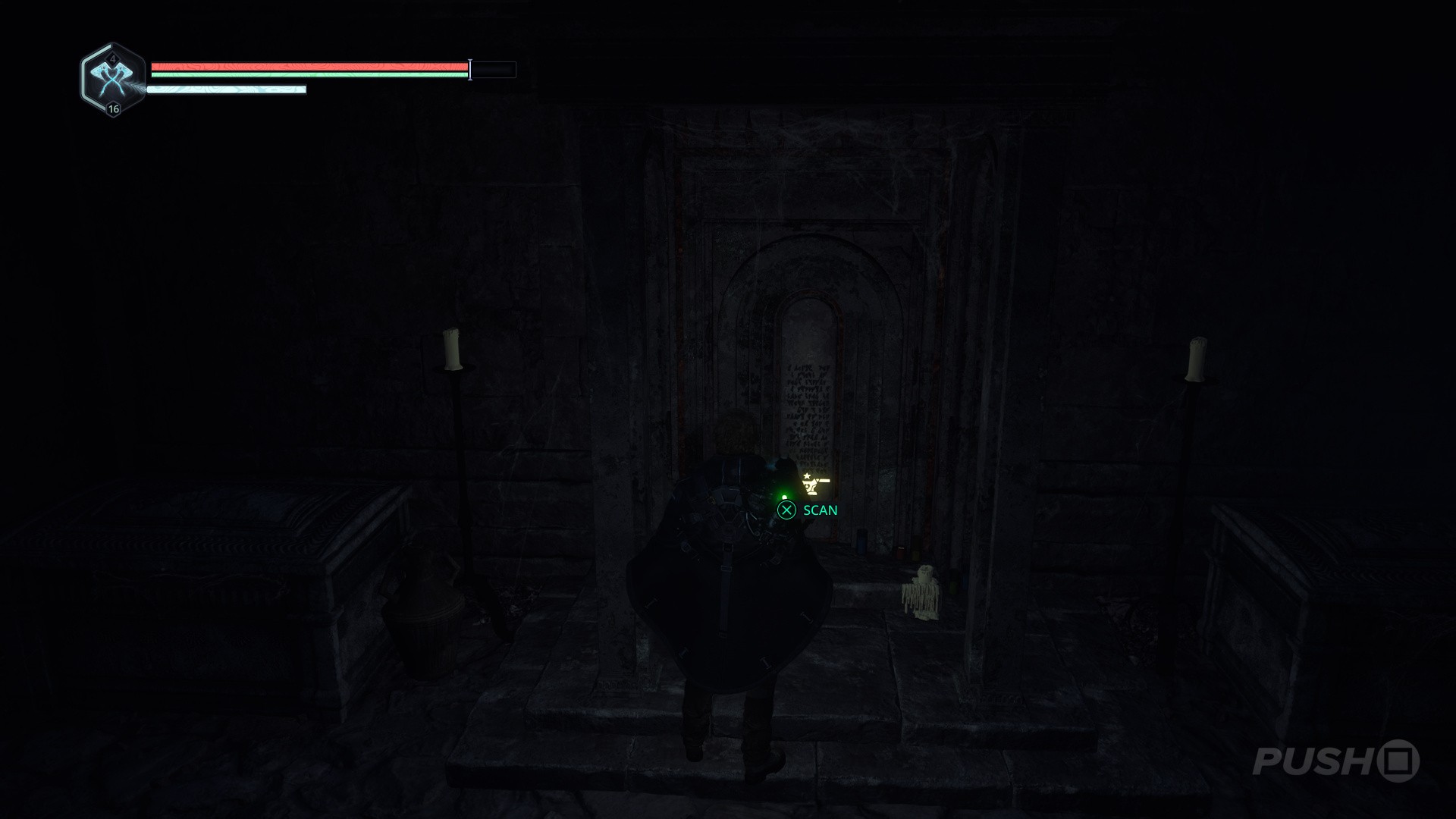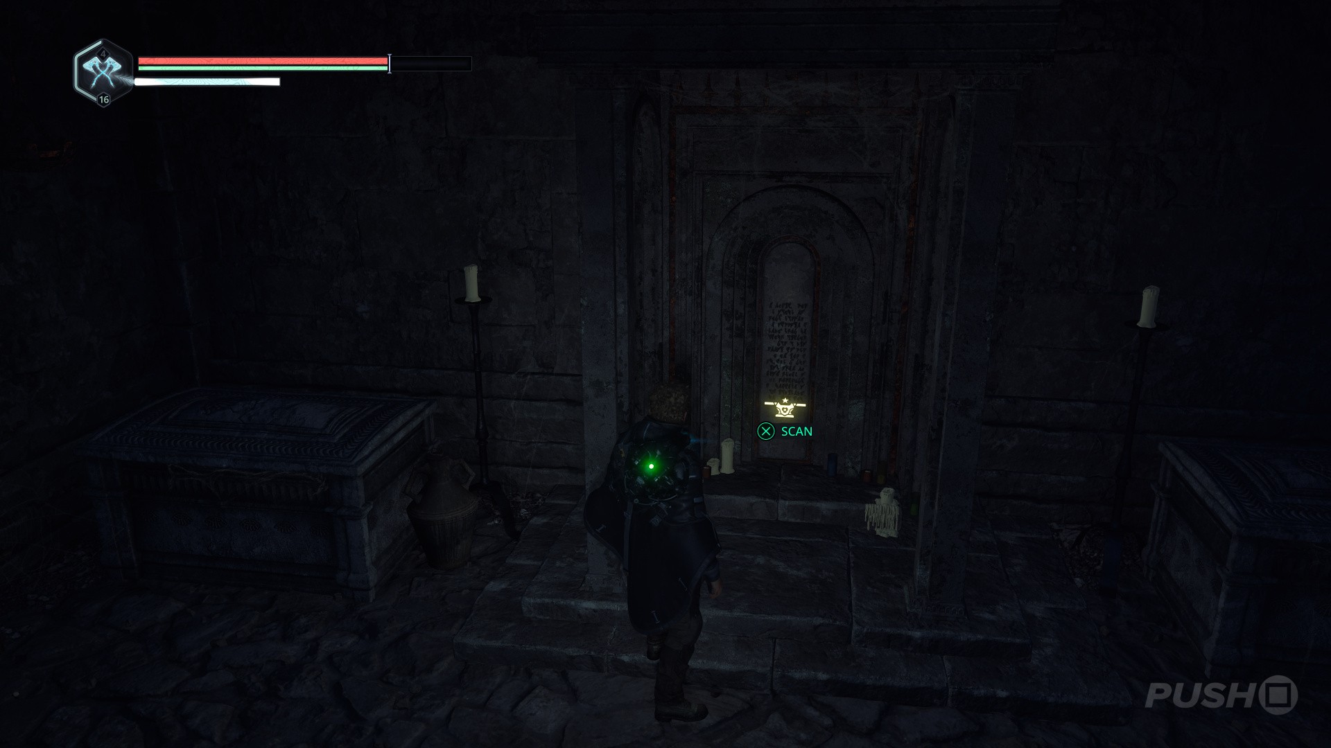 - Drop down on the scaffolding to reach the crypt with the horse symbol (beware of more enemies).