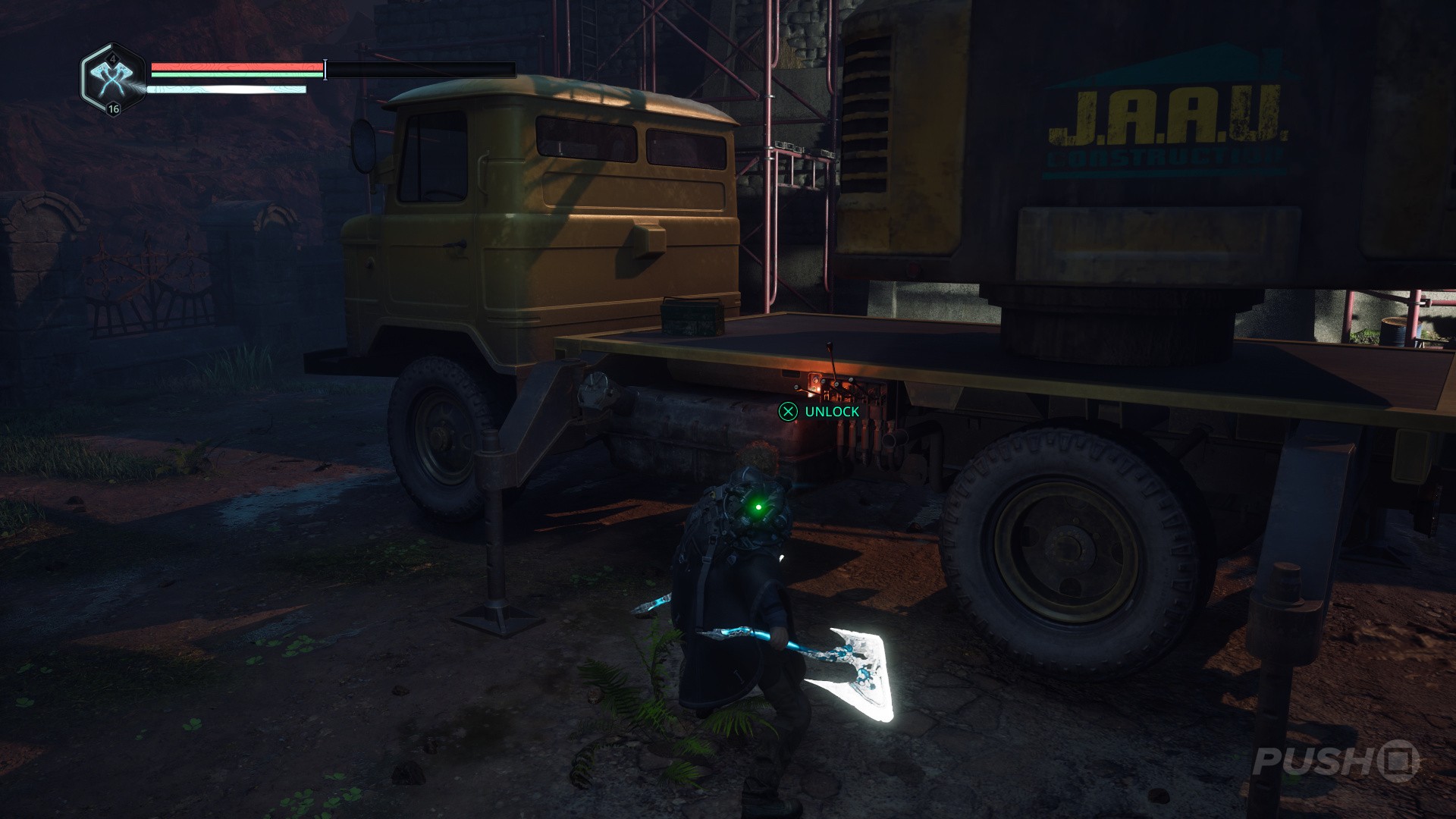 - Next, open the gate to the east. Defeat the enemy here, then go to the crane, use the key you picked up earlier, and activate the crane.