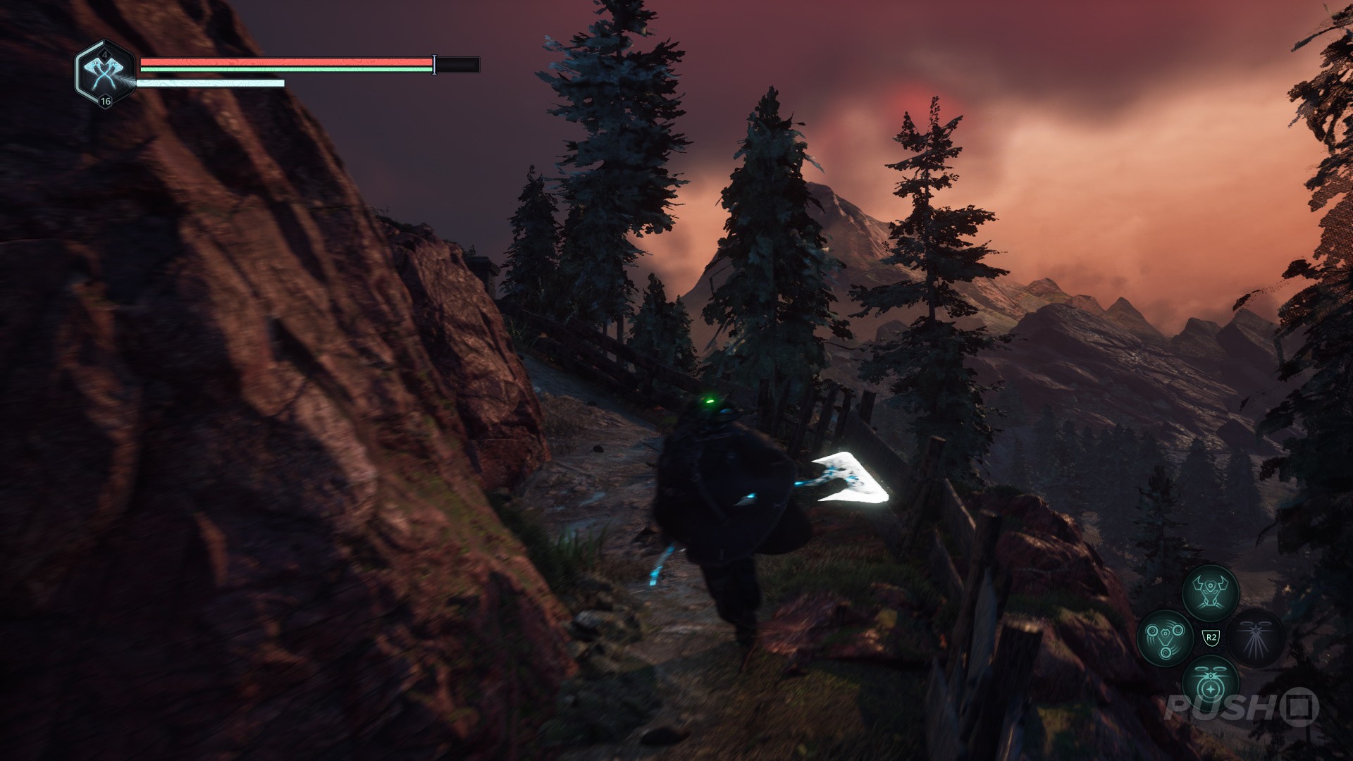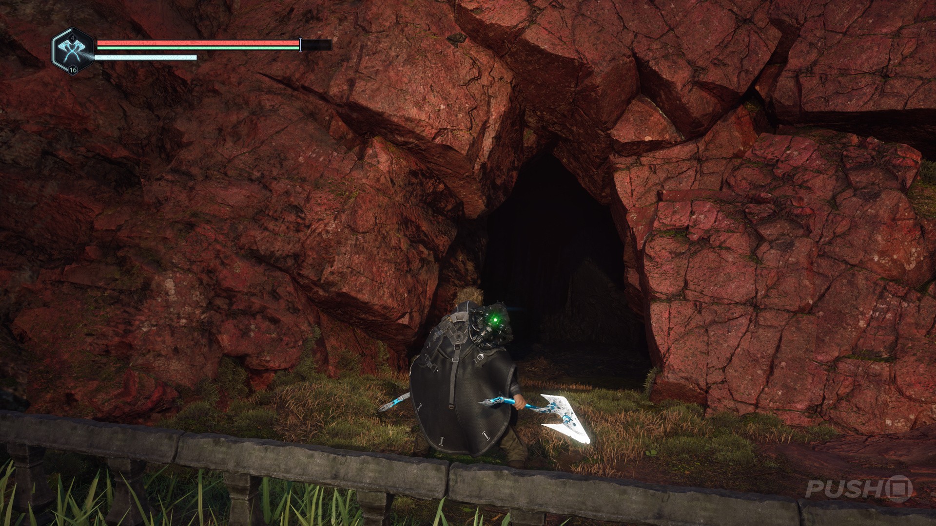 - Follow the path through the cave and up to find some enemies.