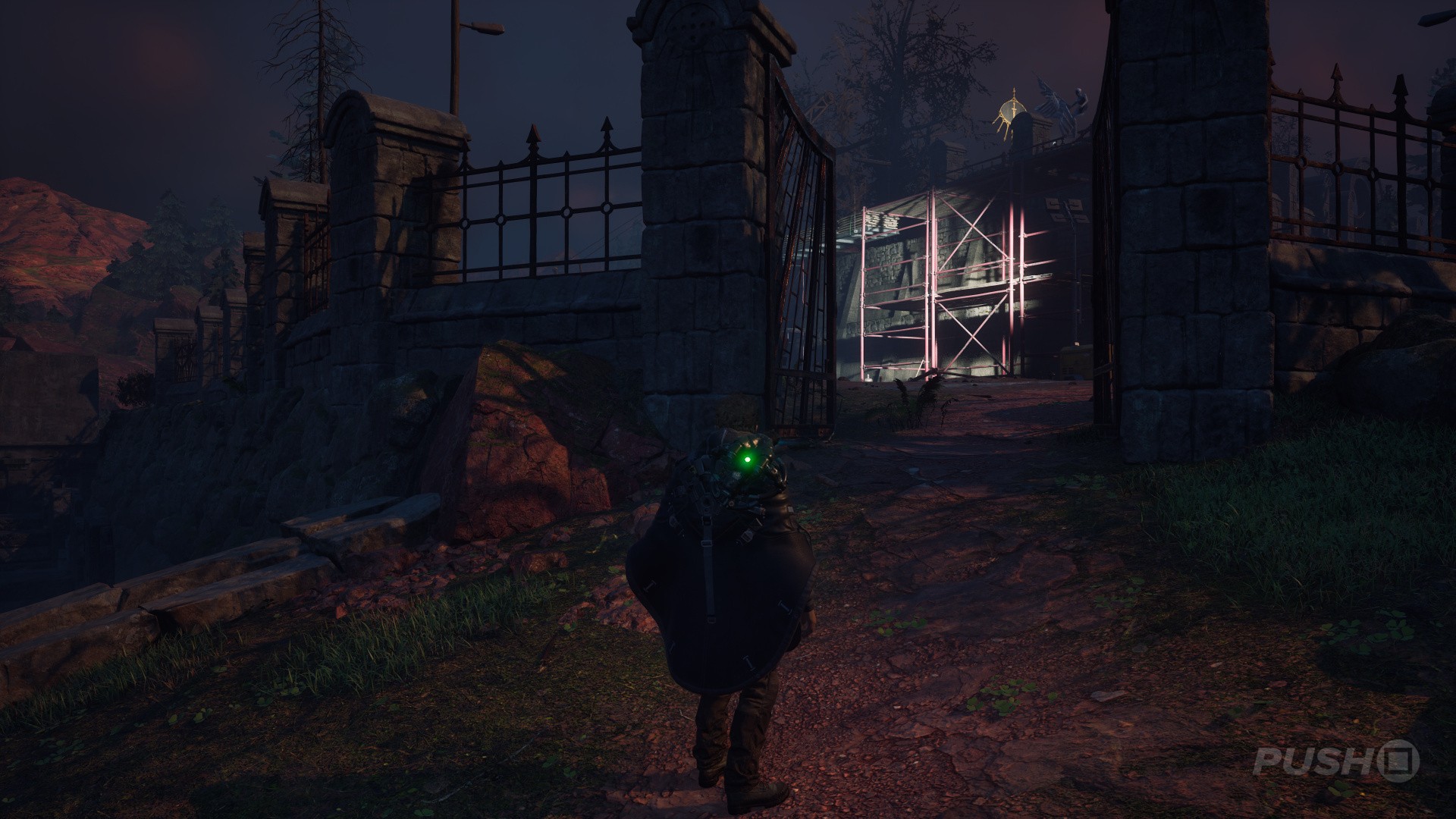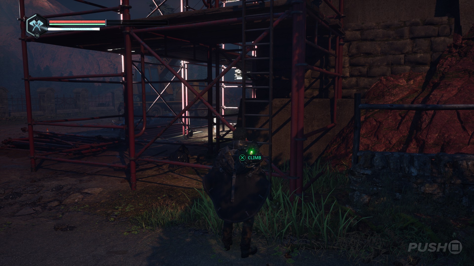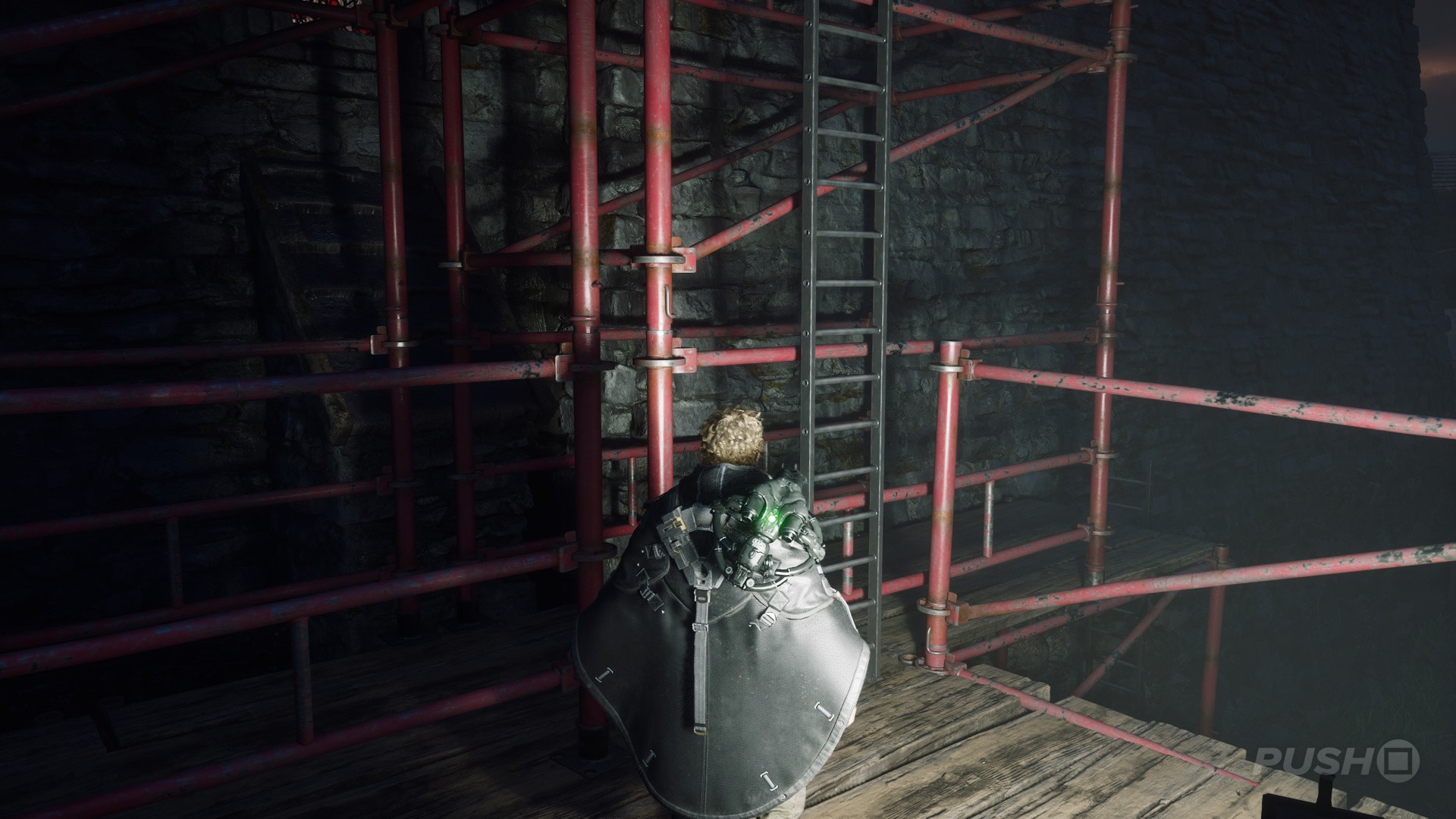 - Continue up the next ladder, walk over the roof, then descend the scaffolding on the other side.