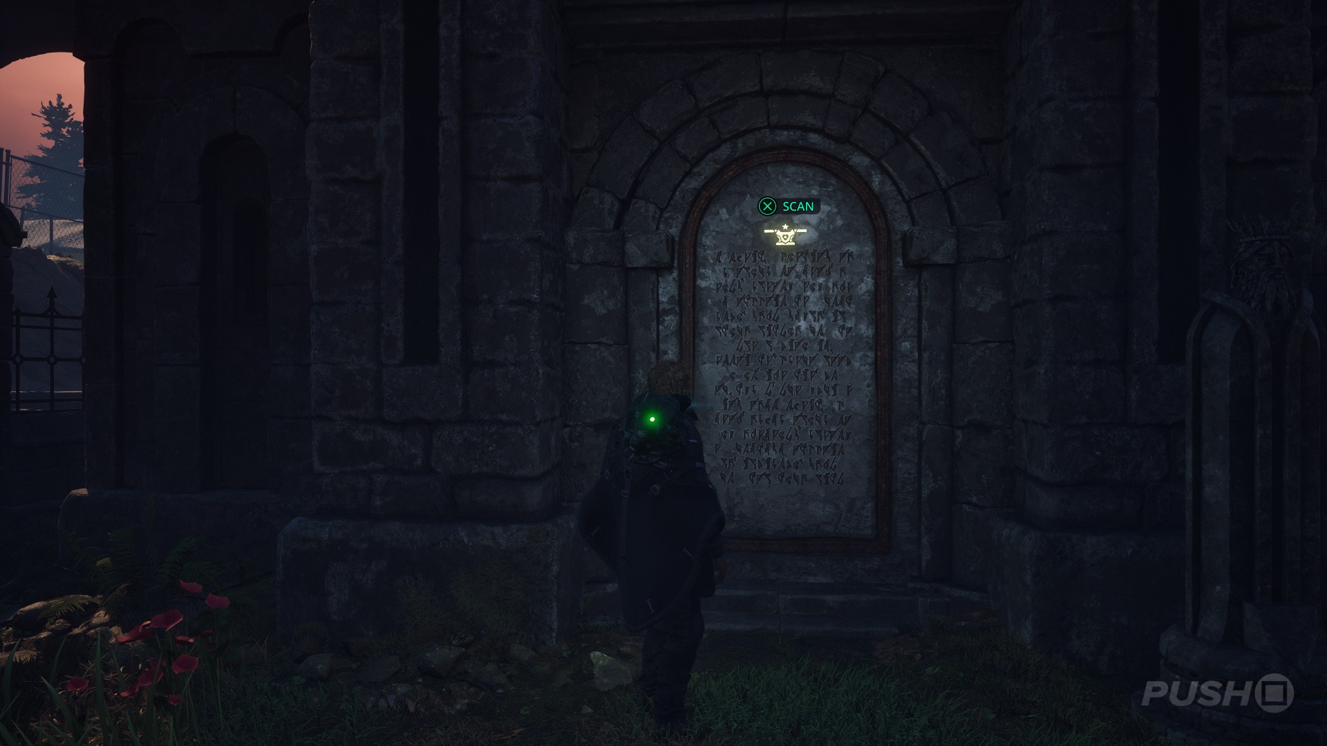 - Return to the main church. To the northwest you will find some stairs leading down to an area with another crypt, this time with a flower symbol.