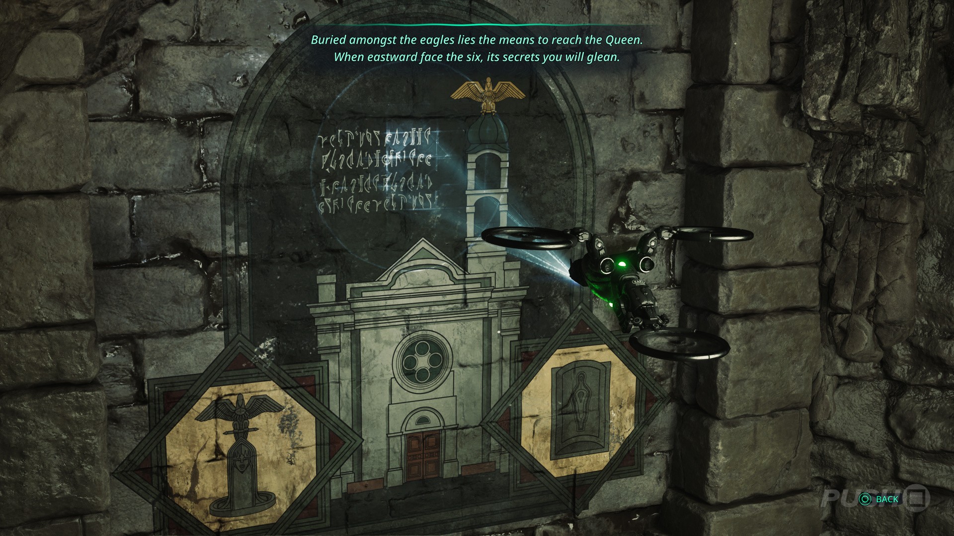 - Scan the mural inside the statue head and it reads, "Buried amongst the eagles lies the means to reach the Queen. When eastward face the six, its secrets you will glean."