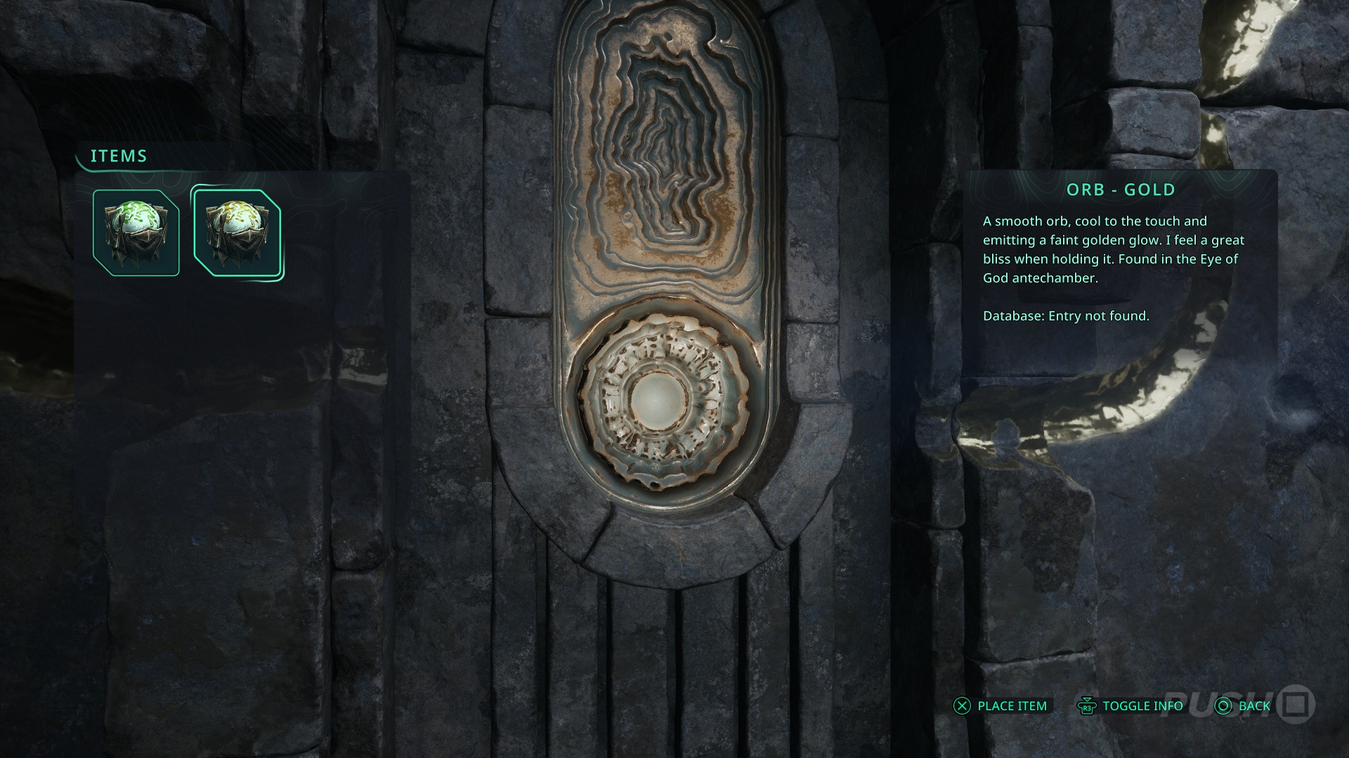 In the left-hand statue (Ecstasy), insert the Gold orb.