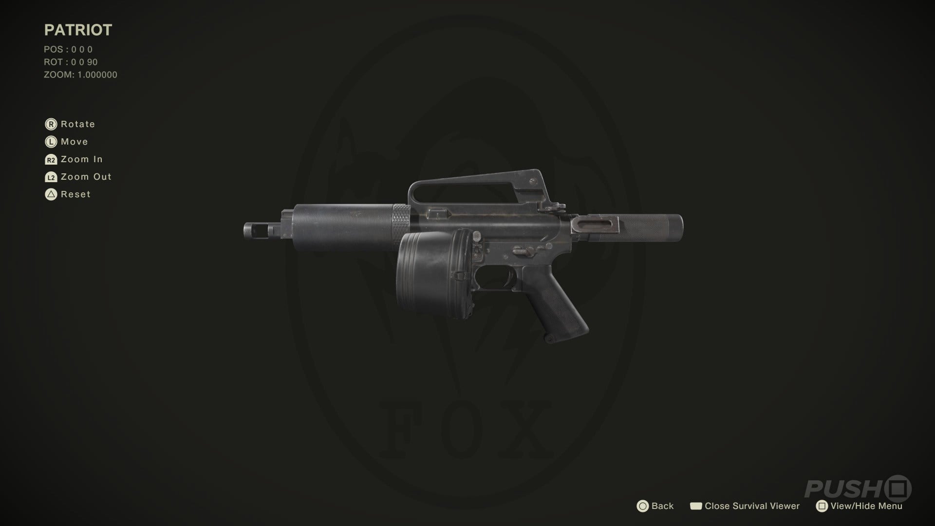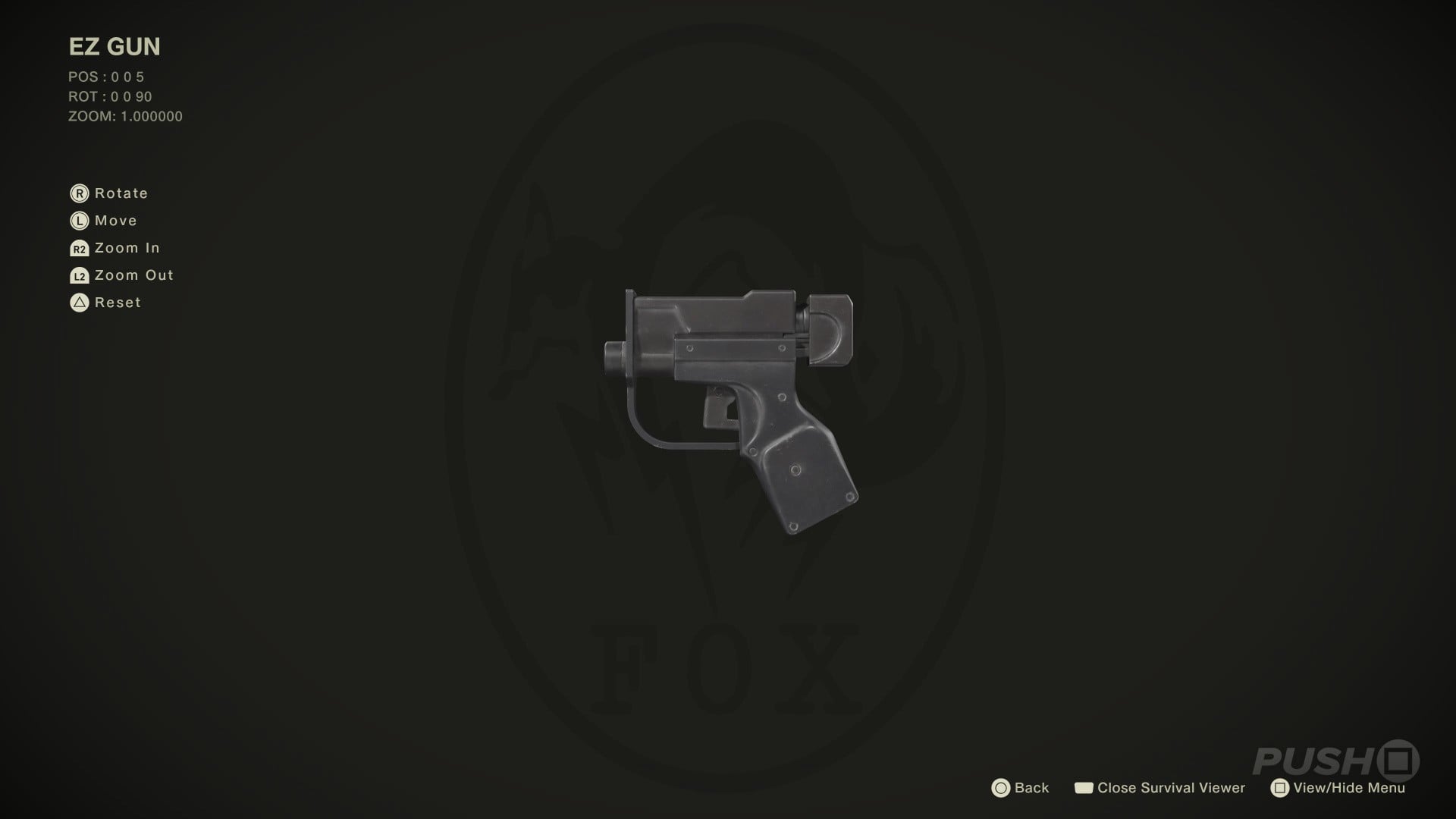 A silent tranquilizer gun developed especially for FOX. The tranquilizer ammunition used is specially designed for silent operation. Also equipped with an integral laser sight. Recovers stamina and keeps the Camo Index high while equipped.