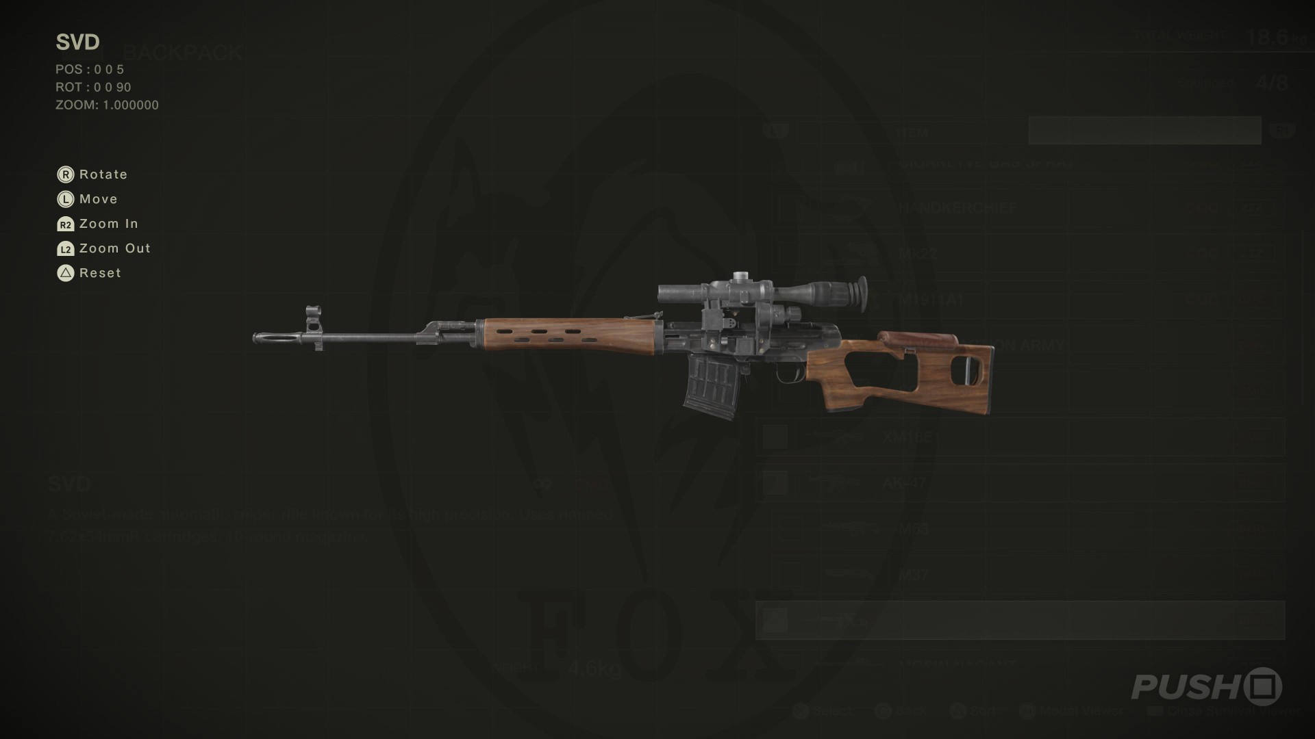 A Soviet-made automatic sniper rifle known for its high precision. Uses rimmed 7.62x54mmR cartridges. 10-round magazine.