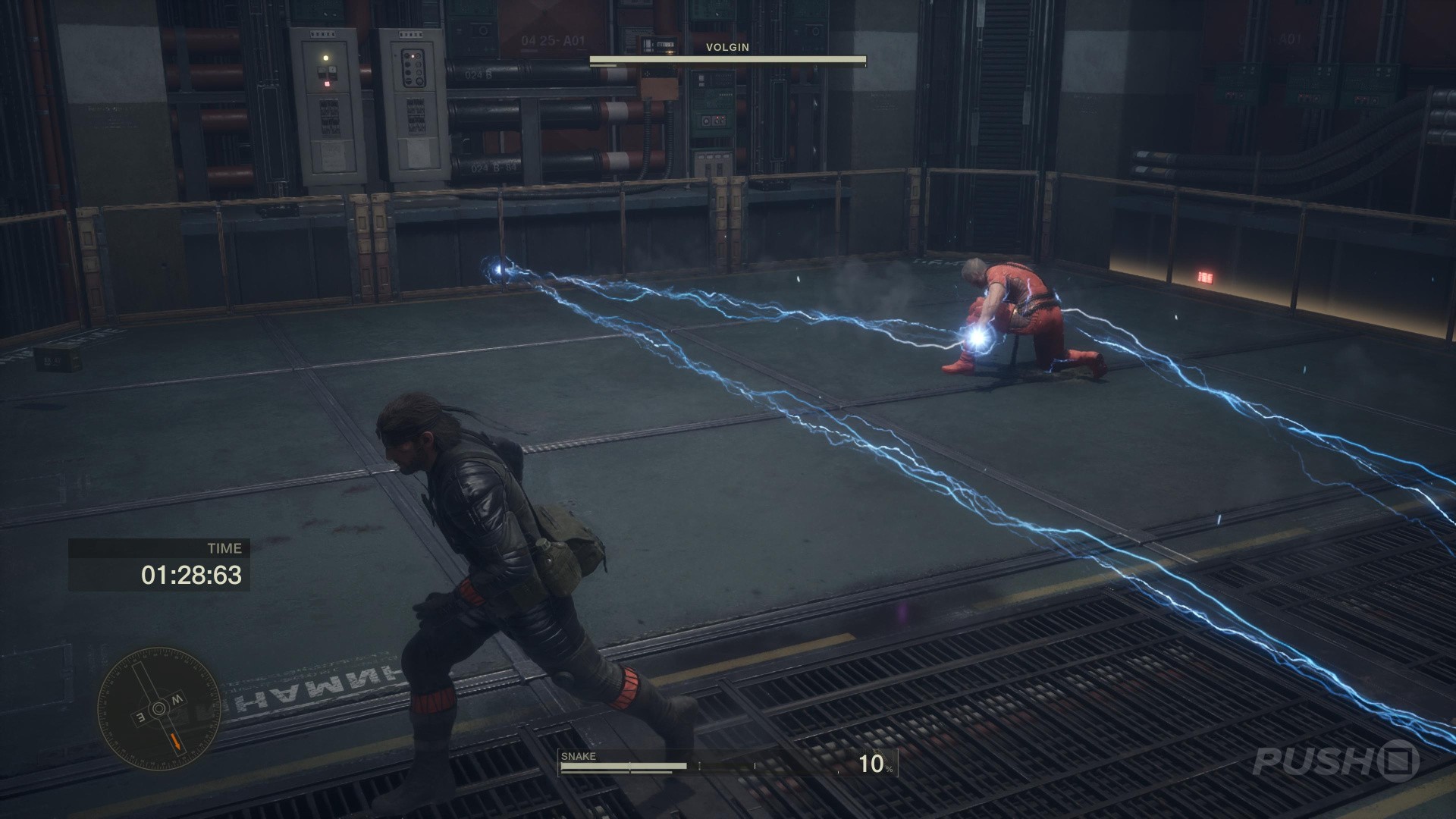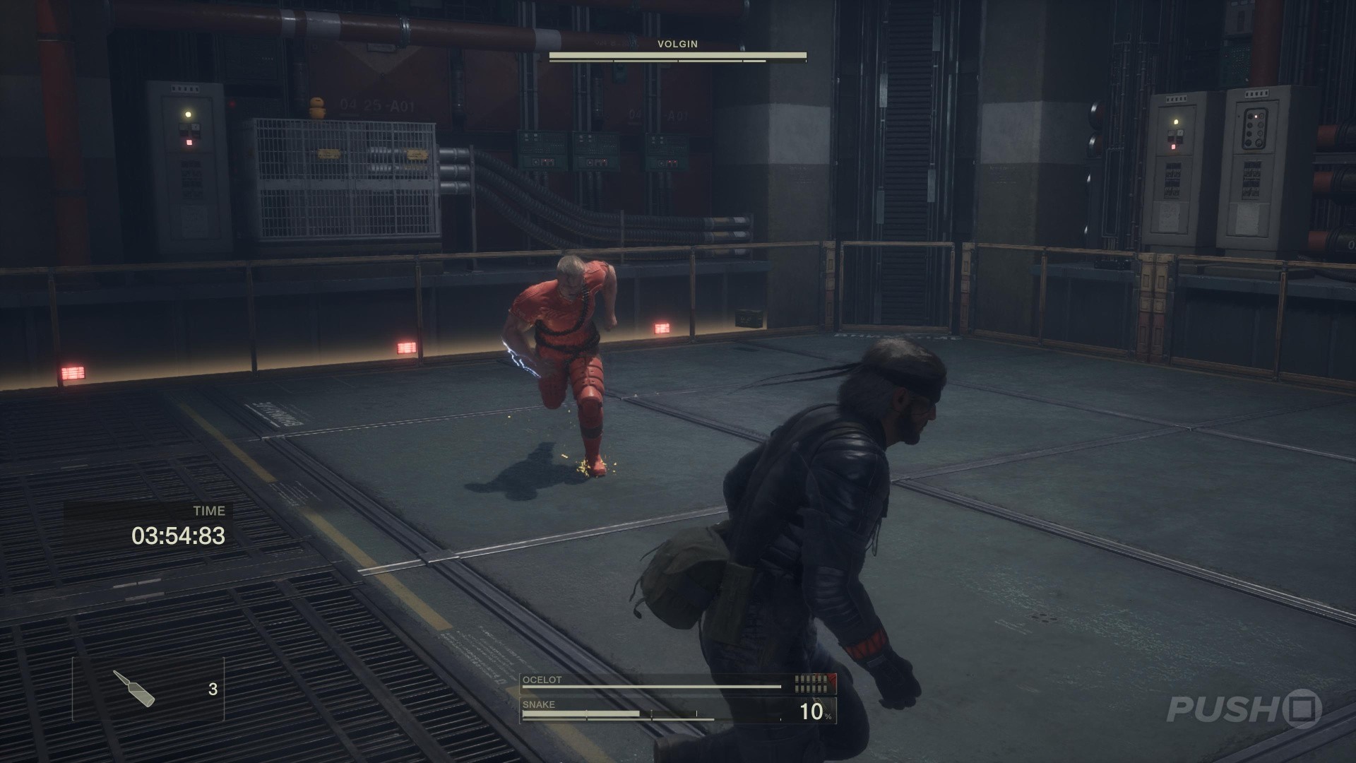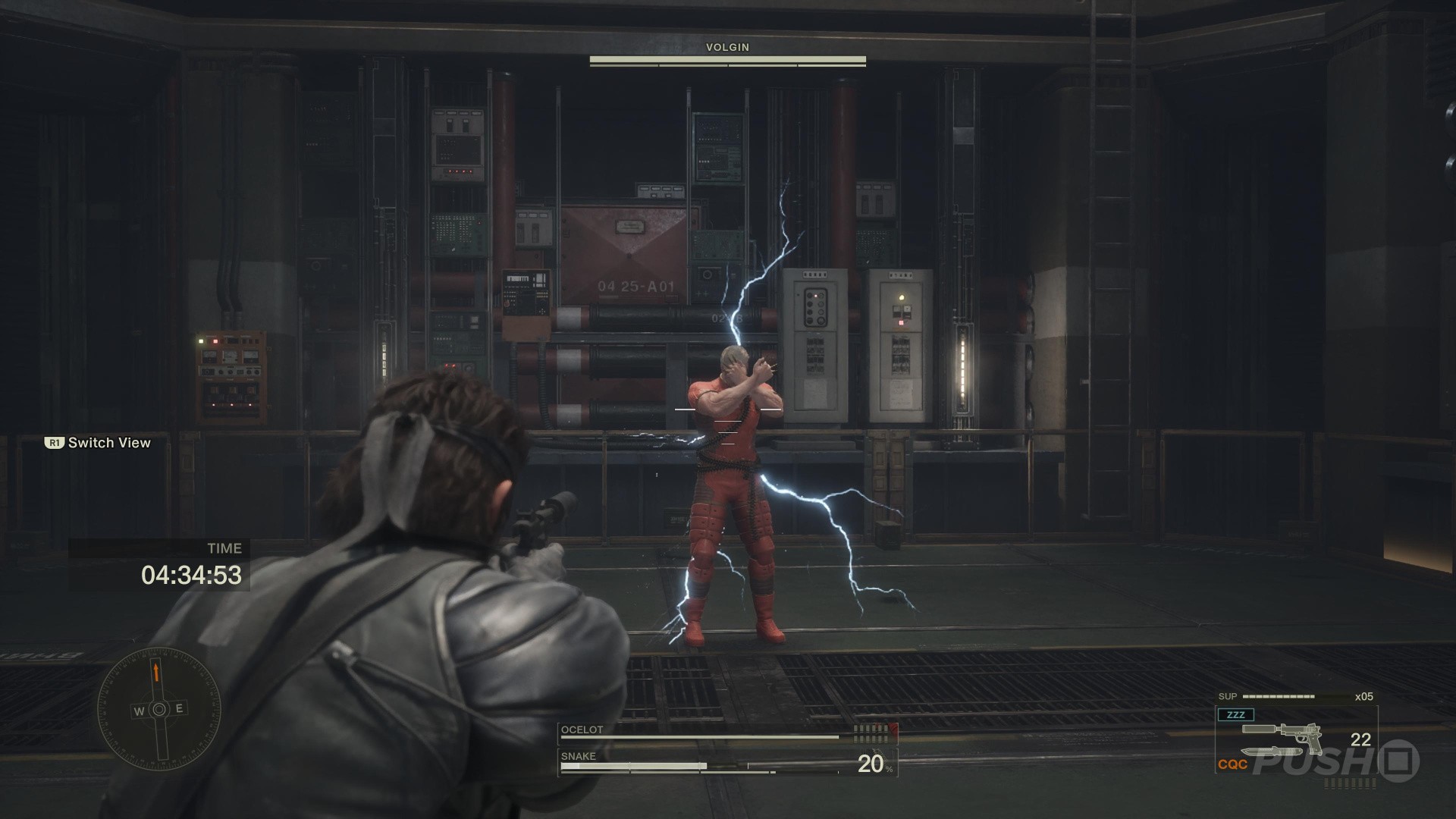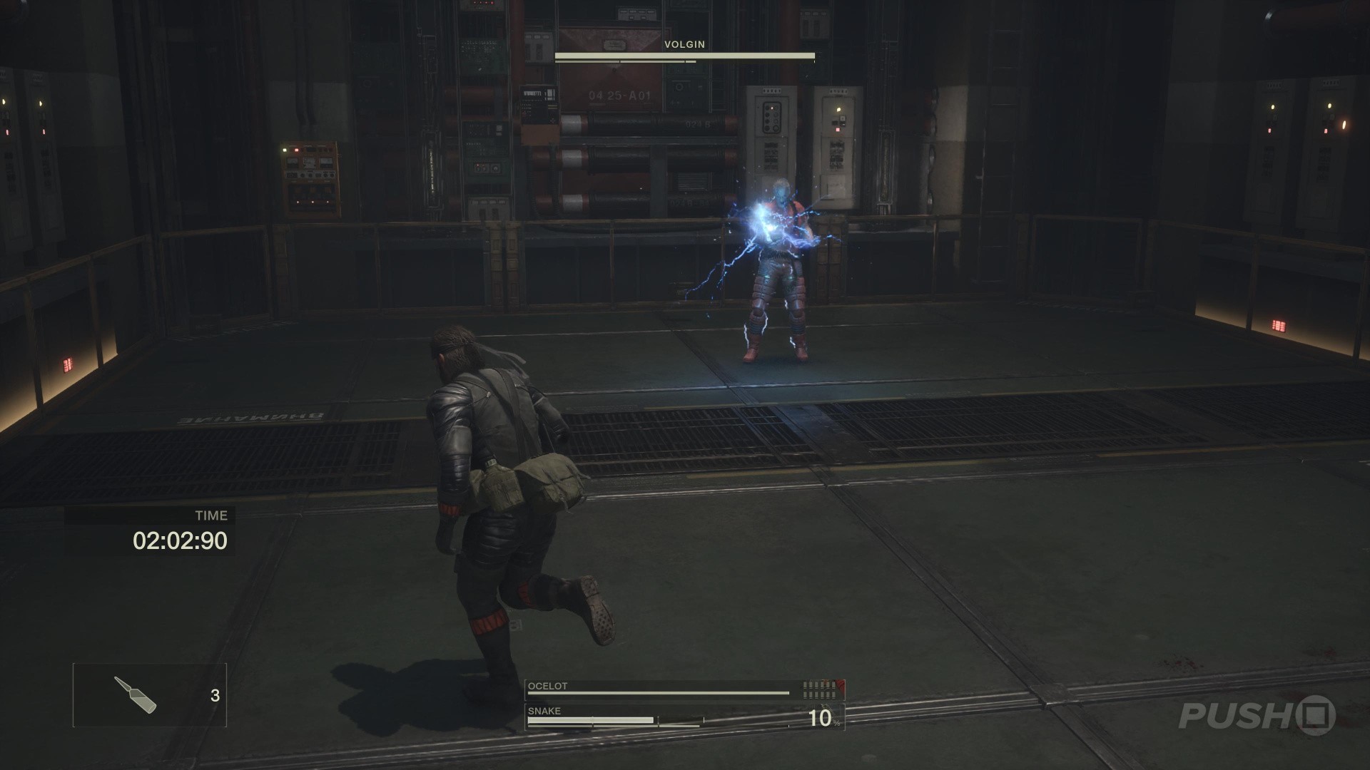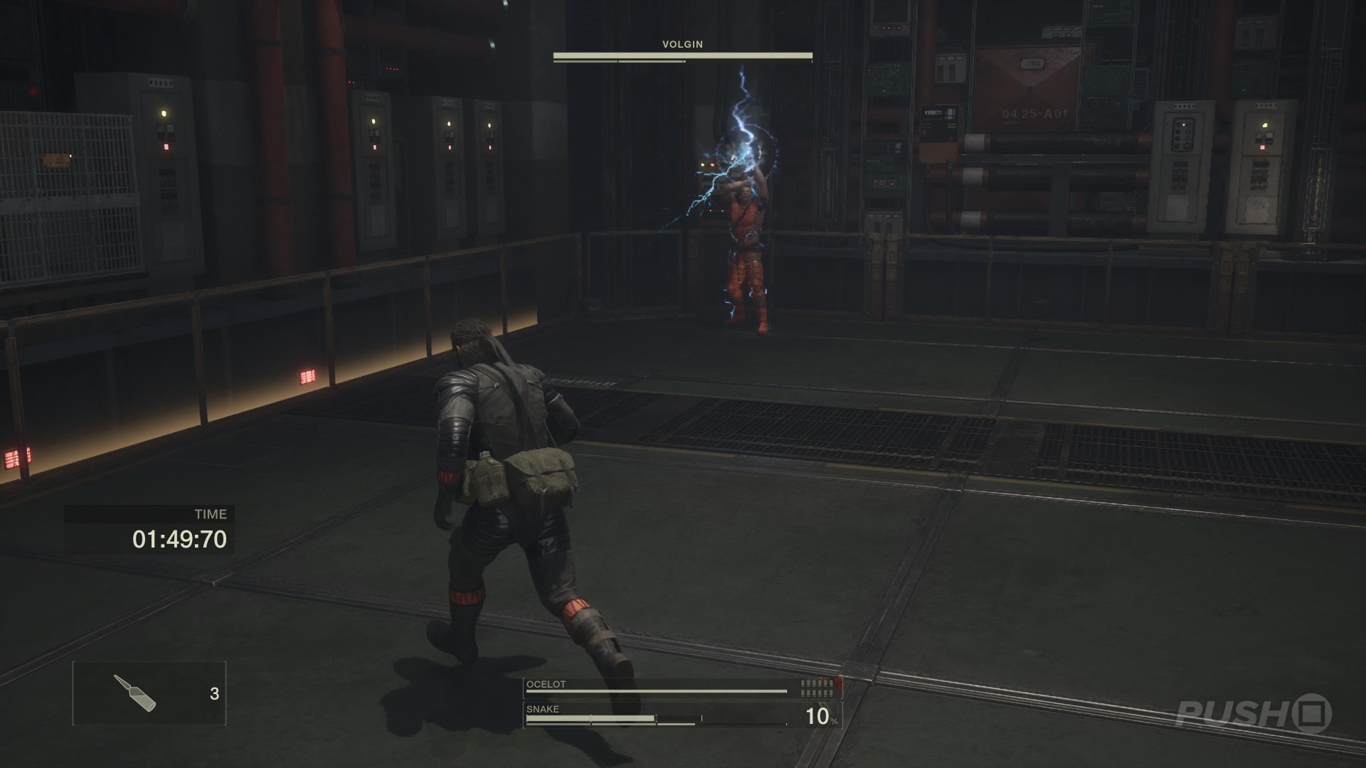 When Volgin reaches half health (either through damage or stamina), a cutscene will play and Ocelot will leave the fight. During this second phase, Volgin gains new attacks, like a lightning explosion and doubling up on his standard electrical beams. This can again be avoided by either crouching down fully or running away from their damage paths.
