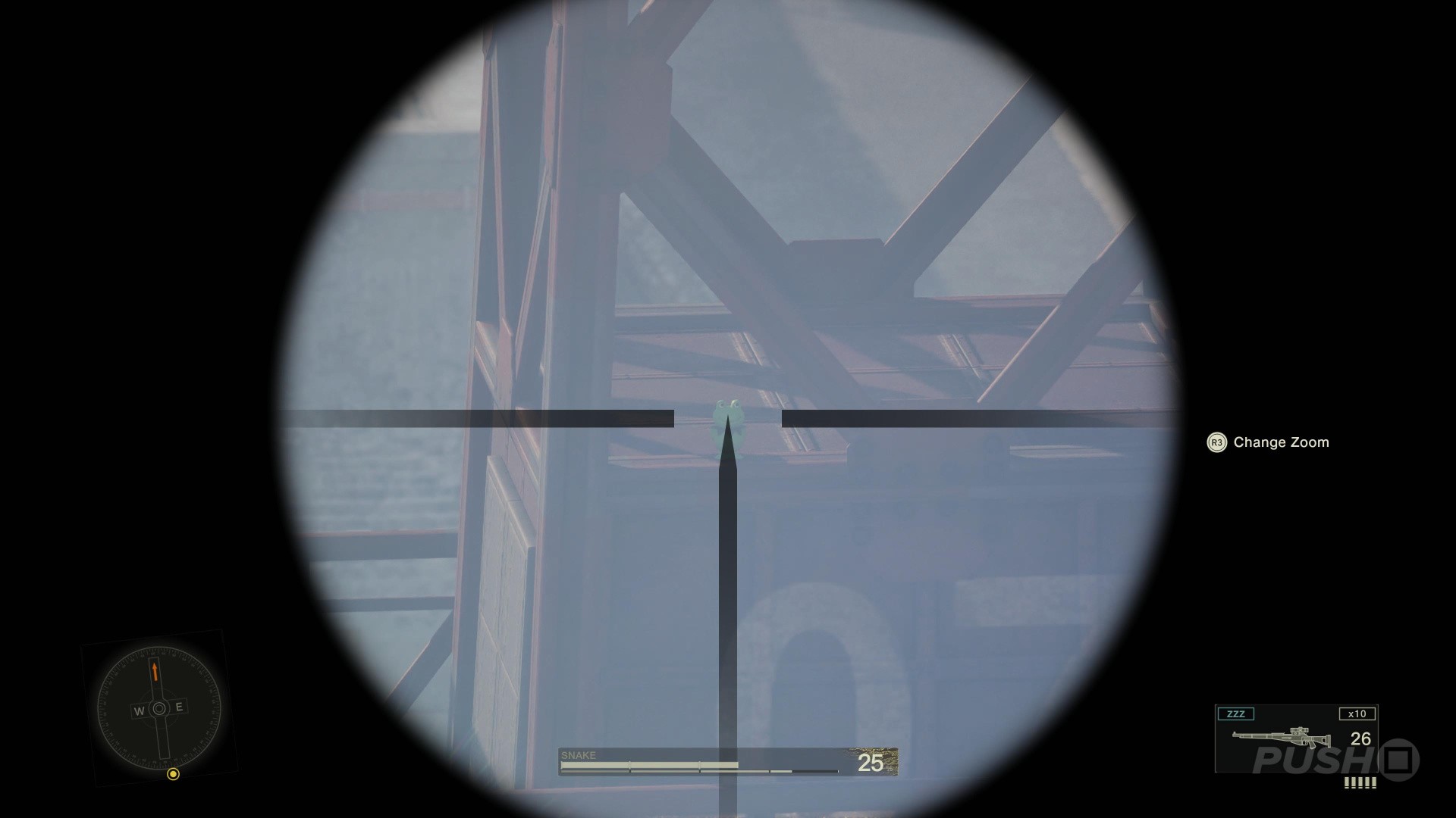 - Equip a sniper rifle and look at the large tower in front of you, with the number "07" on it