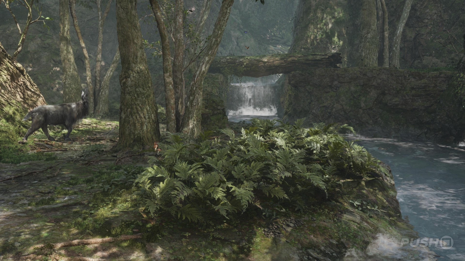 - Stand in front of the waterfall and look up to where the green vines are on its left side