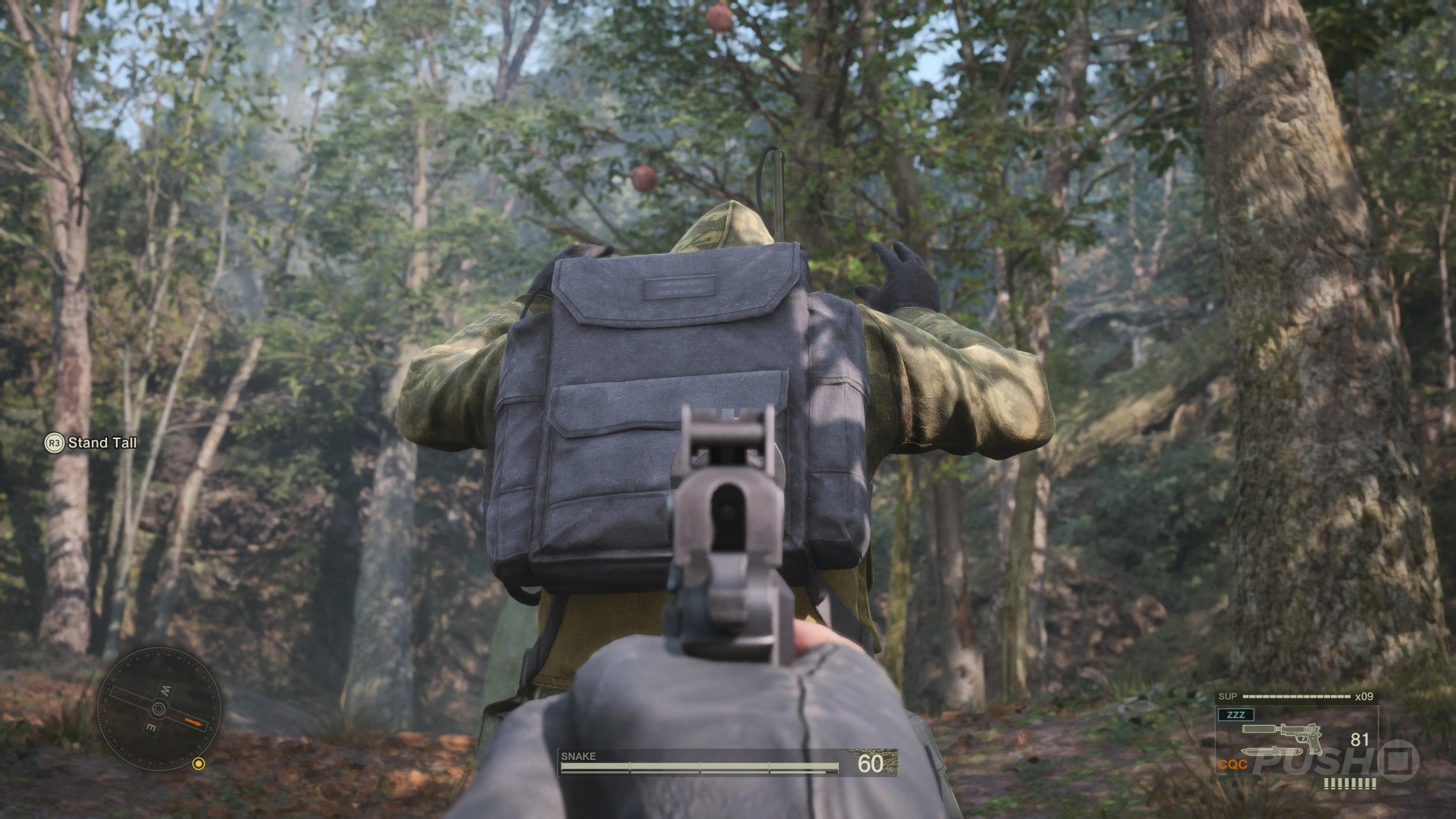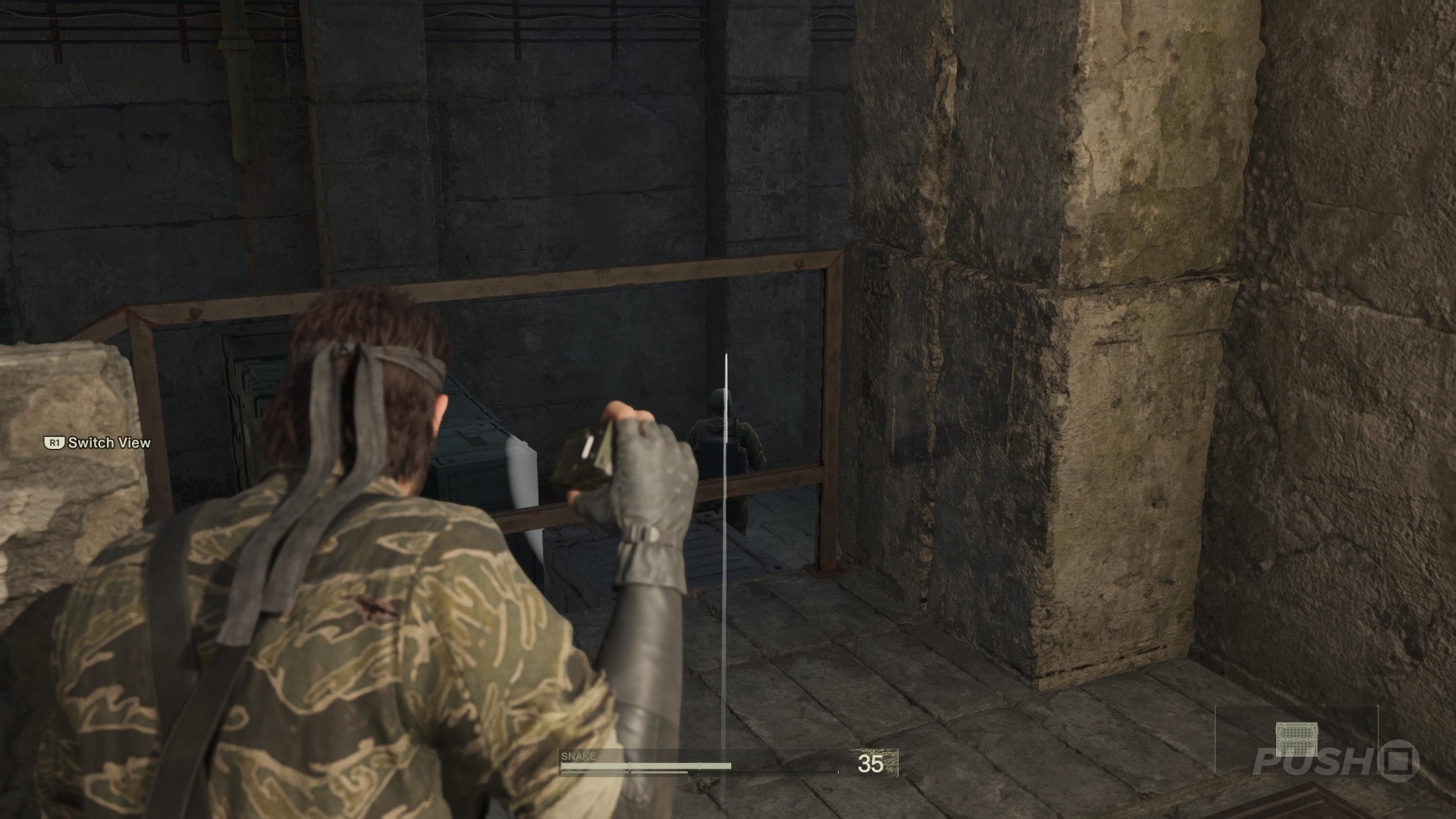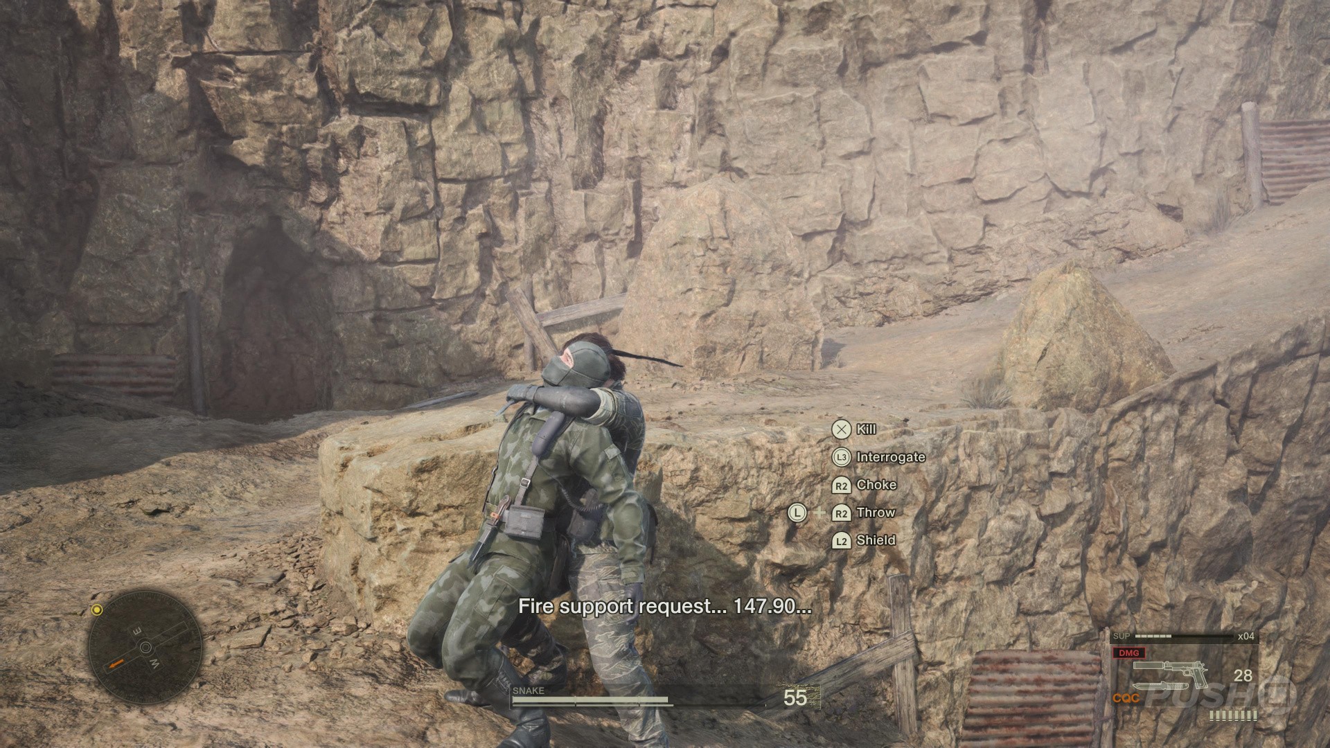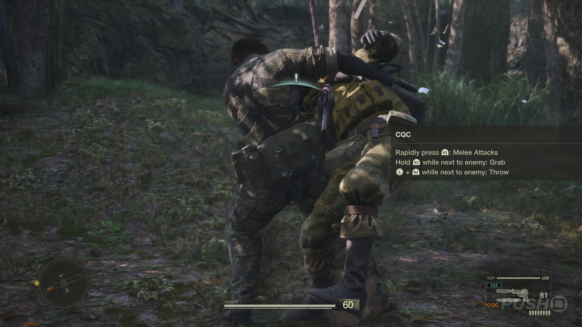 - This is done by sneaking up behind a guard and holding R2 when the button prompt appears, and pointing the left thumbstick in any direction. Snake will perform the CQC slam and knock the guard out.