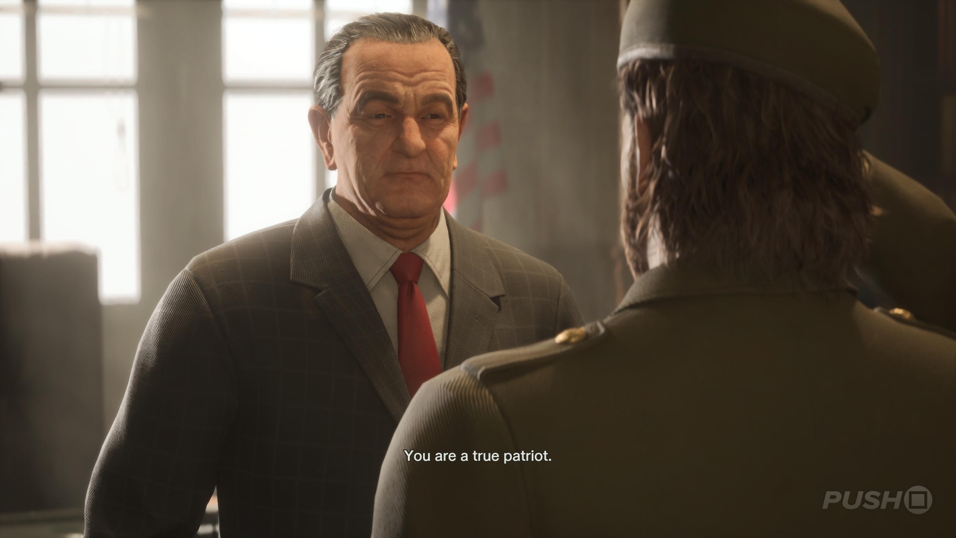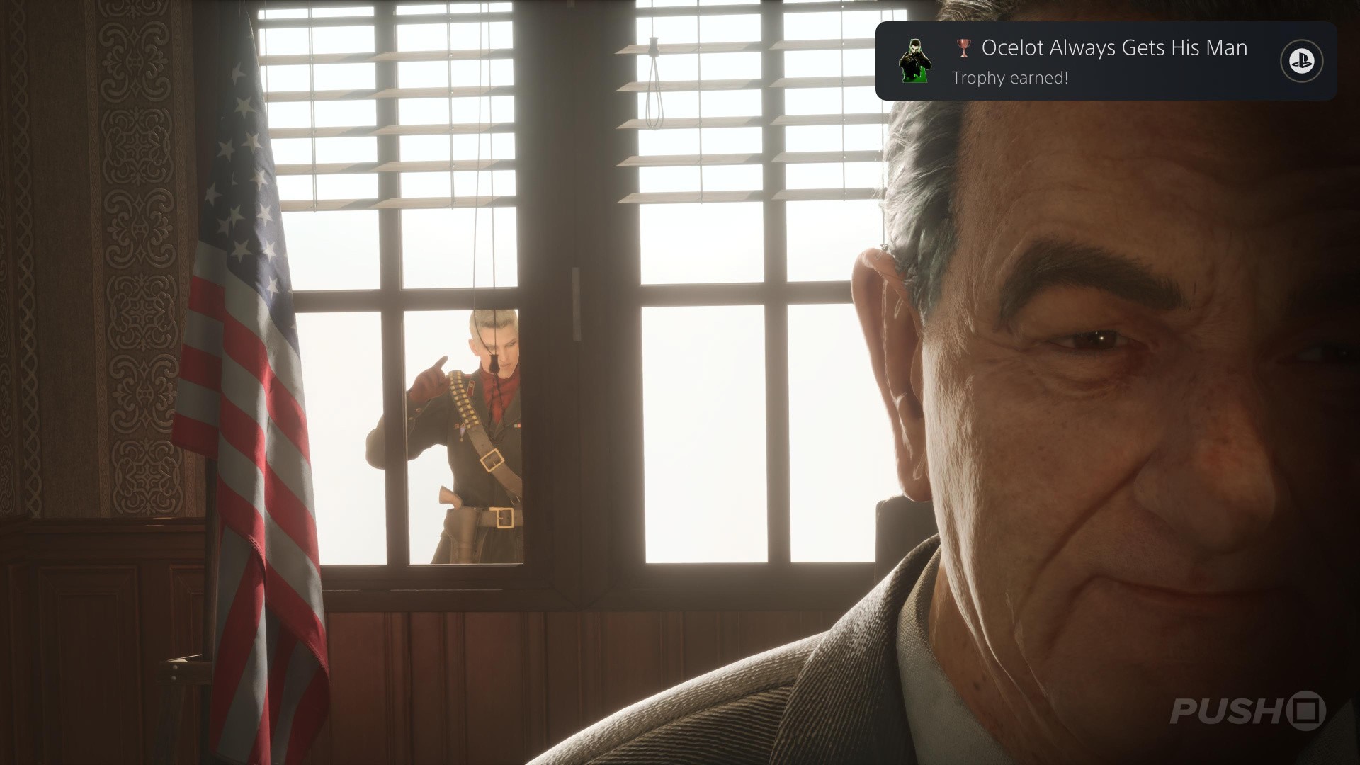 - During the final cutscene in the game, when Snake is in the president's office, you can go into first-person view and see Ocelot in the background. When Snake shakes the president's hand, he'll say: "You are a true patriot." At this point, hold down R1 and look to your left out the window. Ocelot will be there and the Trophy will unlock.