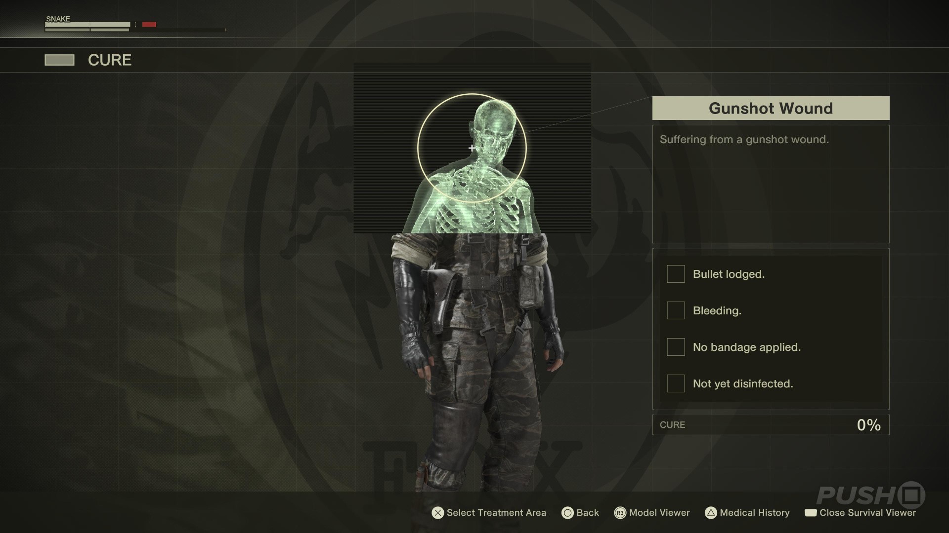 - To unlock this Trophy, you need to sustain damage from enemy gunfire. There's a slight element of randomness to this, but allow yourself to be spotted and then shot at. Keep on checking the Cure menu, and see if you sustain a bullet wound. Remove the bullet with your knife, and the Trophy is yours.