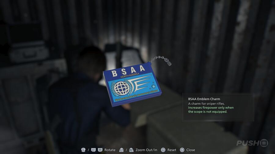 - Take a left and open the BSAA Container to find the BSAA Emblem Charm inside