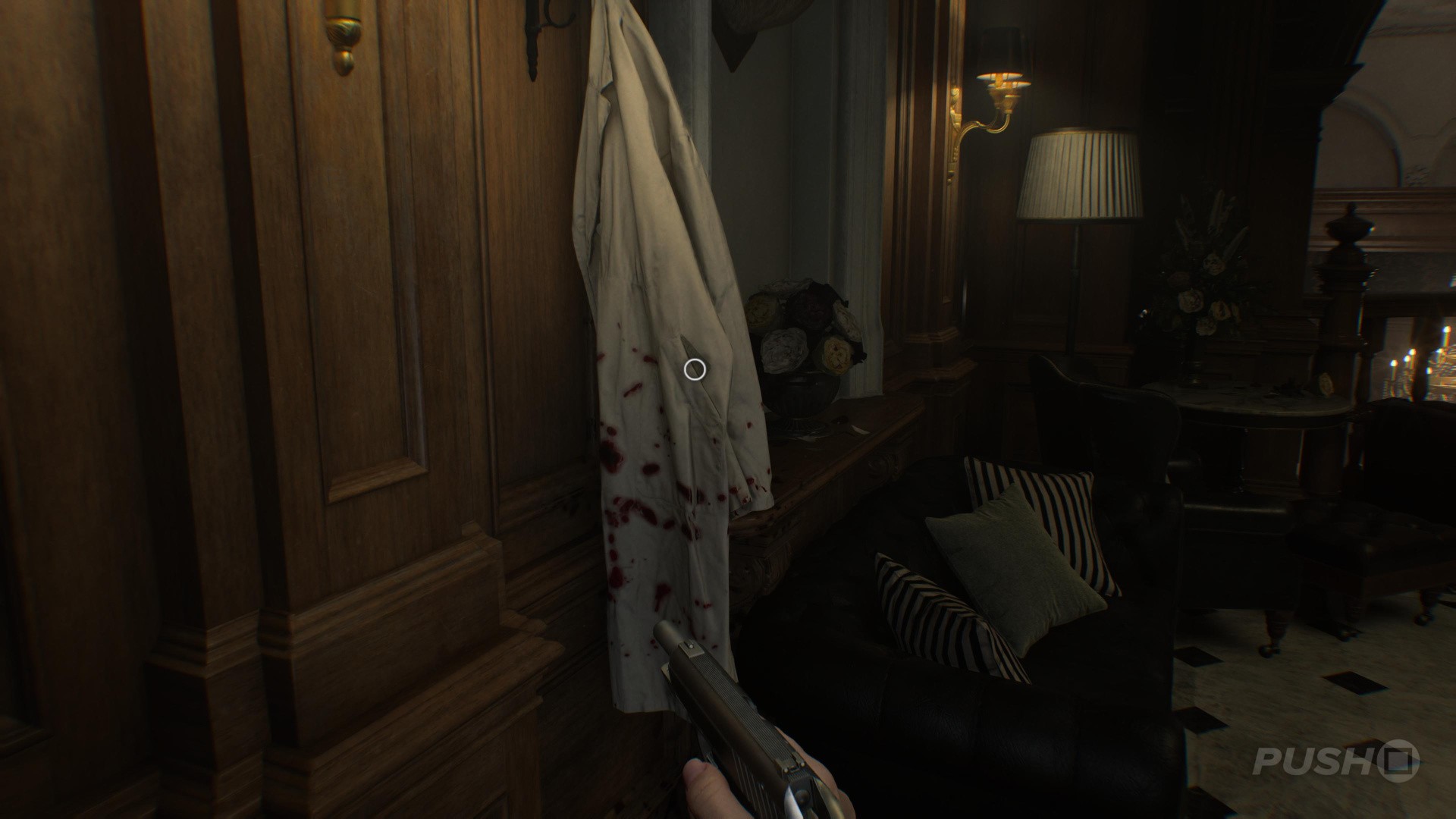 - In the Gallery area, look for the lab coat with blood splatters on it
