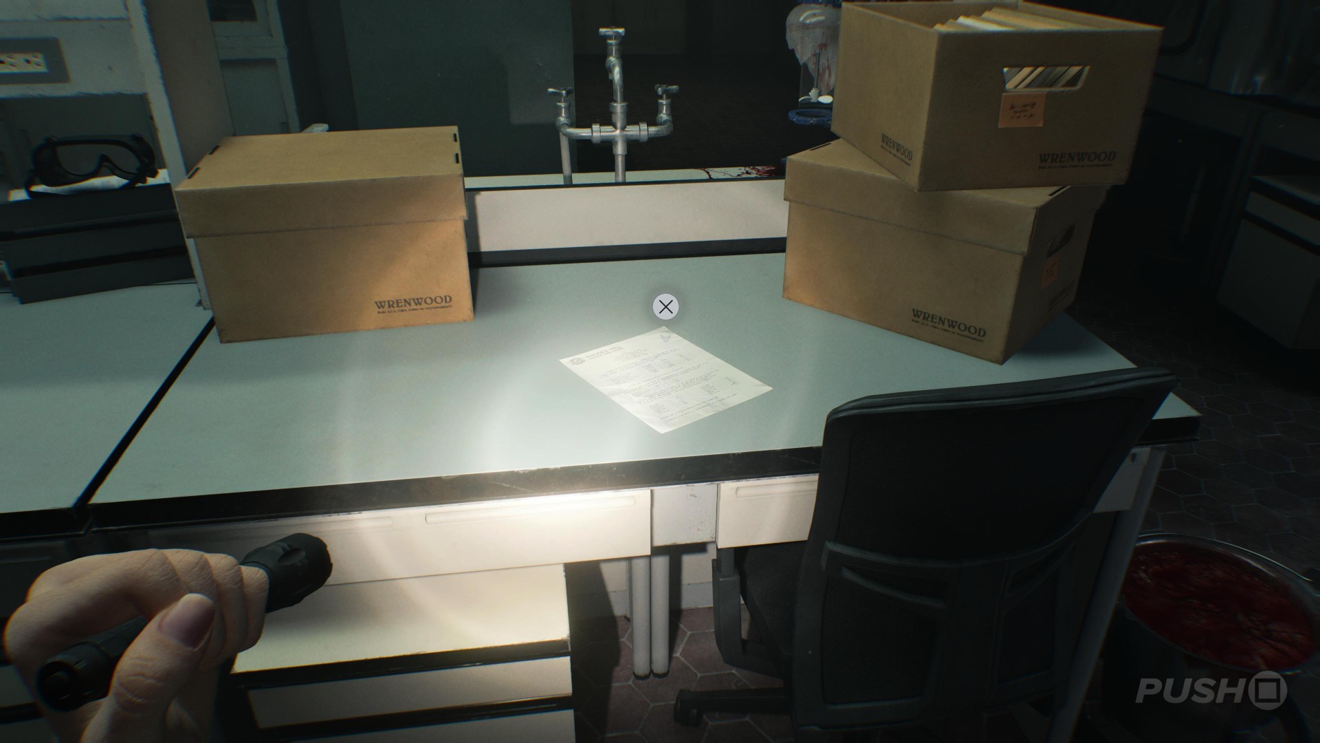 - On the table in the middle of the room, search where the brown boxes are to find the Blood Compound Synthesis