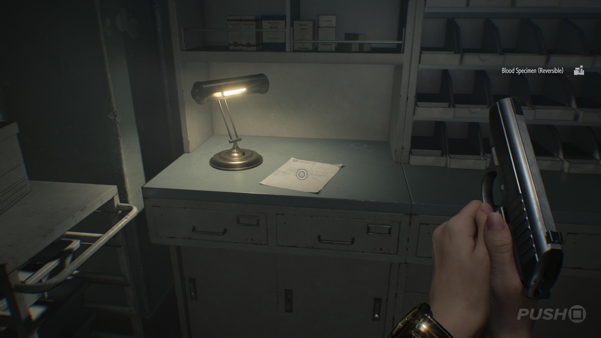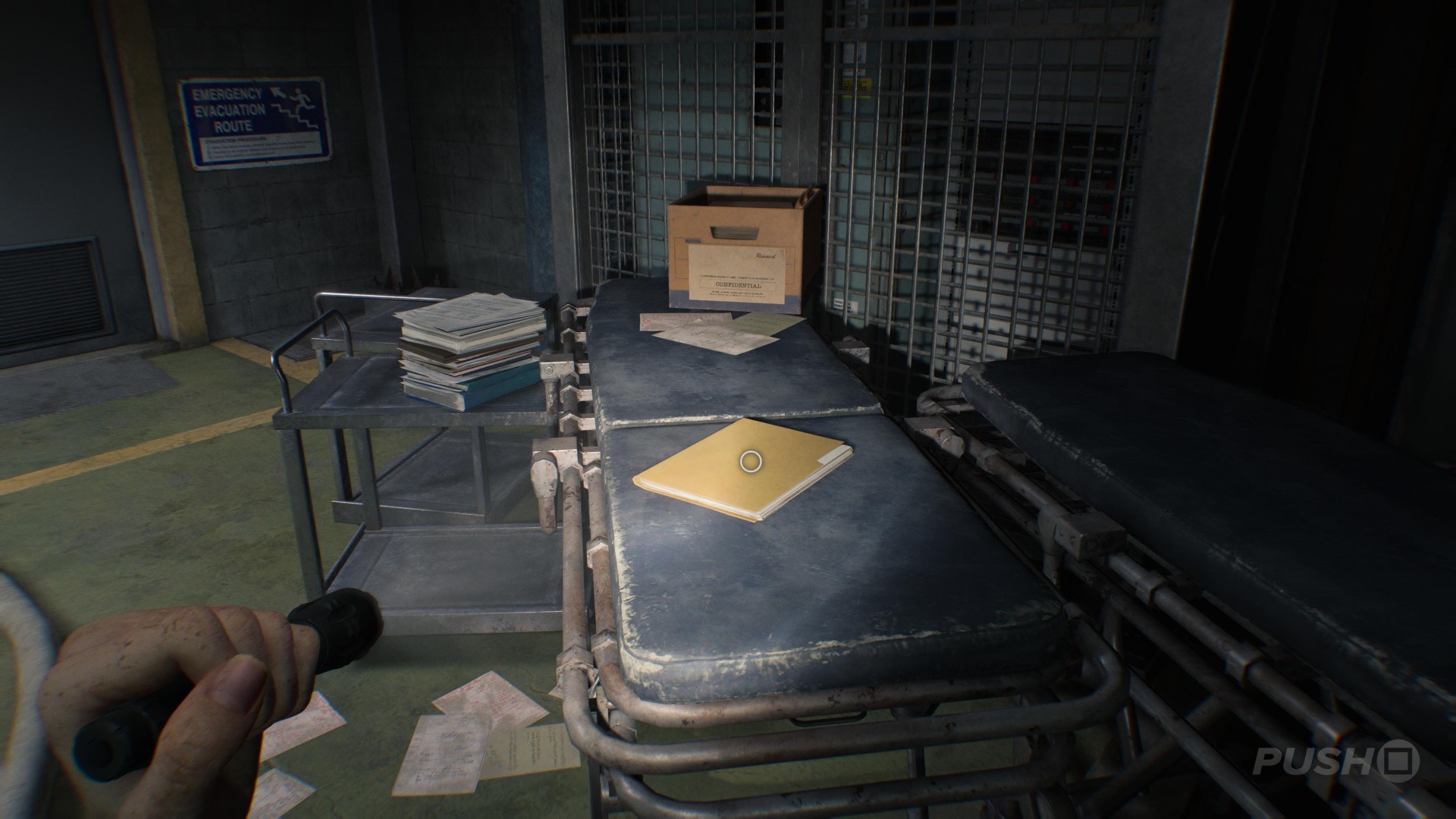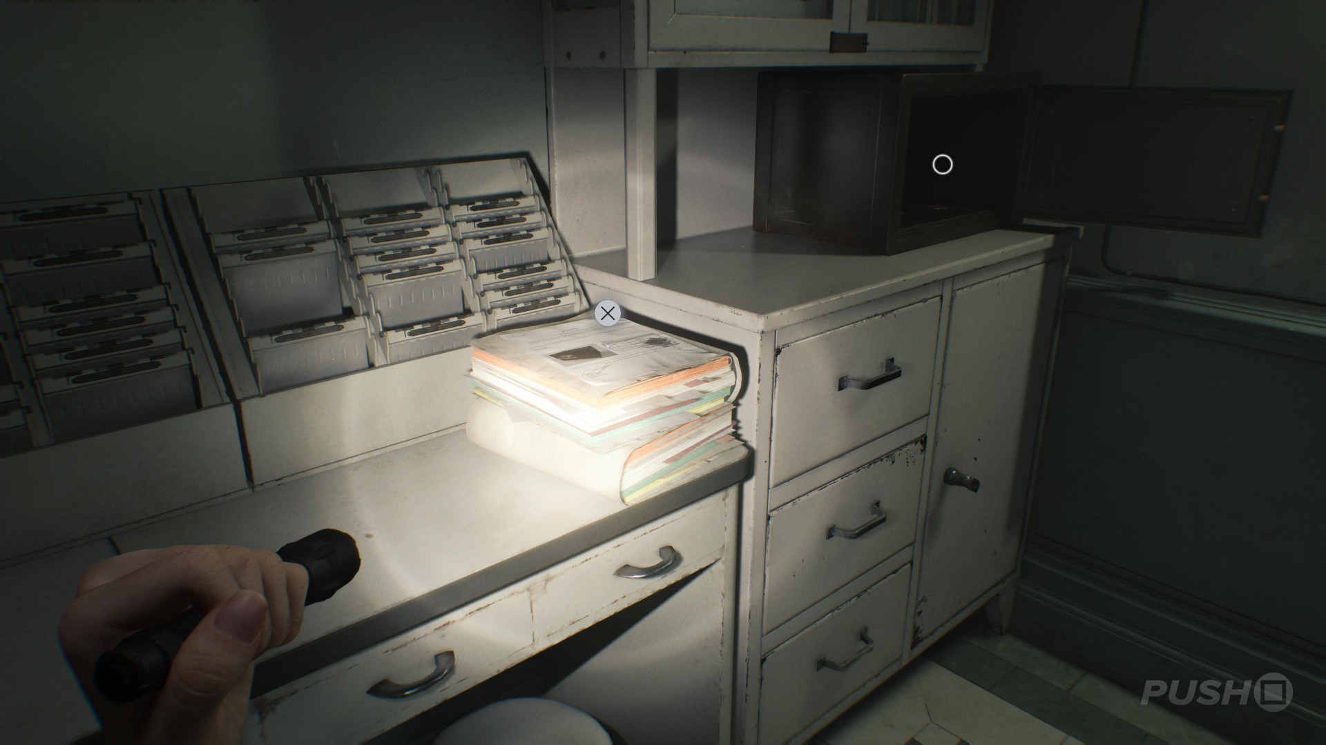 - Before doing so, look left to find the Satiey Suppression Medical Records on a desk