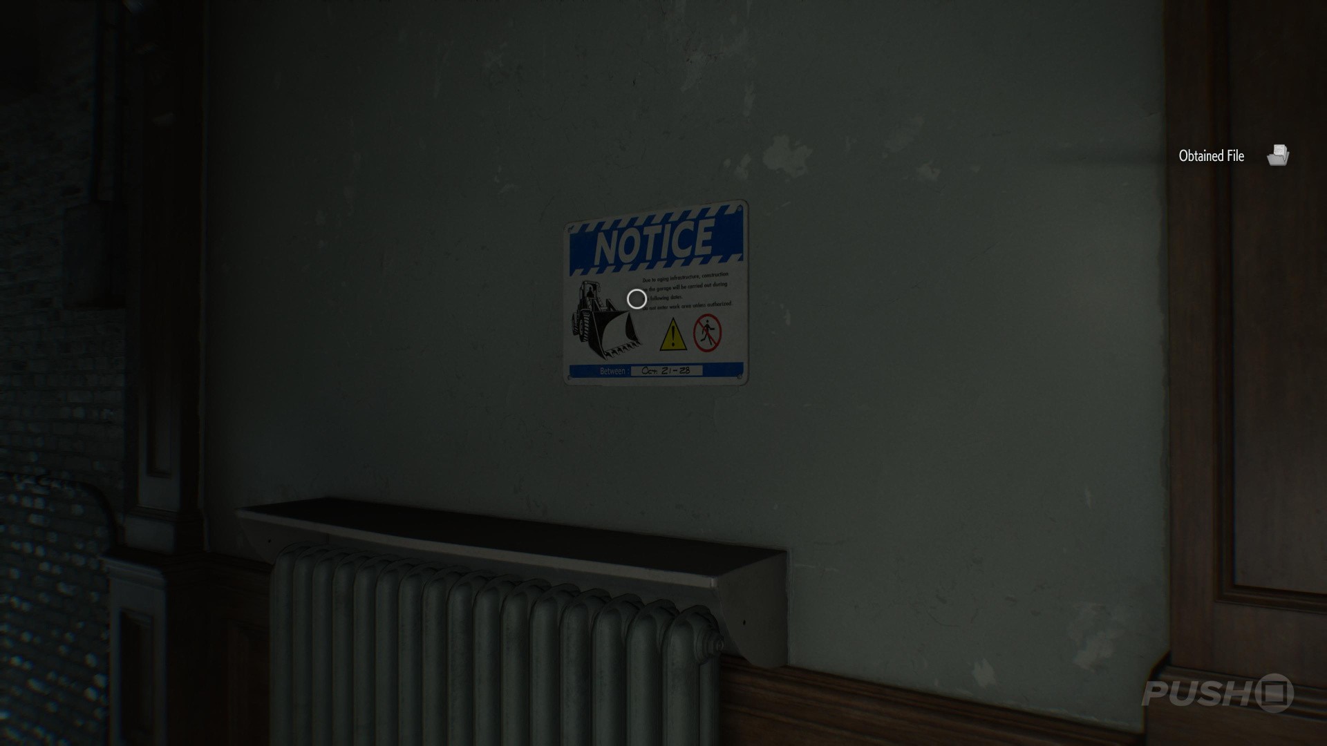 - Opposite the door to the Custodian's Office, out in the hallway, interact with the Construction Notice on the wall