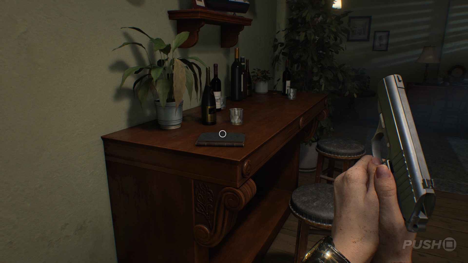 - When you leave Emily with Harry at the Helipad, enter the house and pick the Visitor Record up off the cabinet with wine bottles on it