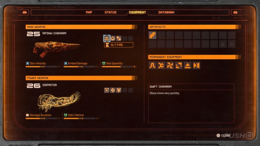Here, you can see which Main Weapon you're holding, as well as which attributes it aligns with, its alt-fire mode, and all its Traits.