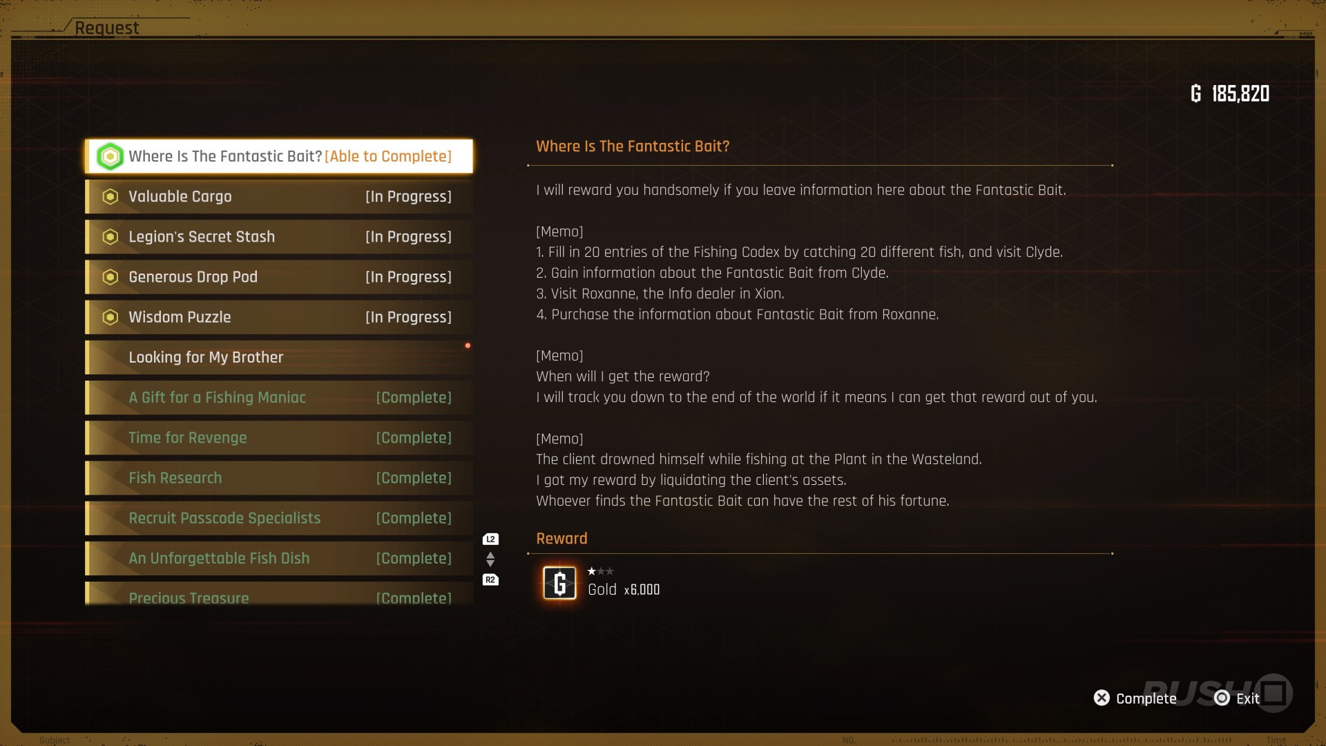 In order to complete Where Is the Fantastic Bait? , you'll first need to fill your Data Bank with the information on 20 different fish. You can follow this guide for all fishing spot locations, the best bait to use, and where to find certain species. Once you've got 20, visit Clyde in the Great Desert and ask him About the Fantastic Bait . You'll then be able to visit Roxanne in Xion and purchase Information: Fantastic Bait .