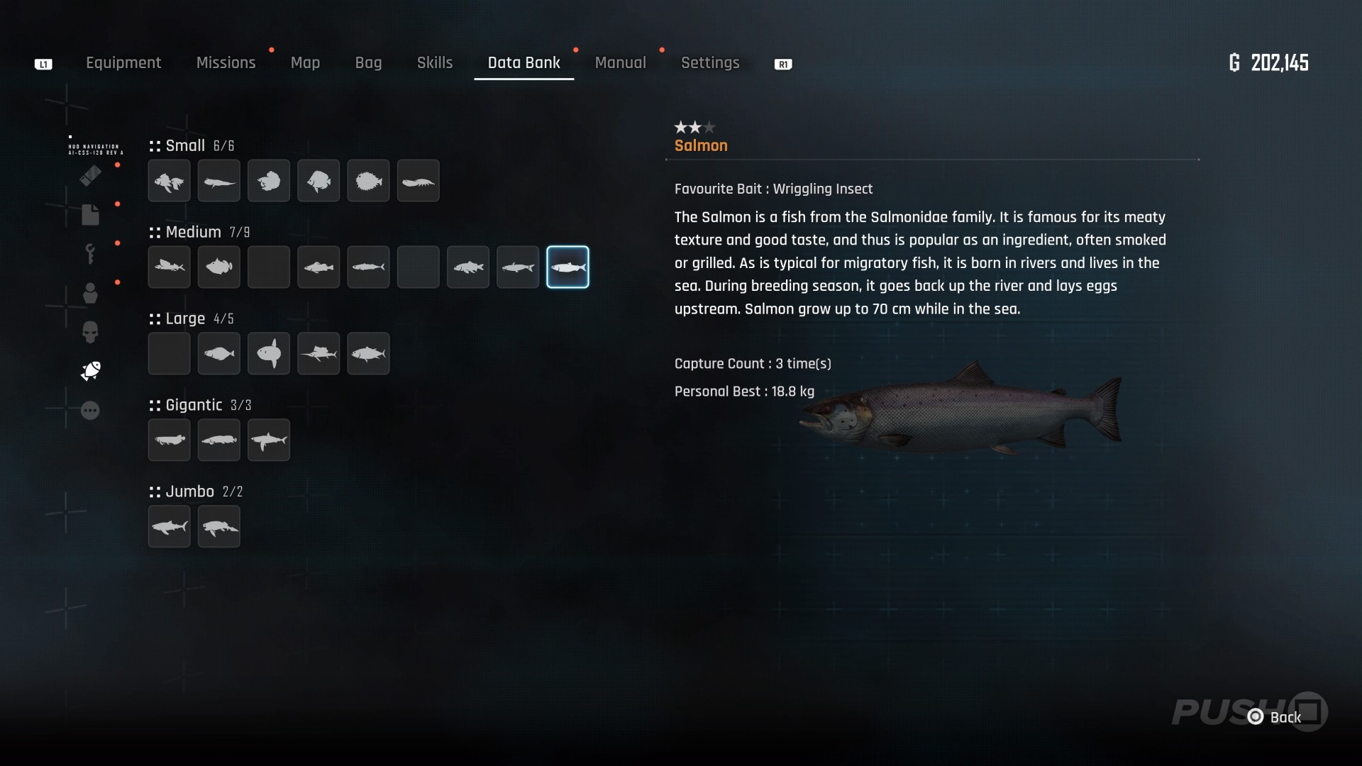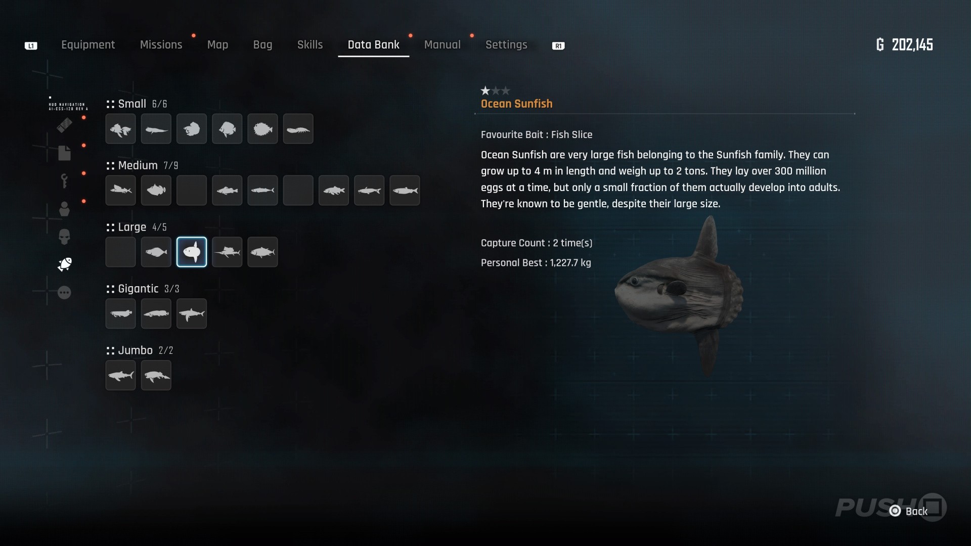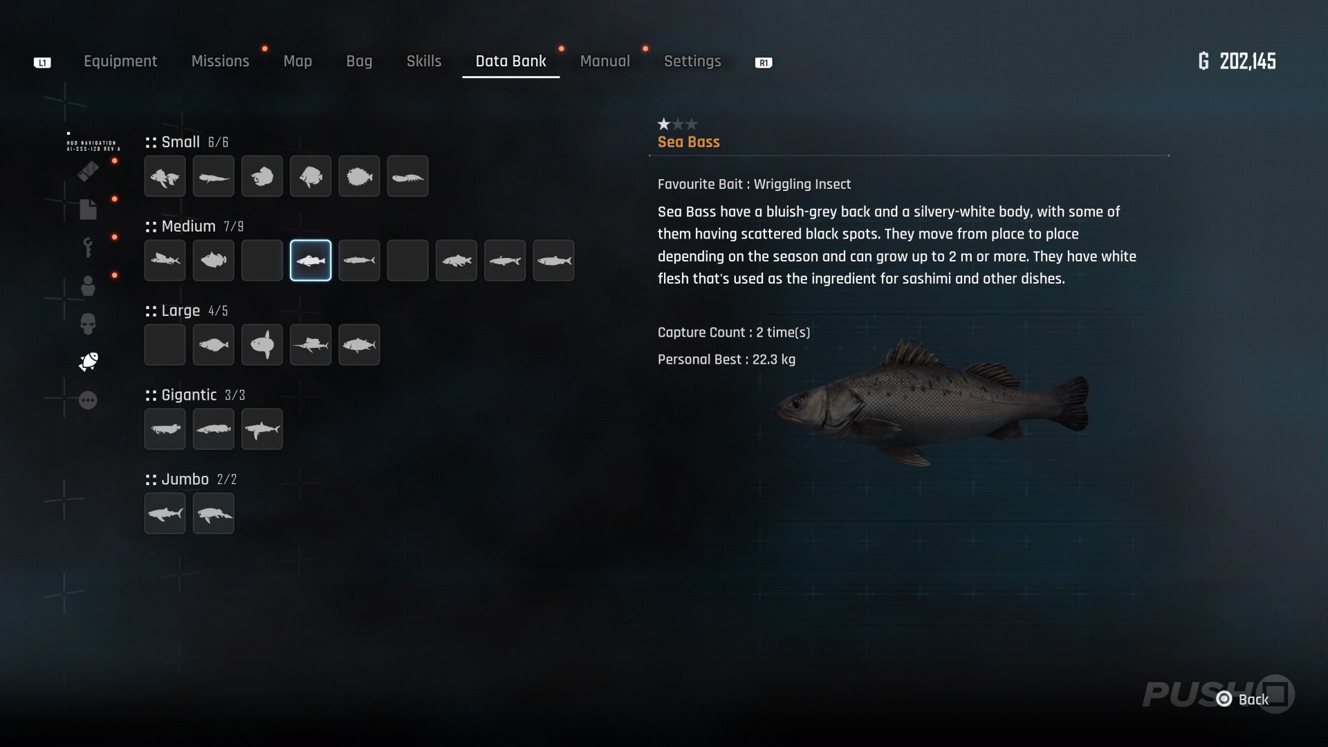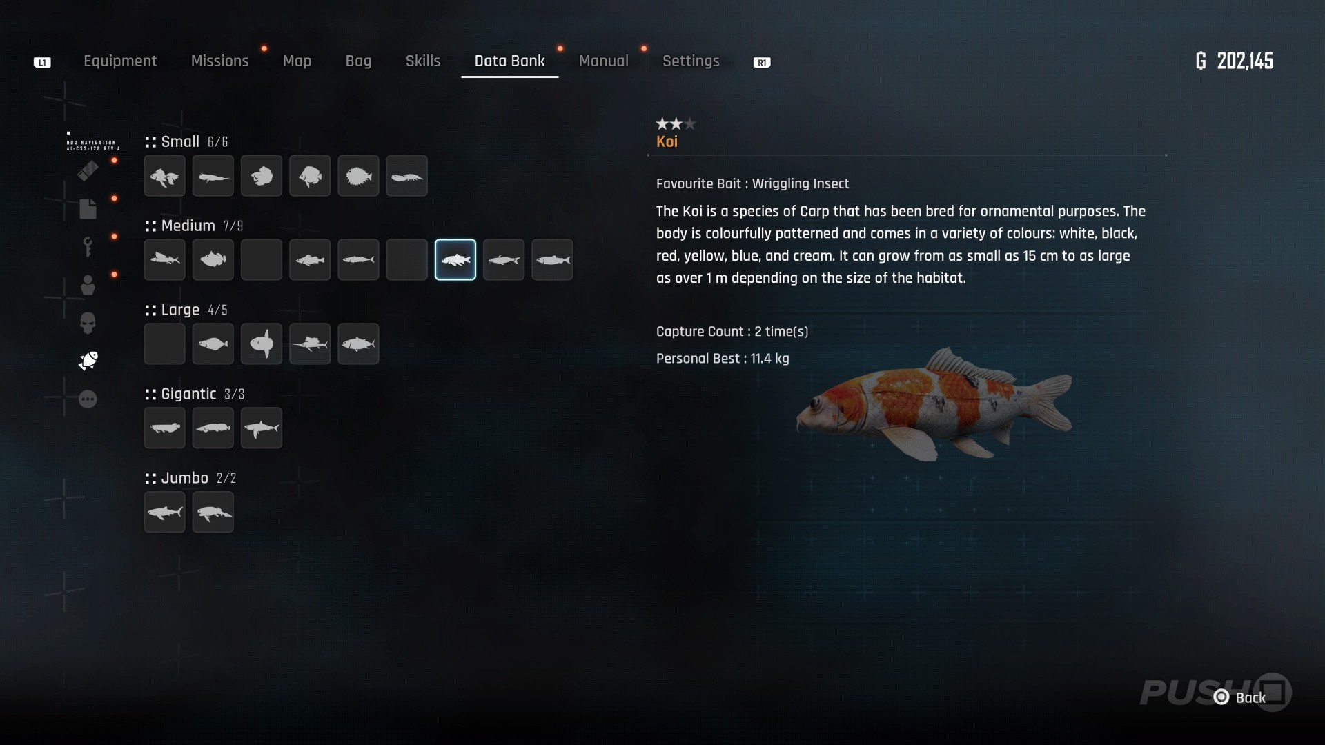 Fish are divided into the following categories: Small , Medium , Large , Gigantic , and Jumbo . The type of bait you use as well as the fishing spot location you select will influence the type of fish you can catch. Below we've listed all fish locations and how to catch them.