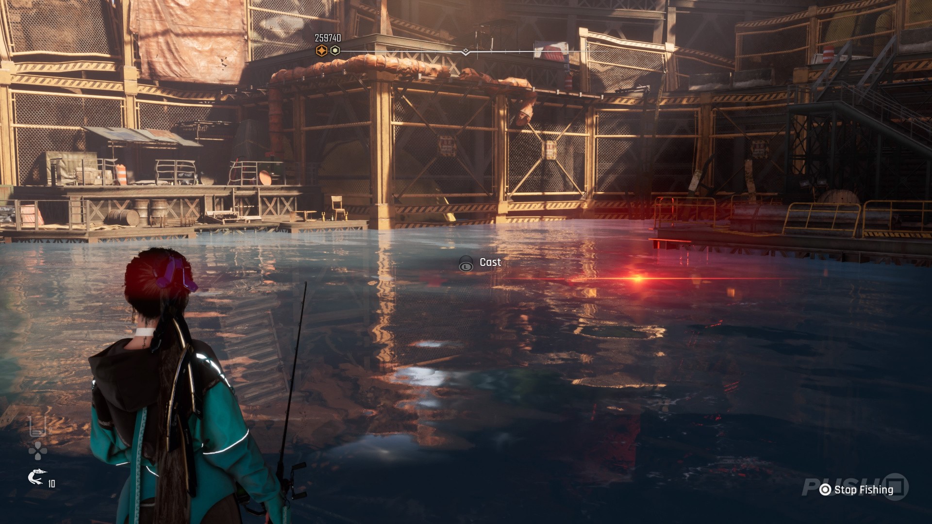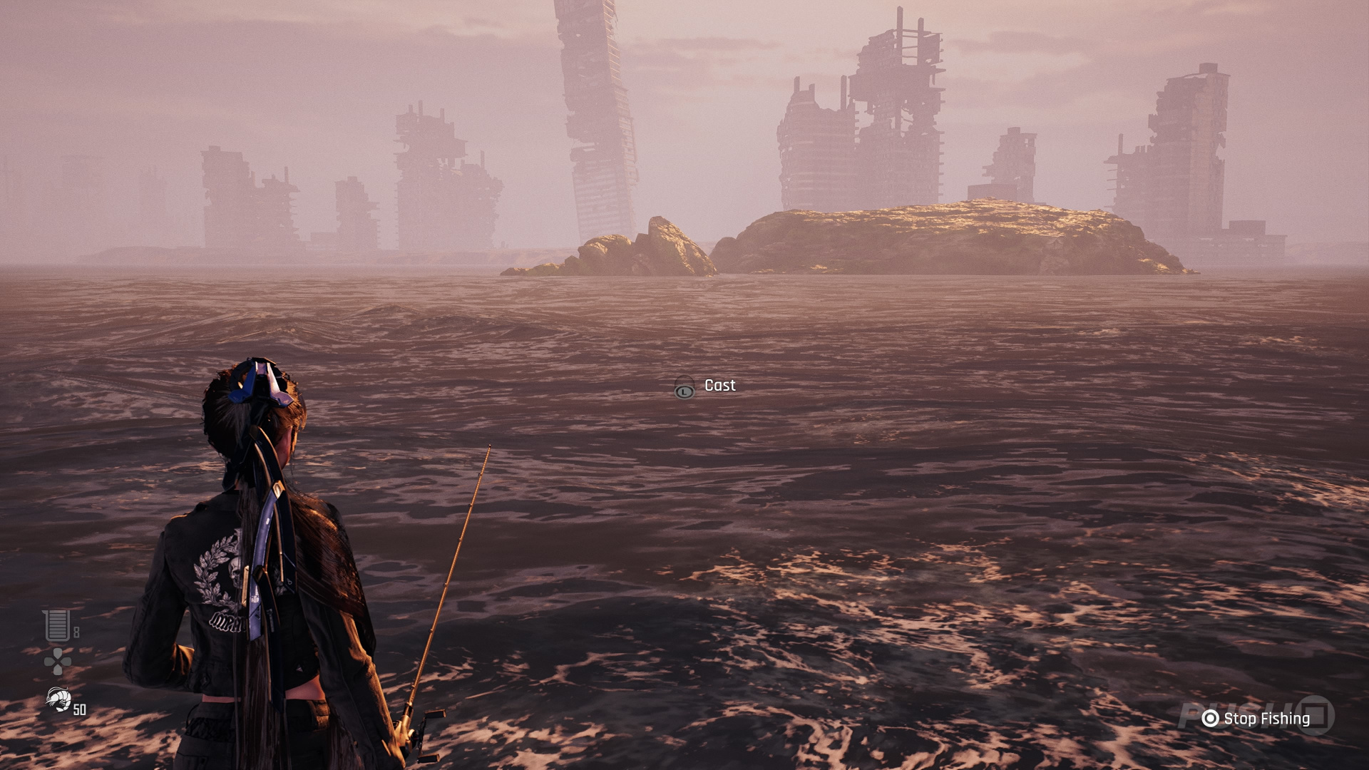 At the very end of Eidos 9 , once you've ridden all the red slides to the Lily's Atelier , you can fish in the choppy water surrounding the island.